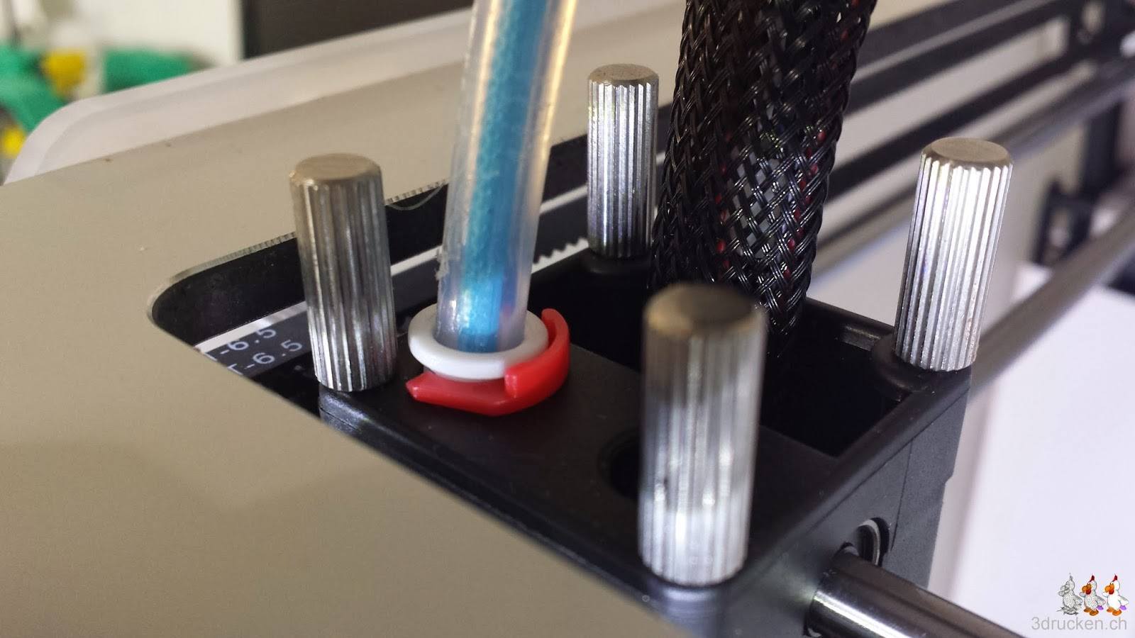 Es gibt zwei Punkte, die uns am Ultimaker 2, den wir geliefert bekommen haben nicht ganz gefallen. Immerhin ist es nicht die Druckqualität…Erstens scheint die Bowden Tube beim Transport, aus der Fixierung gefahren zu sein, wie man auf dem ersten Bild unten sieht, oder aber die Feststellklammer hält sie nicht genügend fest. Sicher haben uns die mehrfachen, kleinen Einkerbungen an der Tube oberhalb des Druckkopfs gemacht, welche wir vom Ultimaker Original her schon kannten. Sie sind im zweiten Bild leider nur schlecht erkennbar. Wir müssen wohl versuchen, die Tube wieder ganz bis zum Druckkopf vorzuschieben, und das Spiel bei der Feststellklammer zu beseitigen. Noch ist nicht ganz klar, ob wir da selber Hand anlegen sollen, oder auf den Bescheid des Supports warten.