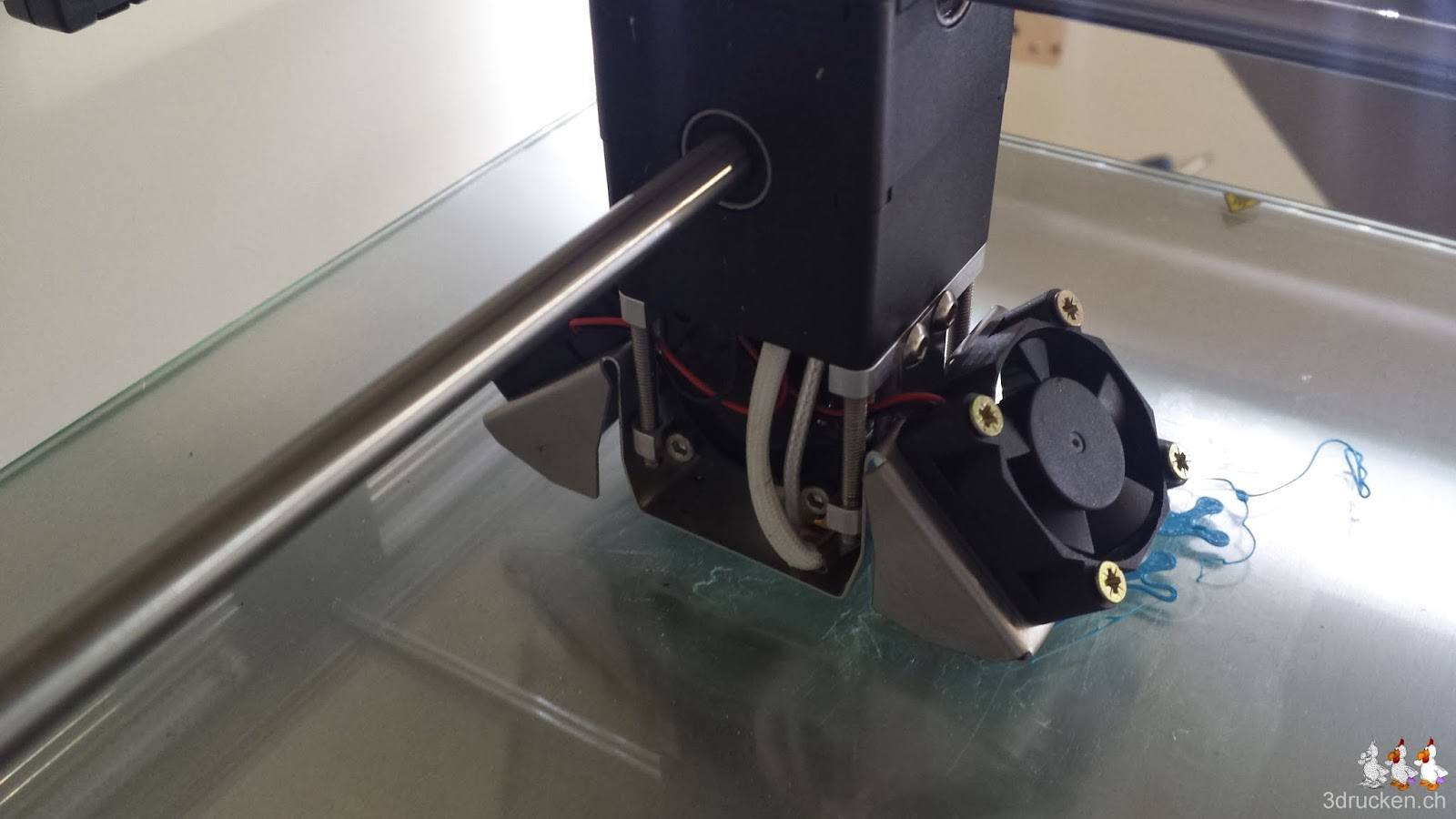 Zweitens befindet sich beim genaueren Betrachten auf der Rückseite des Druckkopfs ein dritter kleiner Lüfter, über welchen die Stromkabel der beiden anderen Lüfter frei verlaufen, ohne ein Gitter dazwischen. Dies führt bei etwas viel Zug auf dem schwarzen Kabelstrang dazu, dass die Stromkabel der beiden Seitenlüfter zu nahe an den hinteren Lüfter herangezogen werden. Hier wäre ein kleines Lüftergitter für den hinteren Lüfter, oder eine verbesserte Kabelführung für die Kabel der beiden Seitenlüfter von Vorteil.