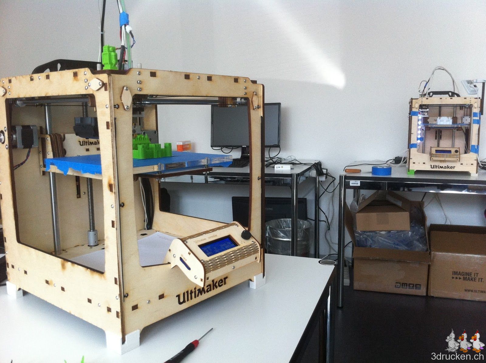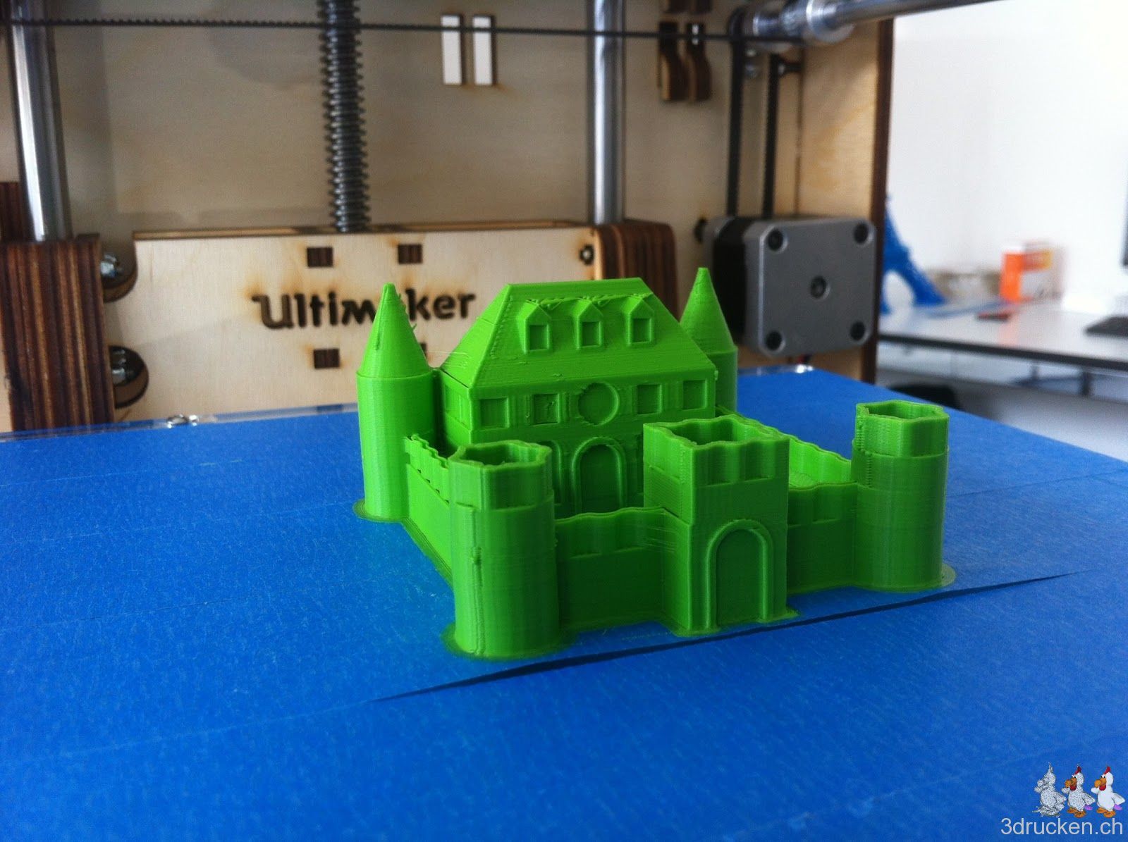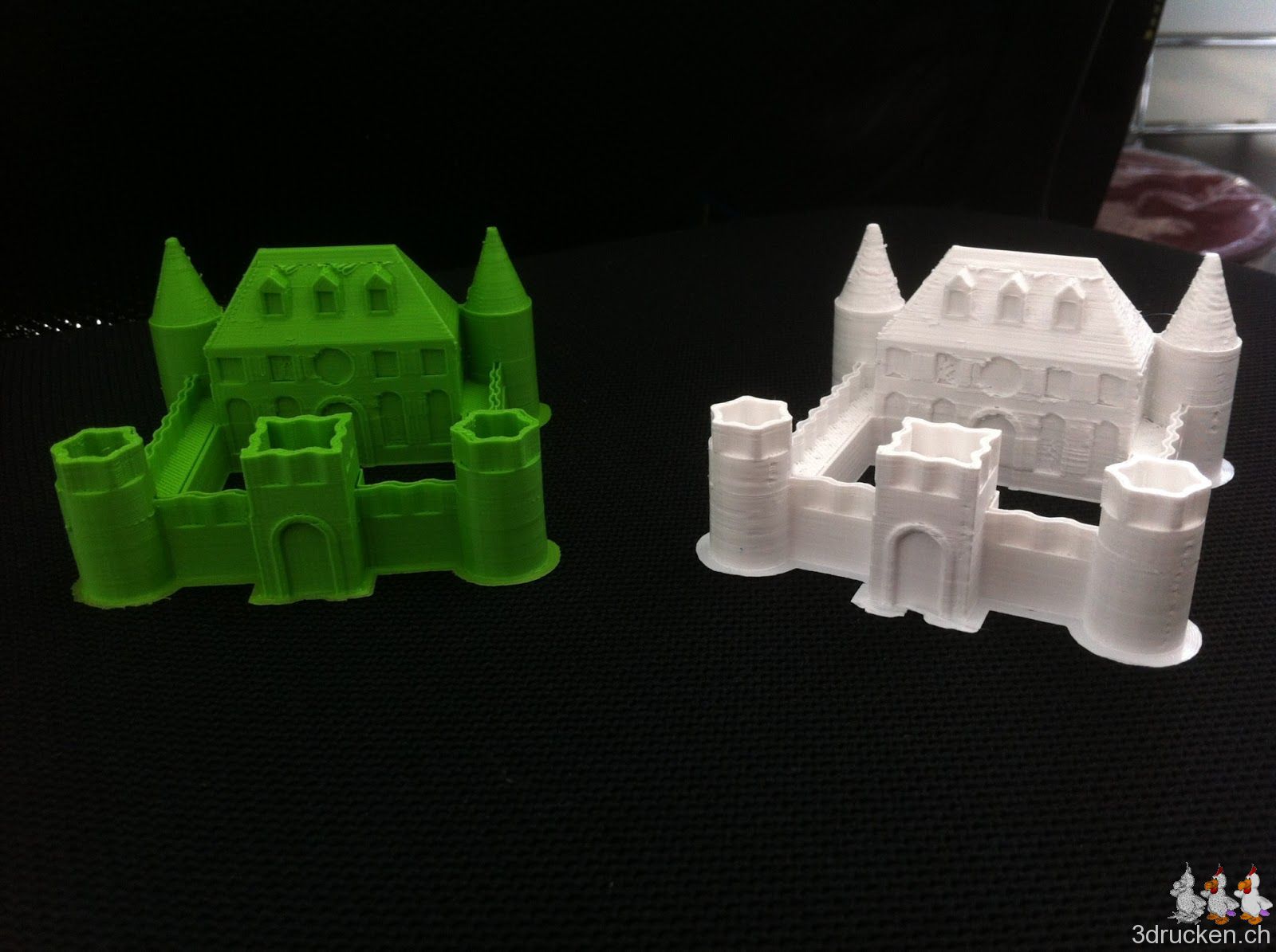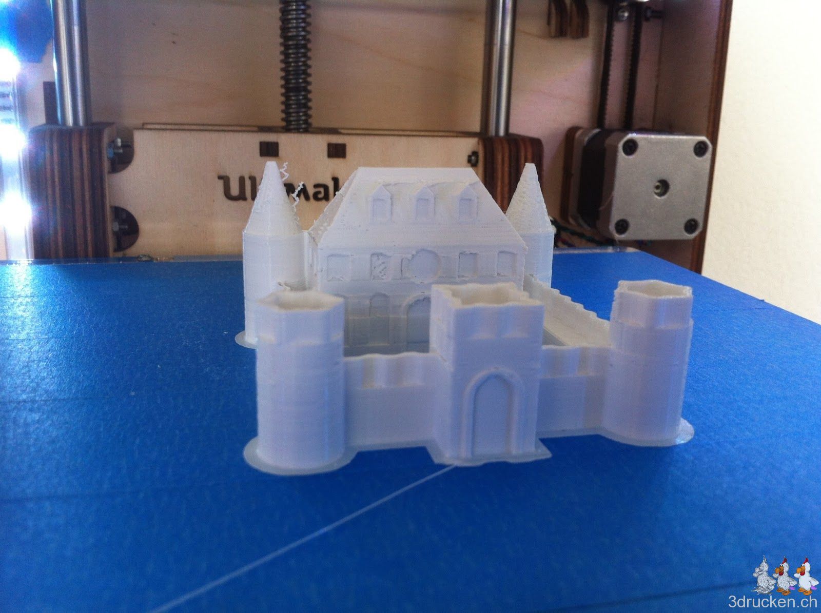 Heute gaben wir ein Schloss, heruntergeladen bei Thingiverse in Auftrag. Und zwar beiden Ultimakern. Die beiden Drucker spornten einander zu Höchstleistungen an. Beim älteren Ultimaker liessen wir den Lüfter weg. Die Resultate waren beide ansprechend.