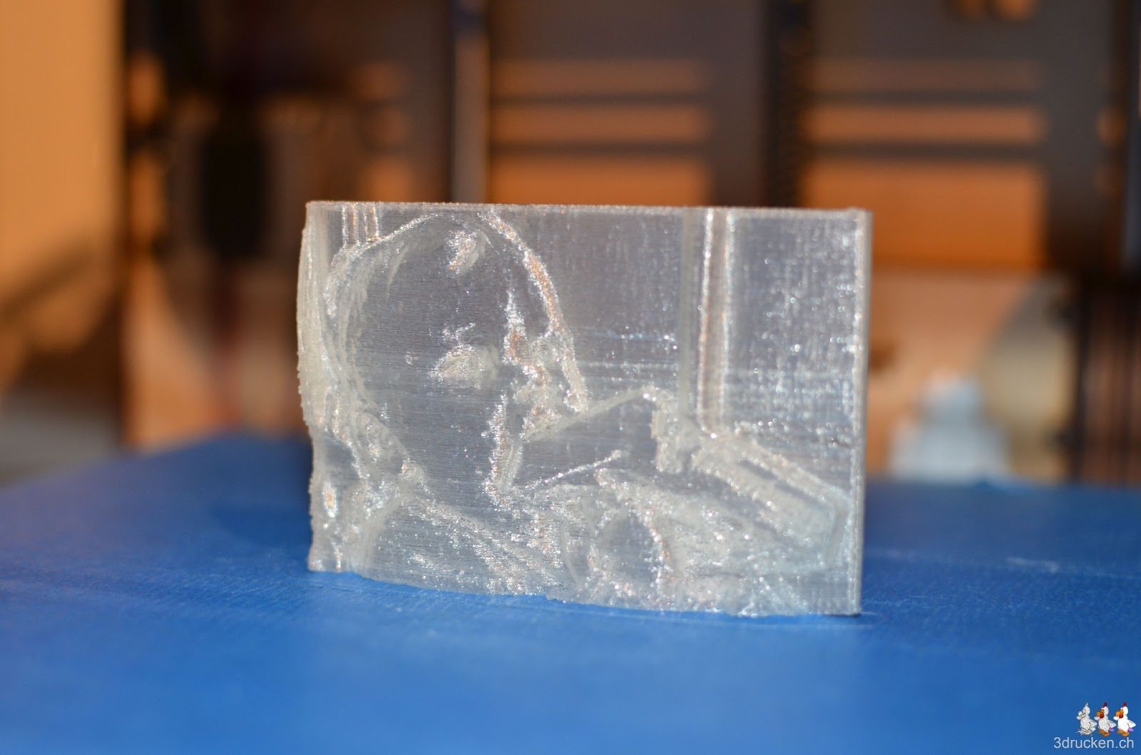 So zum Feierabend ausprobiert, den 2D Image to STL Converter. Ganz witzig, oder so. In 0.2 mm-Schichten und 0 % Füllung via OctoPrint in 48 min gedruckt. Transparentes PLA ist zur Zeit das Einzige, was wir zuhause rumliegen haben, vielleicht würde das in Farbe besser kommen?