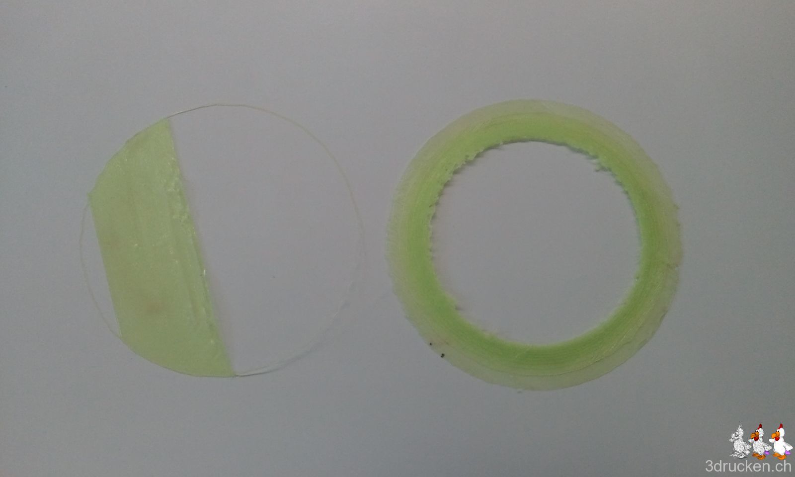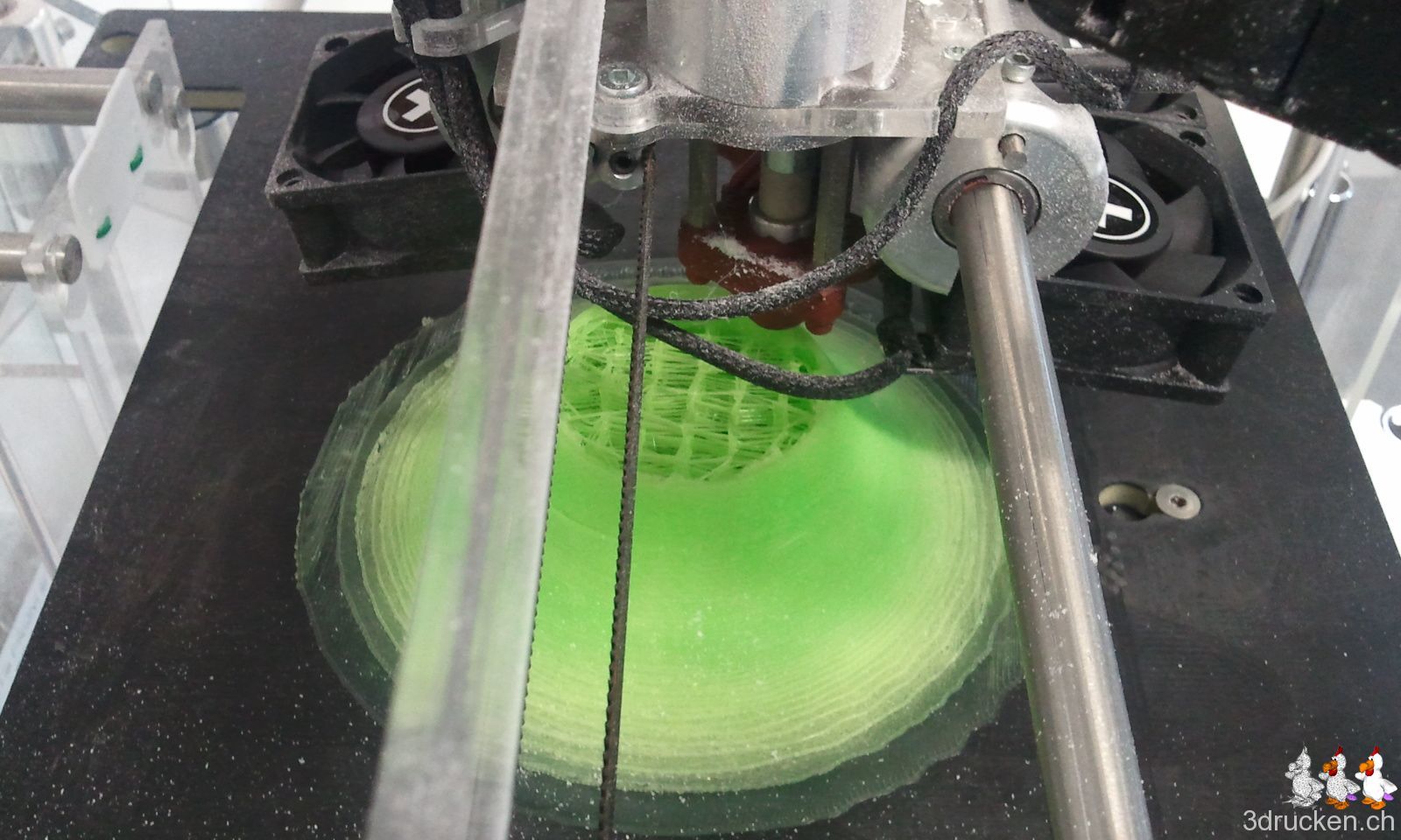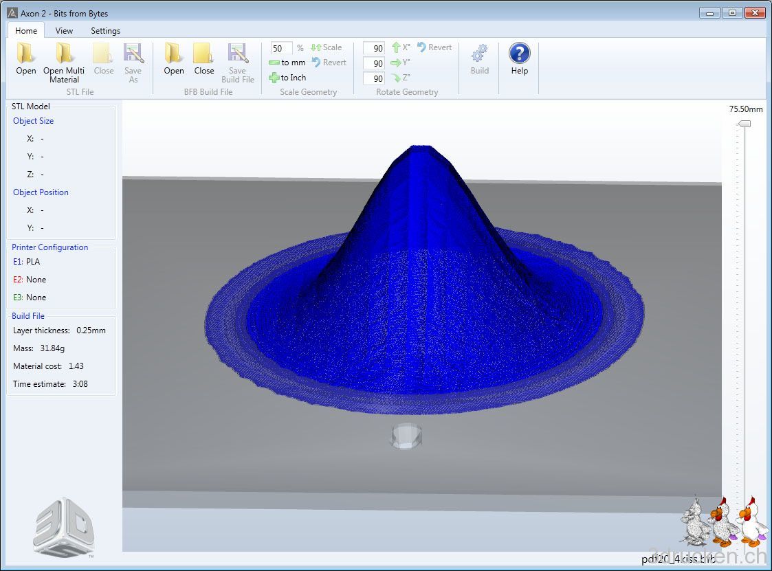 Das STL haben wir dann mit KISSlicer skaliert, in 0.25-Schichten geslicet, 0% Füllung, ohne Raft. Der Wunsch vom Auftraggeber war grünes PLA. Zwecks besserer Darstellung läuft unser Axon 2 allerdings ständig mit der Farbe Blau. Nach zwei gescheiterten Druckversuchen mussten wir 10% Füllung zugestehen, der innere Rand enthielt soviel Überhang, dass der Drucker dort nur noch geschmiert hatte.