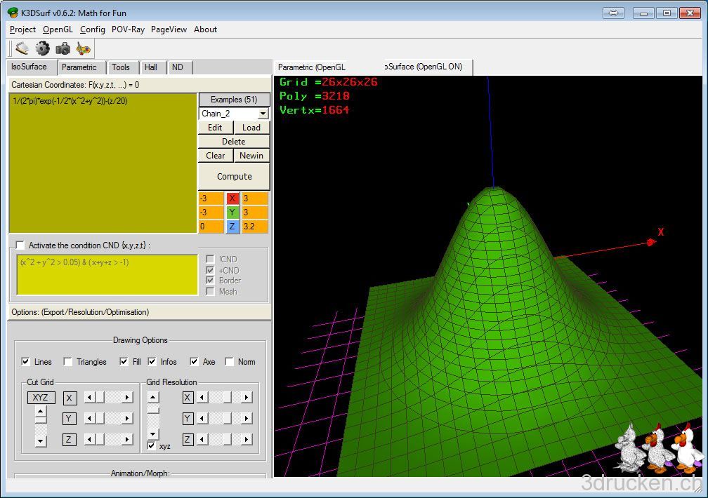 Zunächst haben wir nach einer Software gesucht, welche uns Mathematische Funktionen als Meshes exportieren kann, welche wir dann für den Druck aufbereiten können. Dabei sind wir auf K3Dsurf gestossen. Damit lassen sich solche Dinge wunderschön darstellen, und danach exportieren. Die Software enthält zudem auch schon einige schöne Beispiele, und auf Youtube finden sich weitere Formen, die von Usern erstellt wurden.