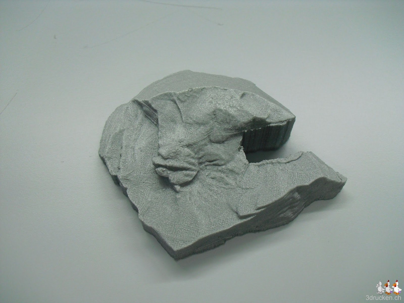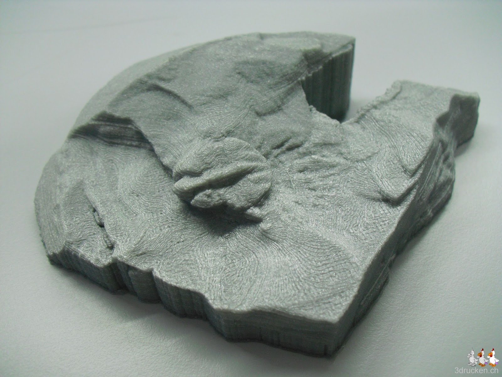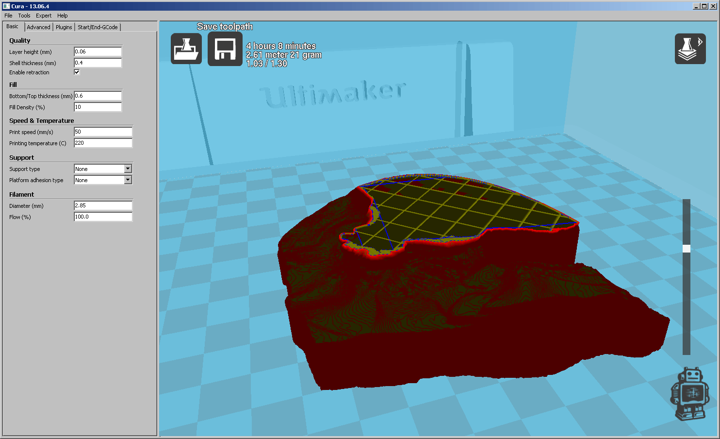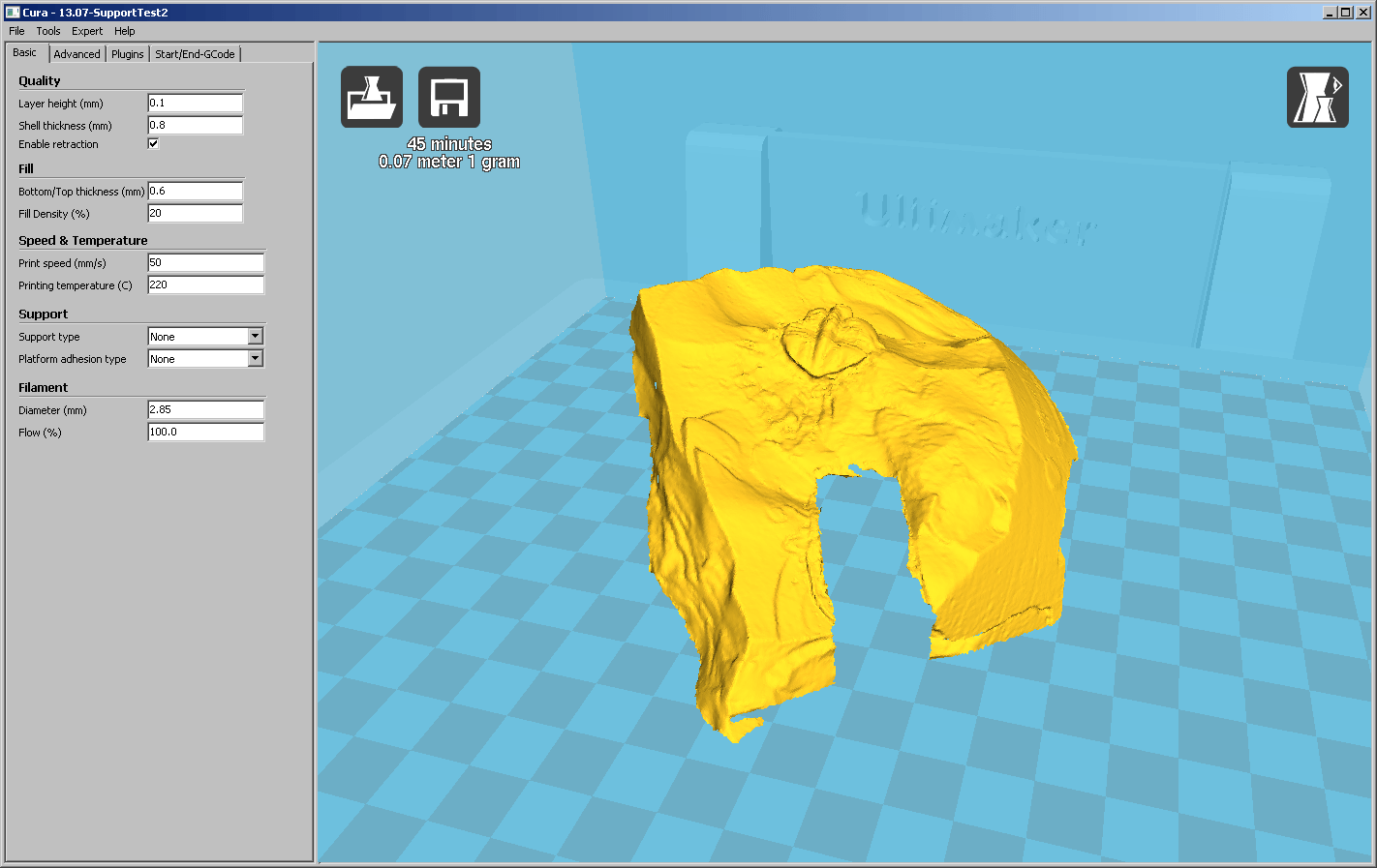 Zur Netfabb Cloud hochladen und automatisch reparieren lassen. Danach mit Cura slicen (Einstellungen: 0.06, 0.4, 0.6, 10%, 50, 220) und auf dem Ultimaker drucken.
