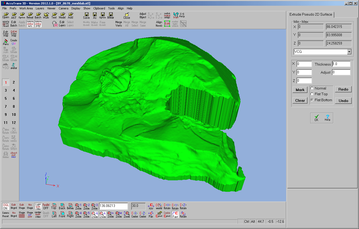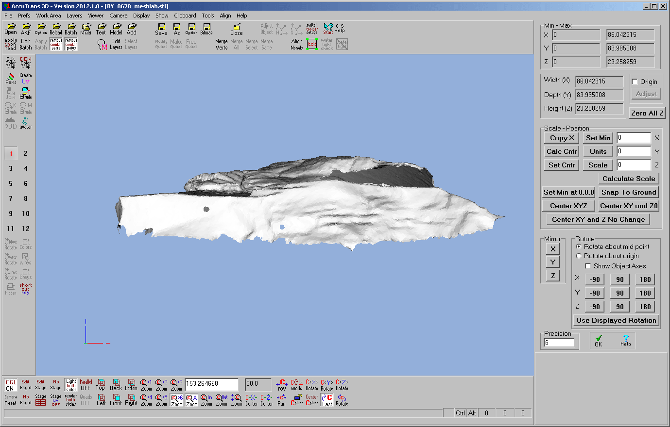 Das Modell gleicht vielen unserer Satellitendaten für Reliefs. Wir öffnen also die OBJ oder STL Datei in AccuTrans 3D. Wenn der optionale Schritt via MeshLab ausgelassen wurde, zeigt das OBJ 4 Layer an, welche wir mit der Funktion „Merge All“ auf einen Layer zusammenführen. Weitere Bearbeitung durch Adjust: Mit der Maus das Objekt drehen und dann Use Displayed Rotation; Set Min at 0,0,0 verwenden.