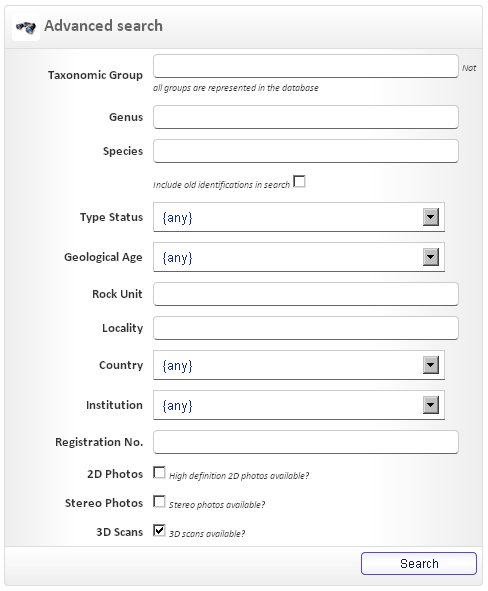 Anfänger die nichts mit Fossilien zu tun haben finden sich nicht gleich zurecht. Wie soll ich wissen, nach welchem Stichwort ich suchen soll? Zum Glück gibts die „Advanced Search“ und dort einen Schalter, um nur die Einträge aus der Sammlung anzuzeigen, welche 3D-Scans enthalten. Wählt man danach keine weiteren Dinge aus und lässt die Suchfelder leer, werden nach Klicken auf „Search“ alle Fossilien mit 3D-Scans angezeigt.