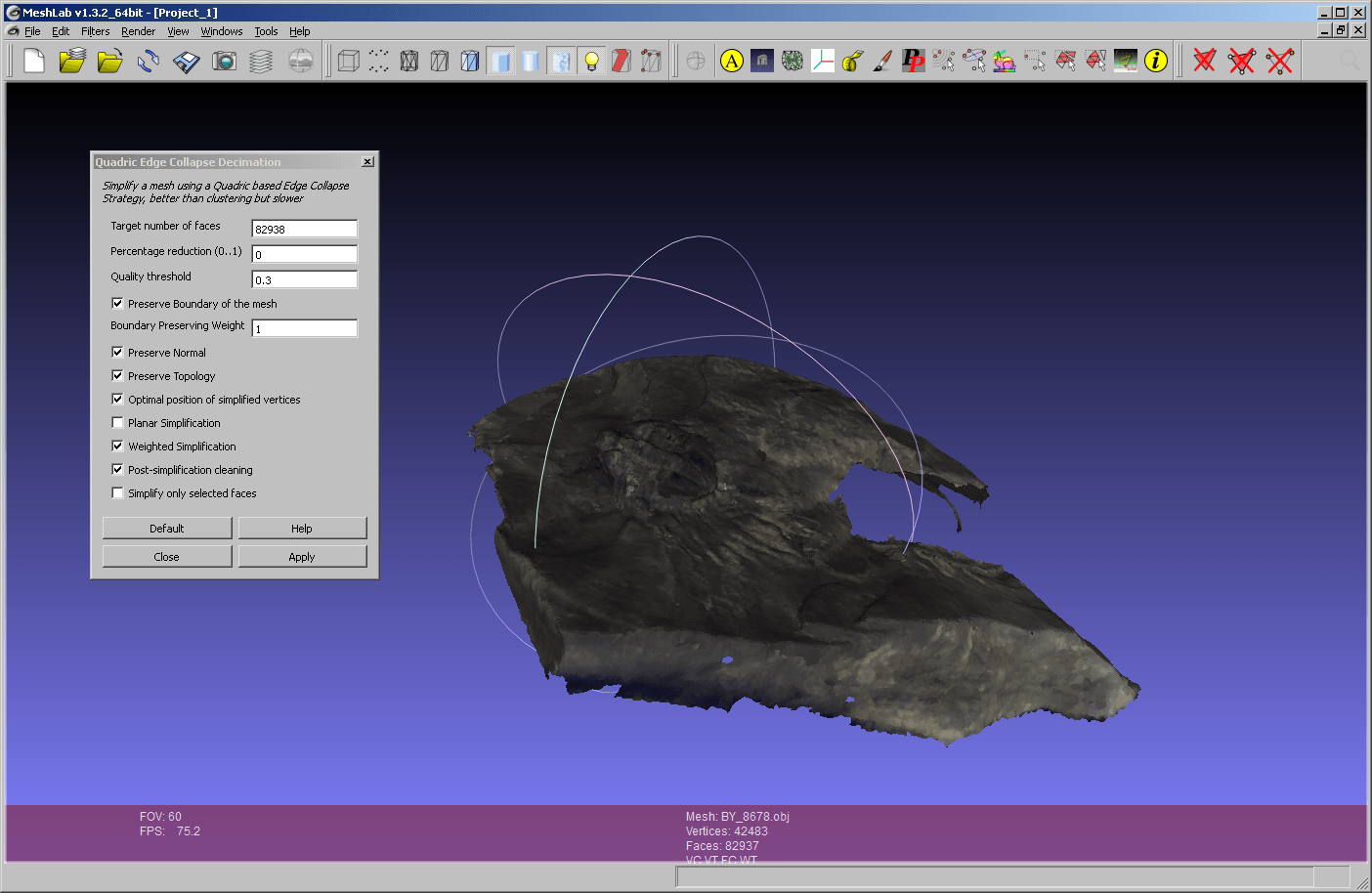 Optional kann man mit MeshLab die Komplexität der OBJ-Datei reduzieren. Dazu das OBJ in MeshLab laden und danach unter Filter.Remeshing -> Quadric Edge Collapse Decimation auswählen. Den Vorschlag zur Halbierung der Faces annehmen und danach via File.Export Mesh As als STL speichern.