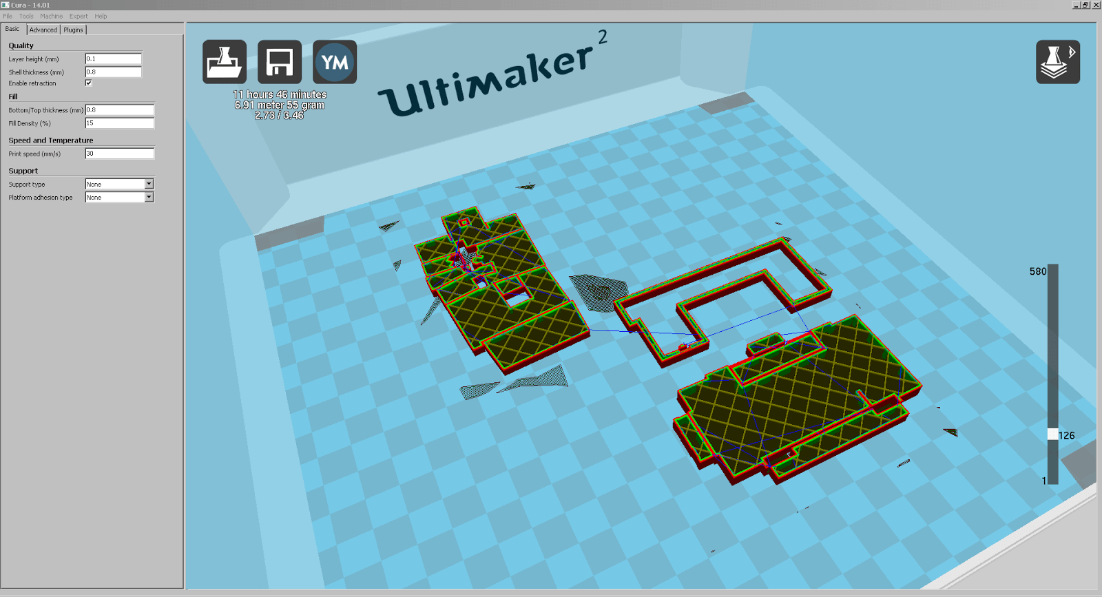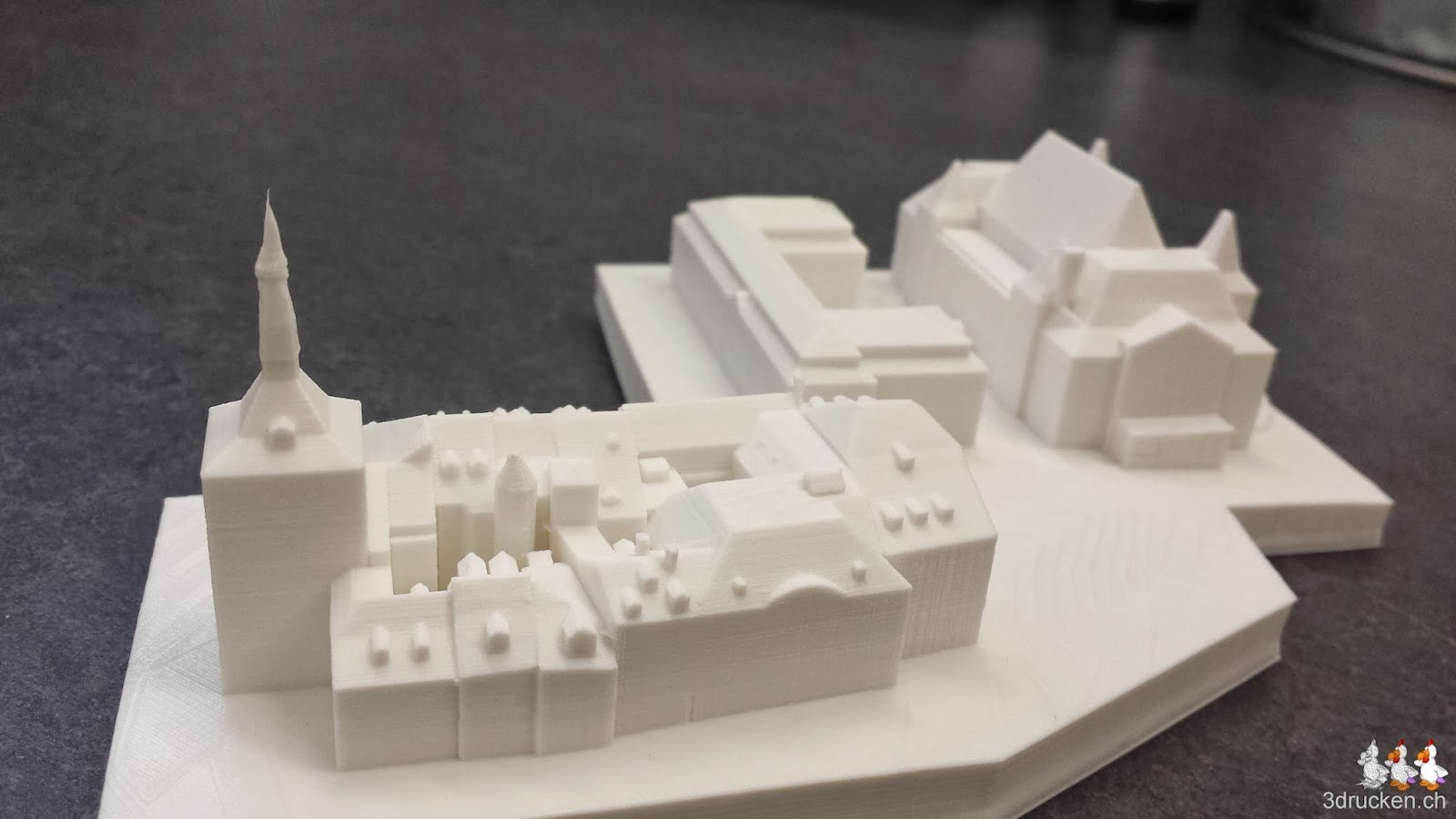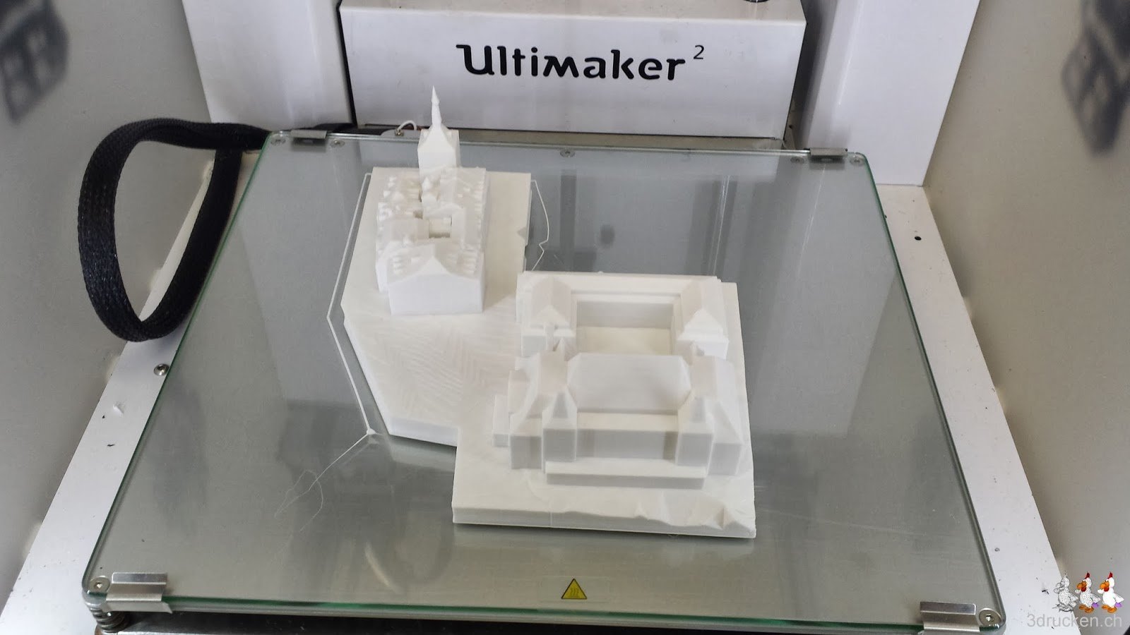 Die meisten Leute im Bereich von CityGML-Daten verwenden Pulverdrucker zur Herstellung ihrer Modelle, dies stellt andere Anforderungen an materialsparendes Drucken als unser FFF-Verfahren. Typischer Weise werden beim Drucken mit Pulver die Modelle innen bis auf eine minimale Wandstärke ausgehöhlt. Wir verwenden je nach Modell und besonders den horizontalen Flächen eine möglichst geringe Füllung, welche sich aber als Muster über den gesamten Innenraum erstreckt. Je nach Anwendungsgebiet ist die Limitation auf eine Druckfarbe pro gedrucktes Objekt bei unserem Verfahren ein klarer Nachteil. Dafür seien unsere Modelle um einiges robuster, wie uns Herr Schmits bei seinem Besuch erzählt hat.