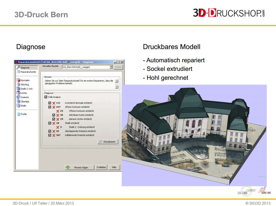 So sehen das offenbar auch Experten auf dem Gebiet von Stadtmodellen, welche den CityGML-Workshop im Rahmen des 3D-Forums in Lindau als Referenten bestritten. In ihrer Präsentation diskutierten die Referenten zuvor erhaltene Daten aus verschiedenen Quellen und stellen Dateiformate und Korrektursoftware wie z.B. CityDoctor vor, welche bestehende CityGML-Daten auf Fehler überprüfen kann. Oder weitere Reparatursoftware, welche die Druckbarkeit von Modellen prüfen und viele Fehler automatisch beheben kann.