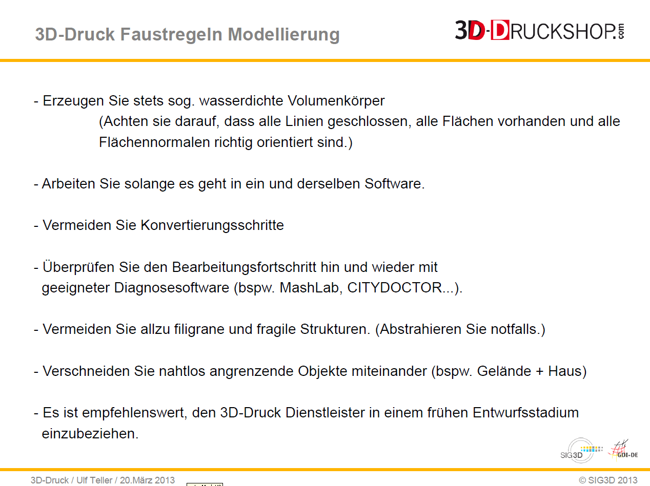 Zum Schluss seiner Präsentation liefert Herr Teller, Profi mit eigener Firma ULFTELLER 3D-Druck auf dem Gebiet der Erstellung von 3D-gedruckten Stadtmodellen, auf einem einzigen Slide eine enorme Menge Faustregeln.