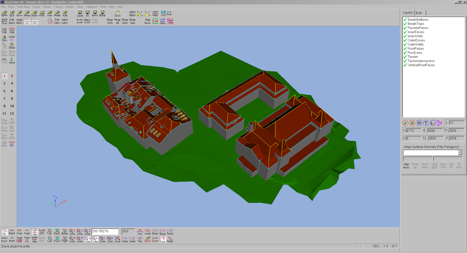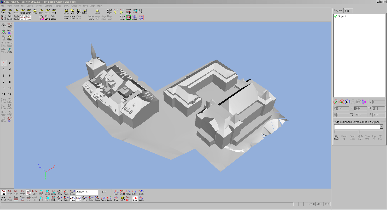Erst während dem Schreiben dieses Beitrags, und bei der nochmaligen genauen Betrachtung des gedruckten Modells stellen wir fest, dass beim Export aus dem Ausgangssystem nach OBJ, oder bei der Konvertierung ins OBJ besonders am DHM Schaden entstanden ist. Die Daten im DXF-Format, welche wir ebenfalls in AccuTrans 3D importieren und analog dem OBJ weiterverarbeiten können, sind qualitativ besser. Trotzdem werden wir in der Folge den Ablauf anhand der OBJ Ausgangsdaten zeigen, da wir tatsächlich diese Daten gedruckt haben. Ev. machen wir im Anschluss einen weiteren Druckversuch auf Basis der DXF-Daten, um die Unterschiede am gedruckten Objekt zu begutachten.