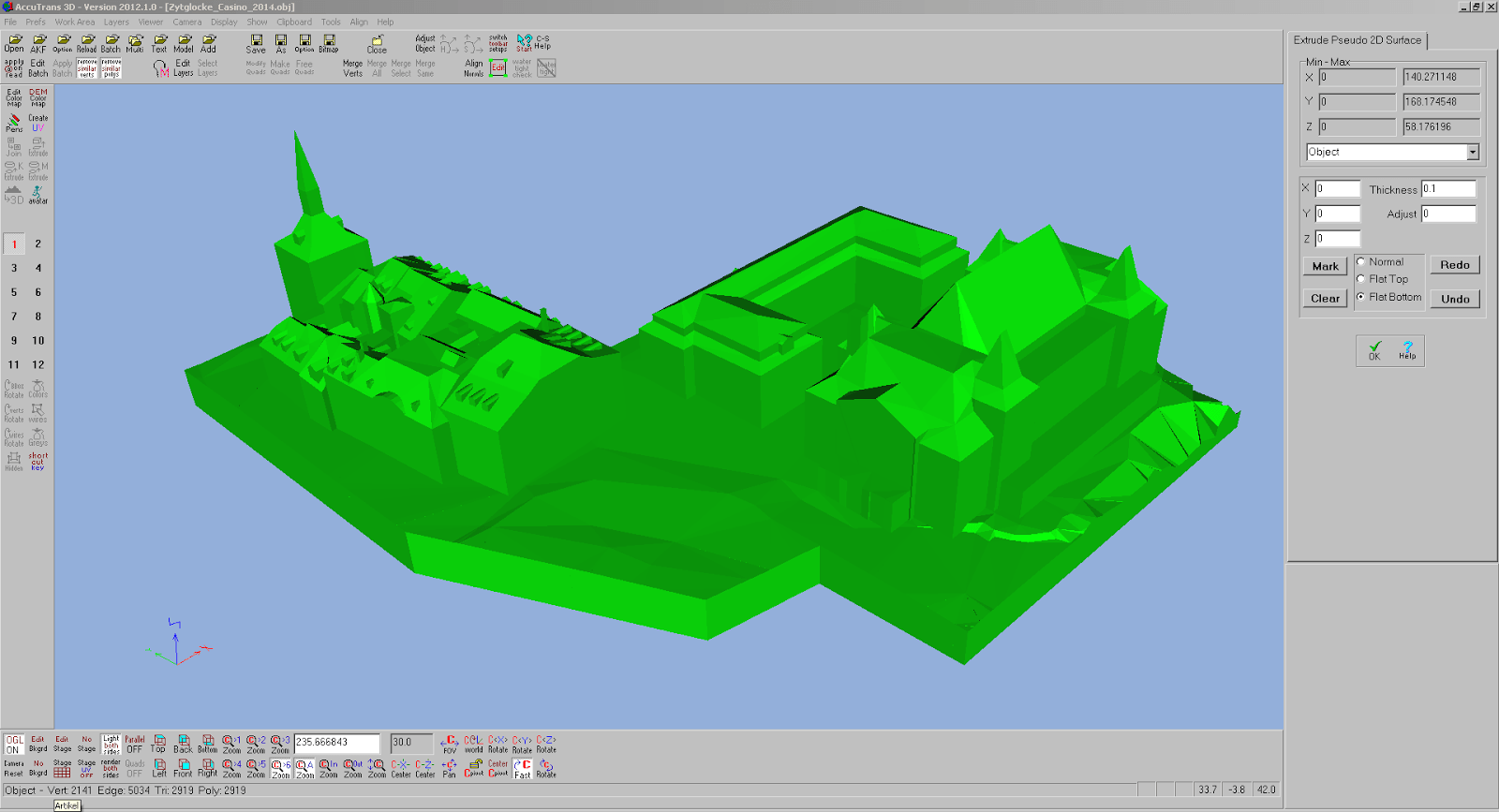 In AccuTrans 3D drehen wir das Modell mit Adjust Object -90° um X und setzen die Werte für Min X,Y und Z auf 0 und fügen dann dem Modell mit der Funktion „Pseudo Extrude 2D Surface“ einen flachen Boden hinzu und exportieren das Resultat ohne weitere Anpassungen als STL-Datei.