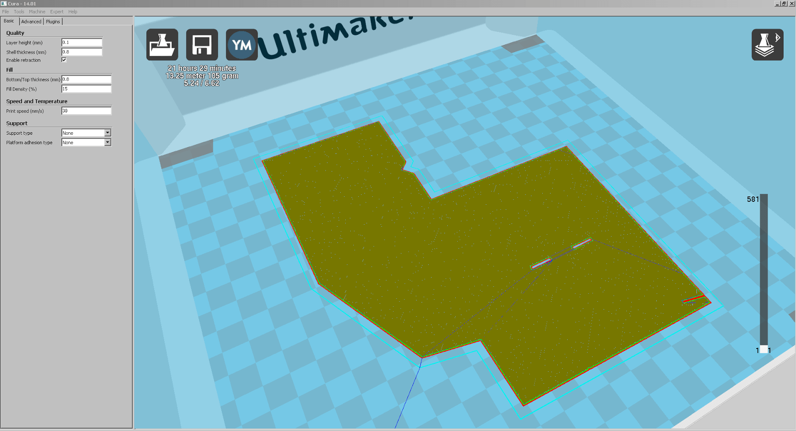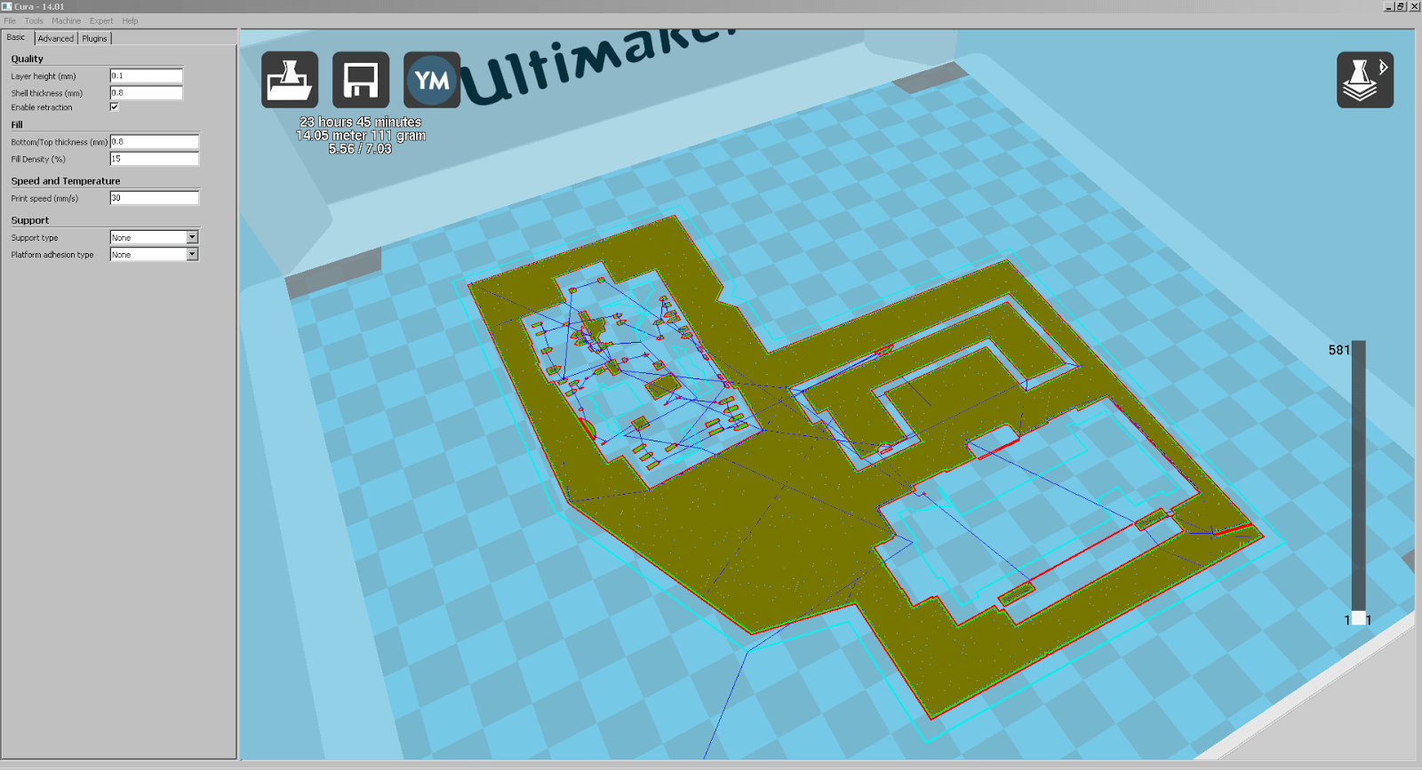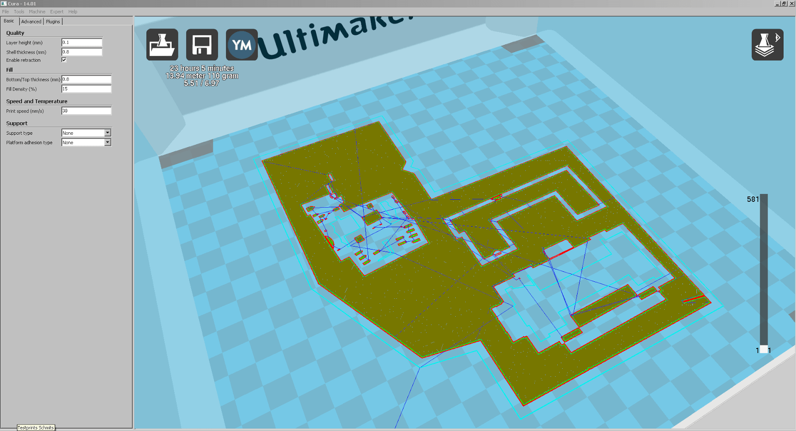 Wir experimentieren also mit den Reparaturoptionen von Cura und Schalten Option A in den Experten-Einstellungen an. Das sieht noch nicht viel besser aus.