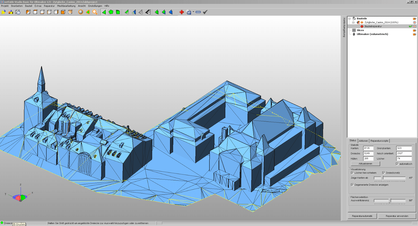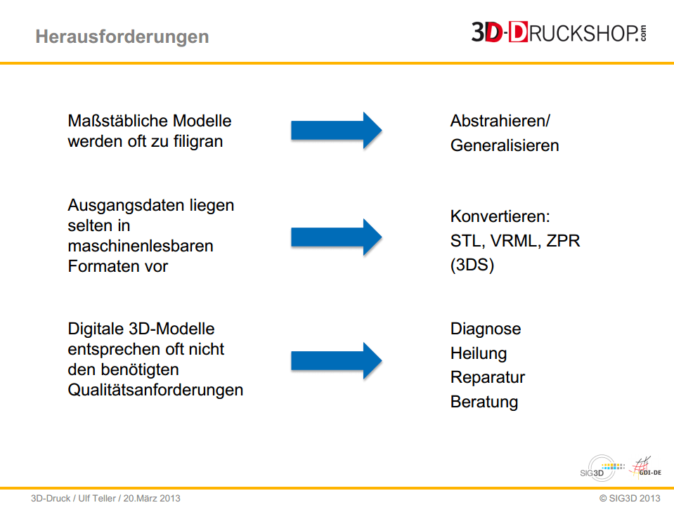 Zudem erwähnt Ulf Teller in seiner Präsentation anlässlich des selben 3D-Forums Lindau eine Vielzahl an Herausforderungen die sich beim Verarbeiten und Drucken von 3D-Modellen ergeben. Schön finden wir daran, dass man zu vielen dieser Erkenntnisse einfach nur durch die praktische Arbeit mit den Daten kommt. Die meisten dieser Probleme sind uns daher auch im Verlauf unserer Aufbereitung der Daten beim ersten Druckversuch mit den qualitativ schlechten Daten aufgefallen.