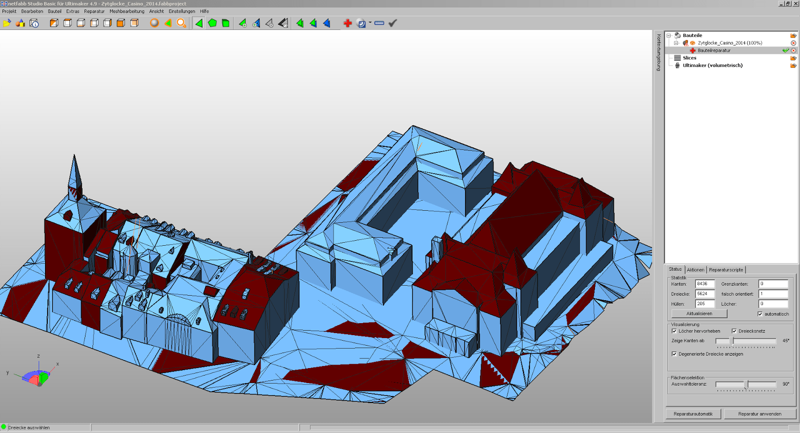 Wir verwenden zur Fehlerprüfung je nach Dateiformat meist netfabb studio, die netfabb cloud oder den Solid Inspector in Sketchup, welche allerdings generell vom 3D-Modellieren oder 3D-Drucken her entstanden sind.
