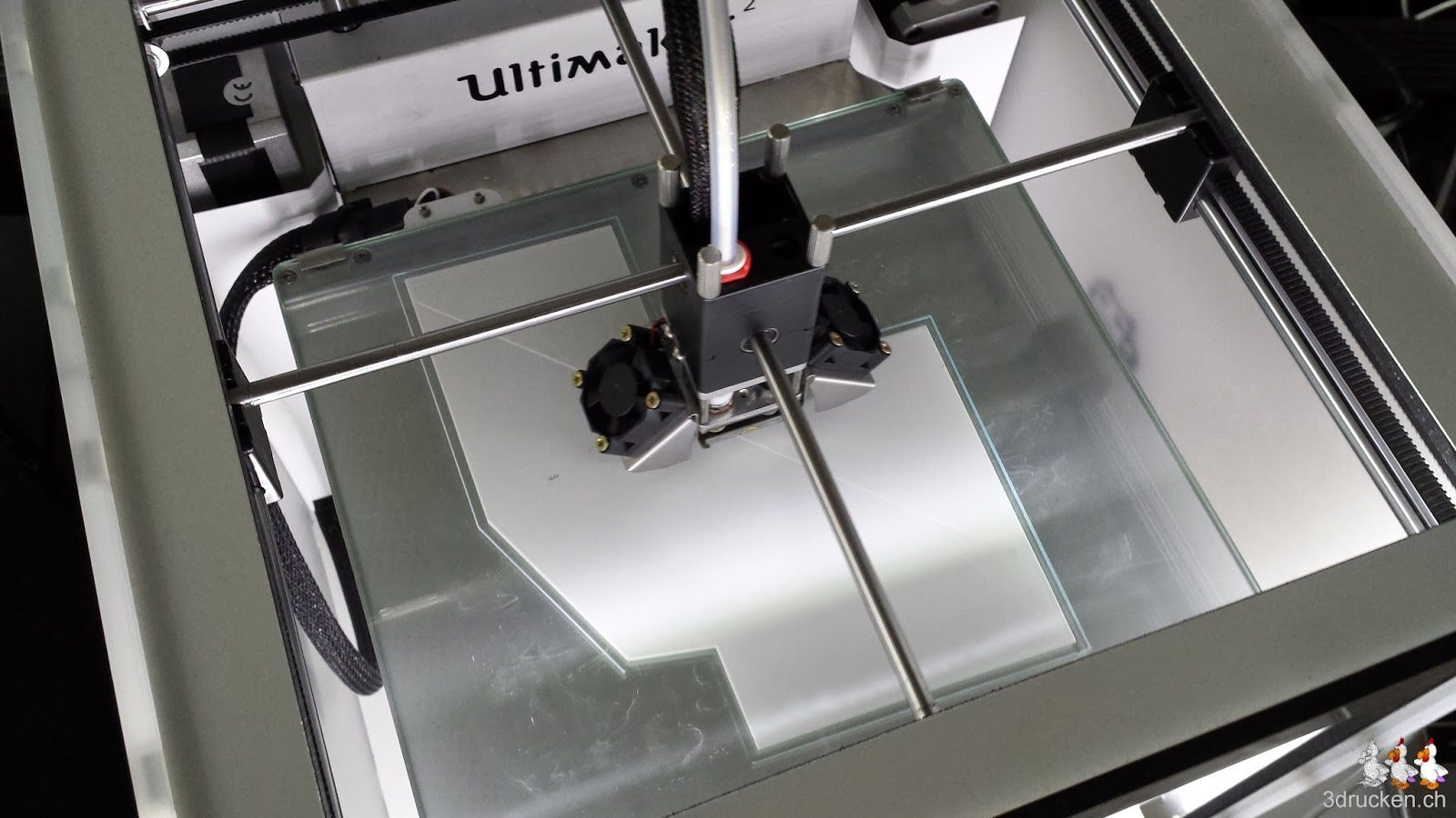 Der Druck läuft, und die zu erwartende Druckzeit schwankt zwischen 1-58 h auf der Anzeige vorne am Ultimaker 2. Am nächsten Morgen, 21 h später sieht der Drucktisch so aus, und es stehen noch geschätzte 9h auf der Anzeige am Drucker. Wir reduzieren die Drucktemperatur auf 215° C, da jetzt pro Layer viel weniger Zeit benötigt wird, und Details erstellt werden sollen.