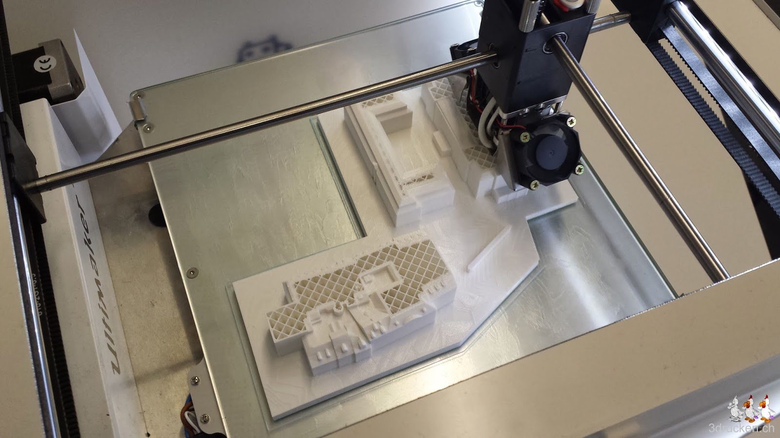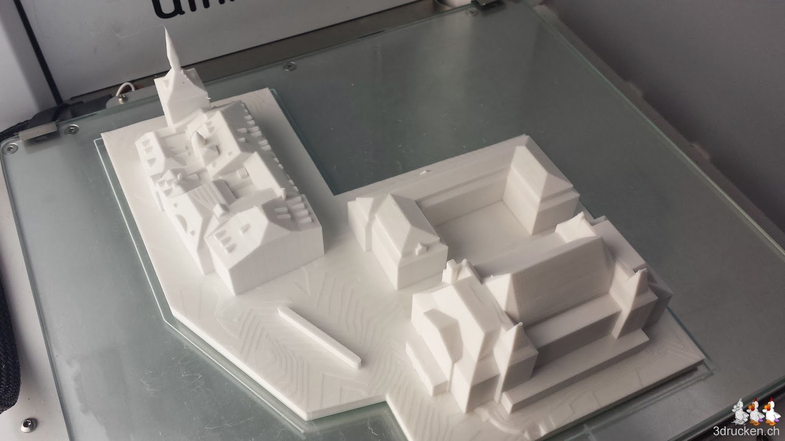 Ganz zum Schluss haben wir manuell sowohl den Tisch früher auskühlen lassen, wie auch die Drucktemperatur schrittweise bis auf 200° C reduziert, um die Spitze des Zytglogge-Turms erfolgreich drucken zu können.