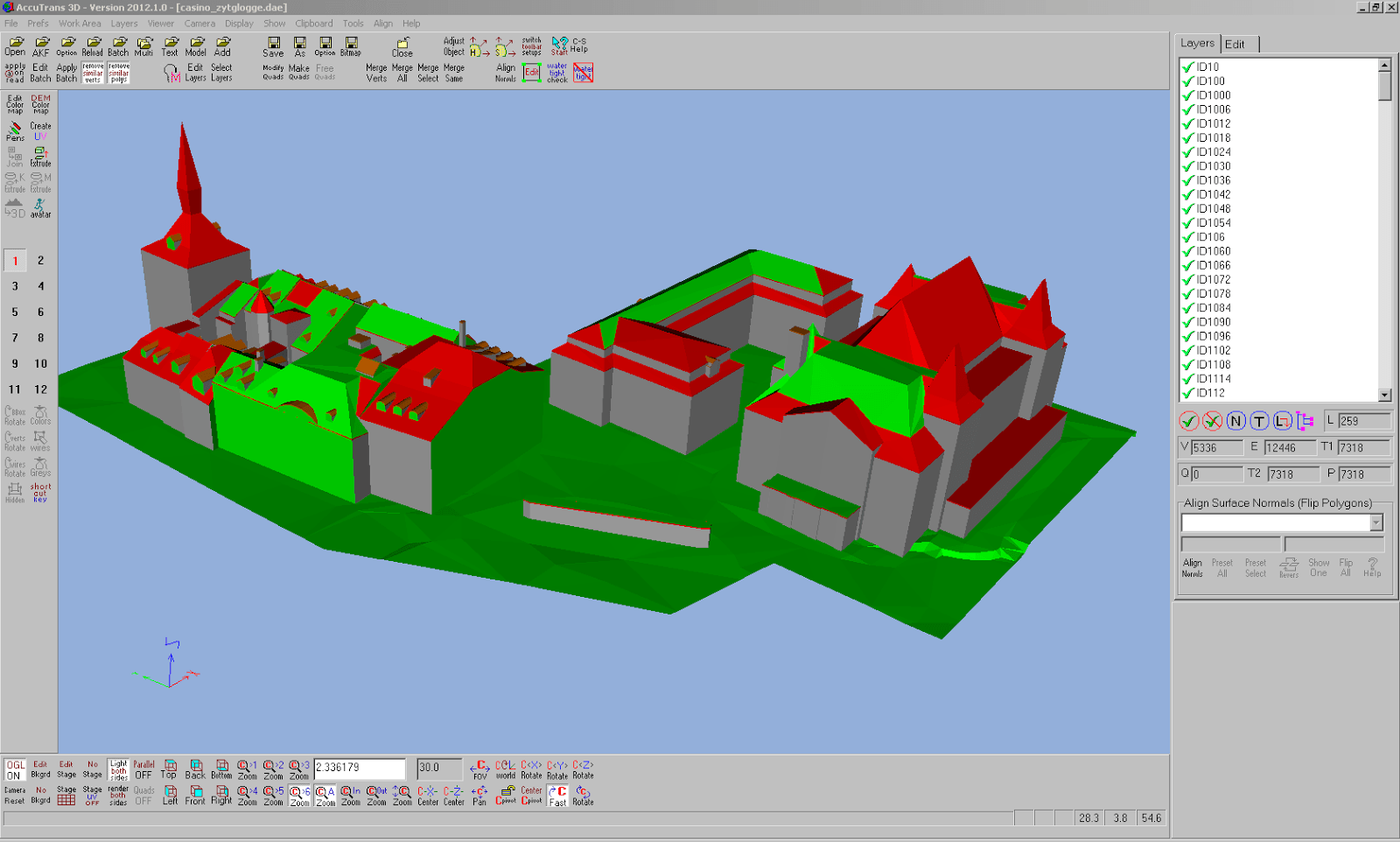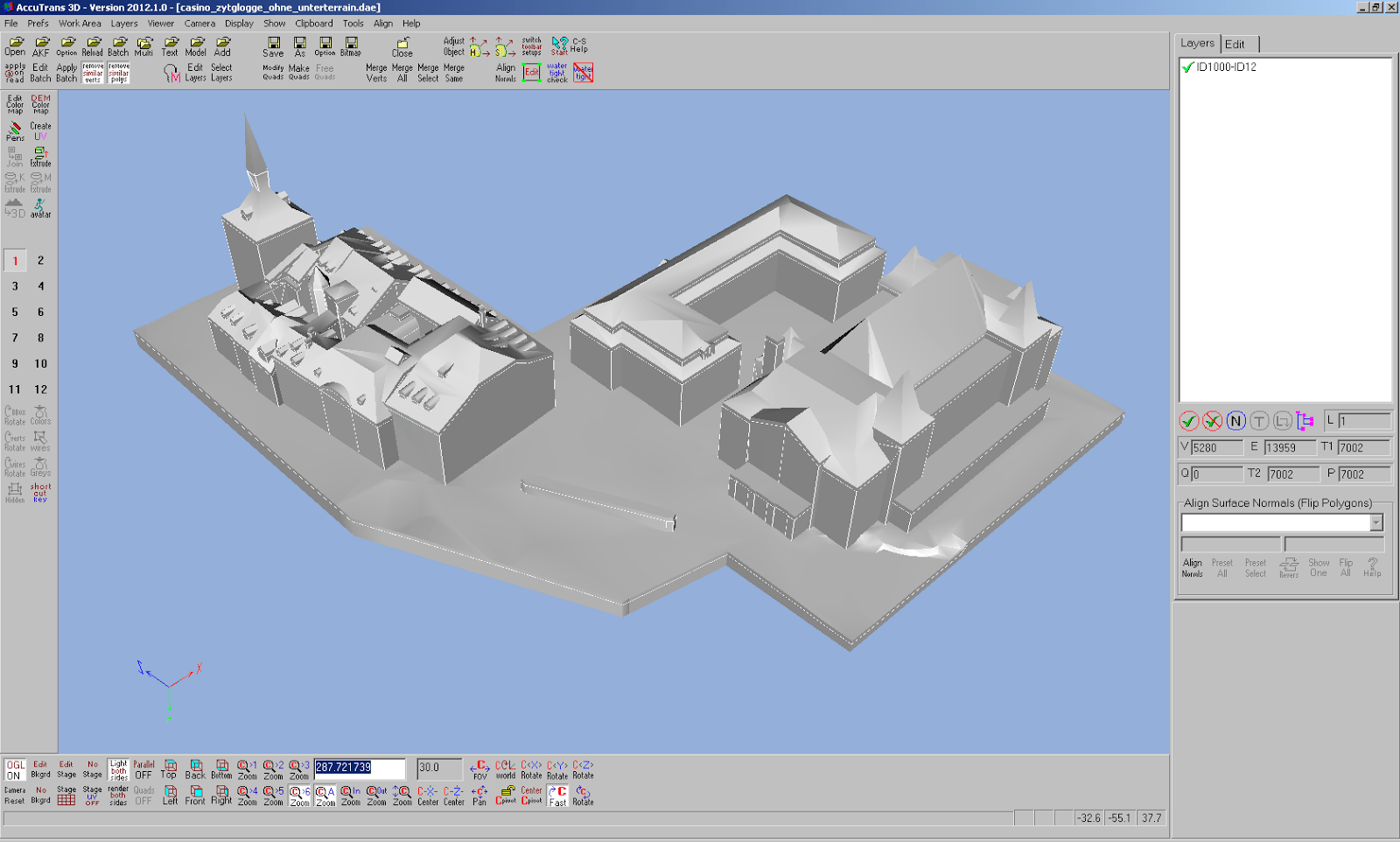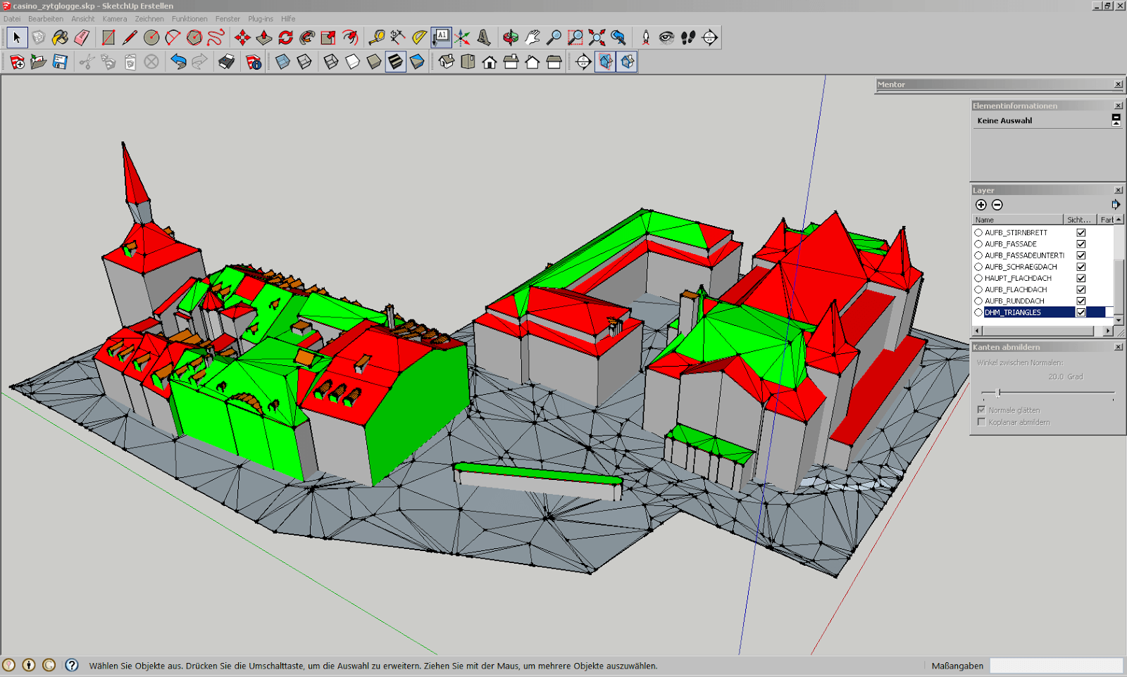 Die Korrektur aller fehlenden Flächen benötigte ca. 6 h, was für den kleinen Ausschnitt aus dem Stadtmodell doch eine stattliche Dauer ist. Optimieren liesse sich dieser Prozess bestimmt, wenn man vor oder beim Export aus der Modellierungssoftware die Ebenen verbinden würde.