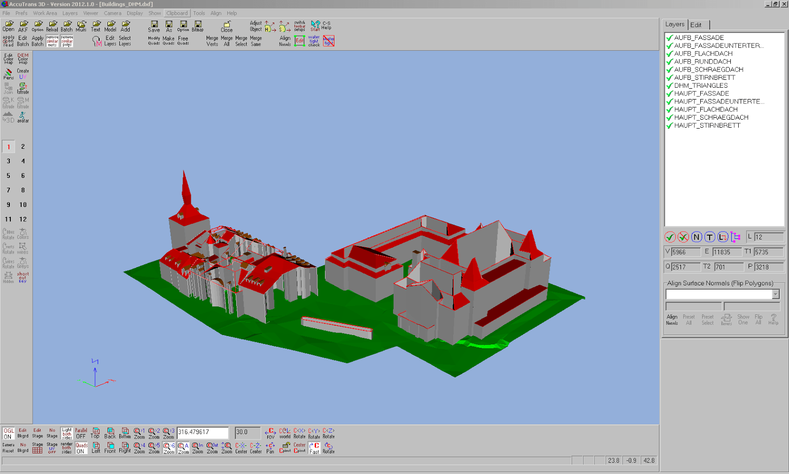 Durch eine Anfrage von Herrn Schmits, Leiter Geoinformation beim Vermessungsamt der Stadt Bern, sind wir auf das 3D-Stadtmodell von Bern gestossen. Den Testdatensatz Casino Zytglogge von geobern.ch haben wir uns im DXF-Format gleich mal runtergeladen und in den uns vertrauten Tools zu öffnen versucht.