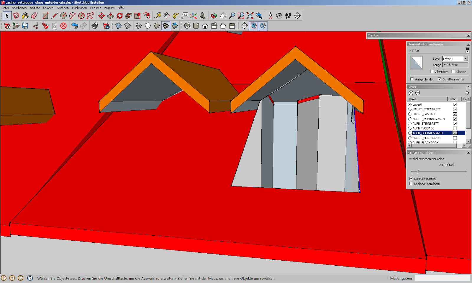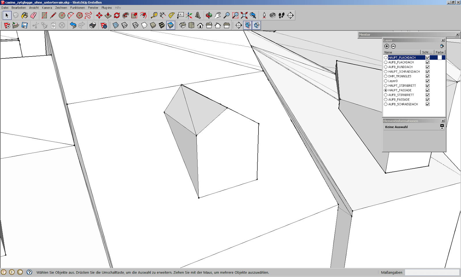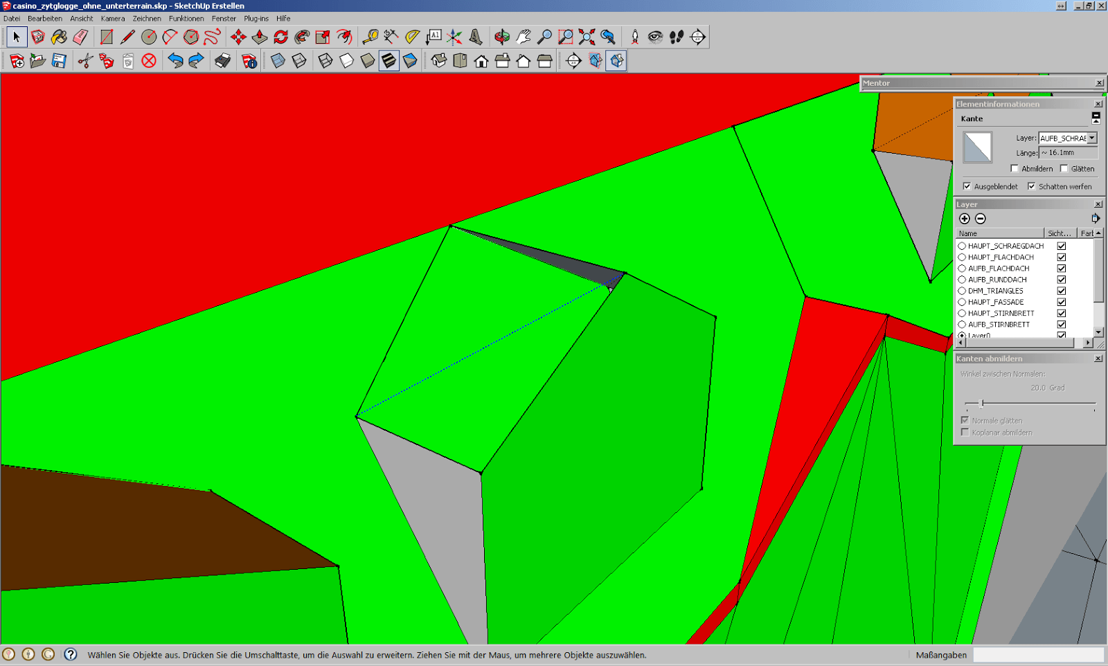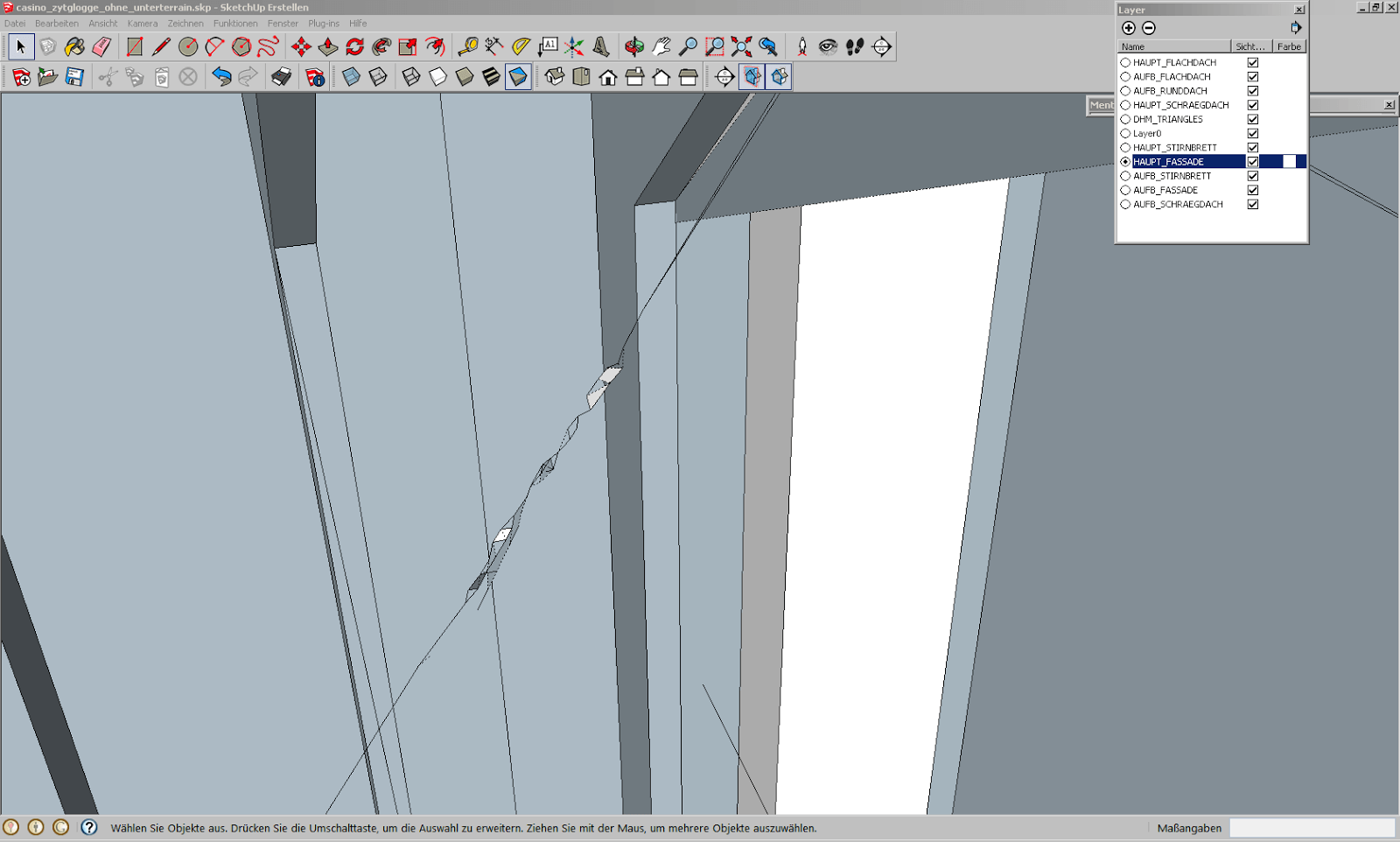 Zoomt man dann aber näher ran, erkennt man, dass zumindest eine Linie eher aus vielen Artefakten von Geometrien aufgebaut ist. Deshalb lässt sich das Dach der Lukarne auch nicht schön schliessen. Wir löschen sämtliche Artefakte und siehe da, das Dach lässt sich auf einmal perfekt schliessen.