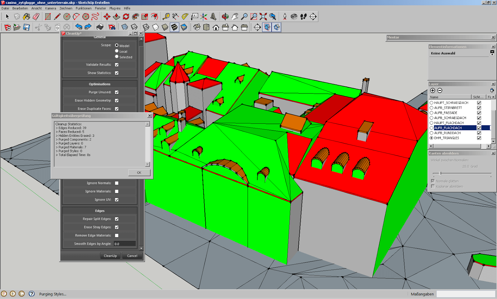 Ziel bleibt, ein gut druckbares Modell von Casino und Zytglogge zu erhalten. Wir versuchen uns zusätzlich an diversen Plugins, so z.B. an Cleanup3. Mit dem Outer Shell Tool könnten wir nur die Aussenhülle des Modells generieren lassen, dafür müssten wir aus den einzelnen Häusern aber Festkörper machen.