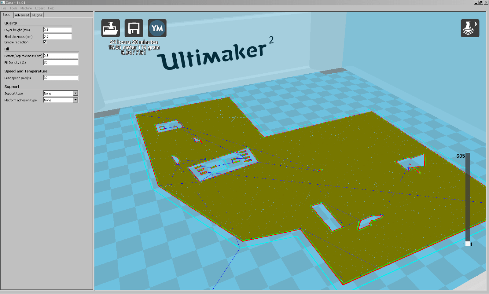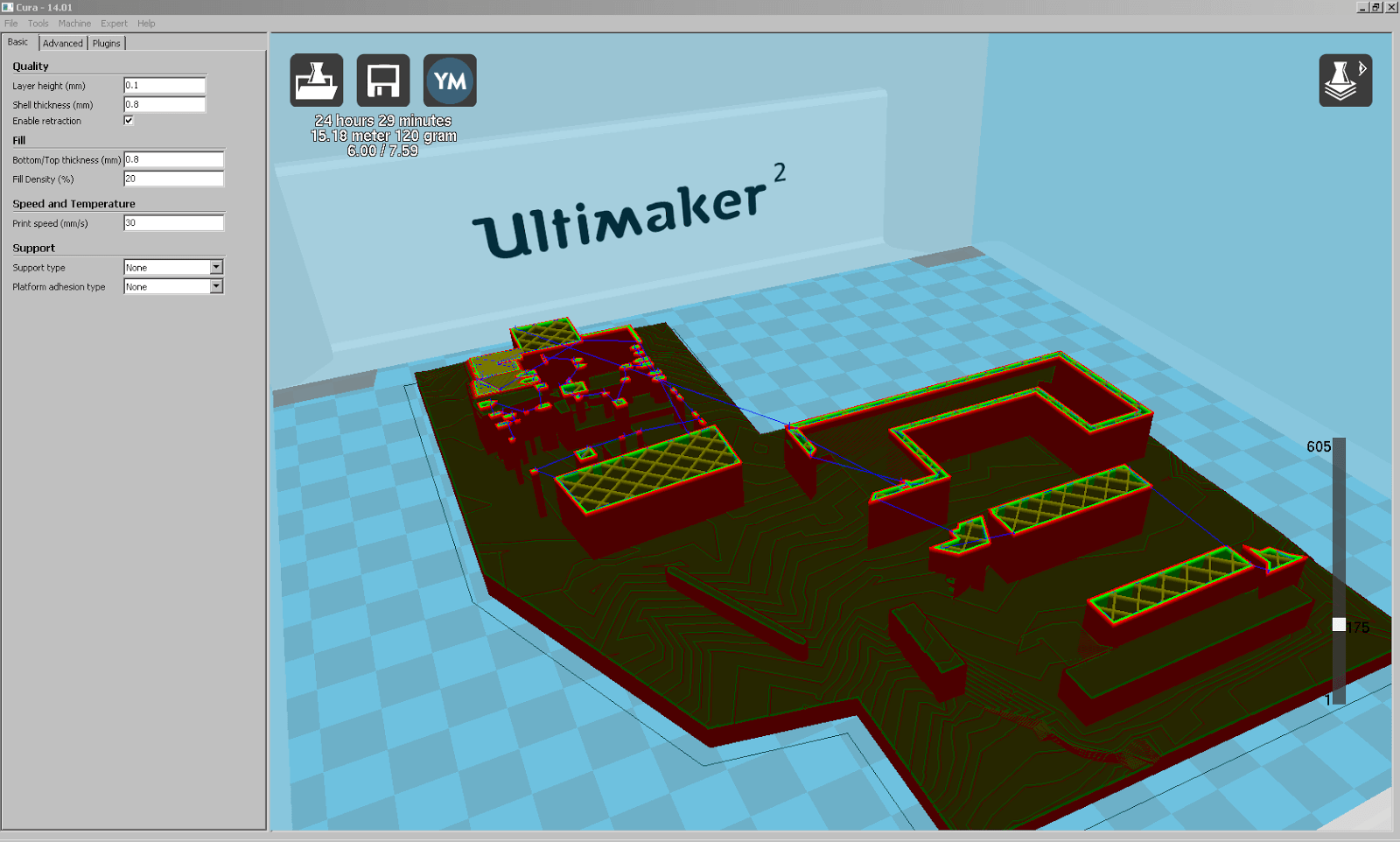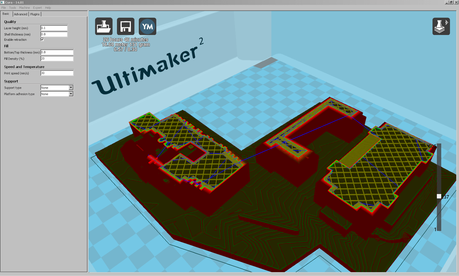 Dimensionen an den Ultimaker 2 angepasst, und nun mit flachem Boden für einen guten Druck. Jetzt das Modell noch um 90° um X drehen, und dann als STL für die Umwandlung zum Druck exportieren. In Cura 14.01 geöffnet, wählen wir wegen den vielen fast horizontalen Flächen 20 % Füllung und verwenden ansonsten die bisher bewährten Parameter. Trotz der geringen Dateigrösse des STL von lediglich 533 KB, benötigt Cura ziemlich lange um das Modell zu slicen. Die geschätzte Druckzeit liegt bei 22 h 46 min. Erst in der Layer-Ansicht entdecken wir, dass einige Häuser wohl tiefere Fundamente besitzen, als wir das Modell extrudiert haben.