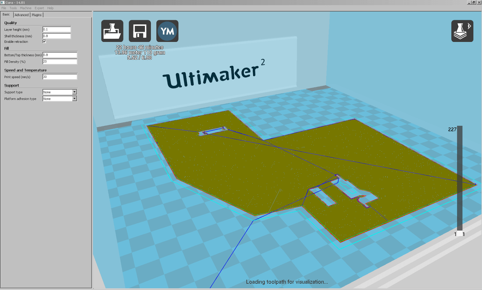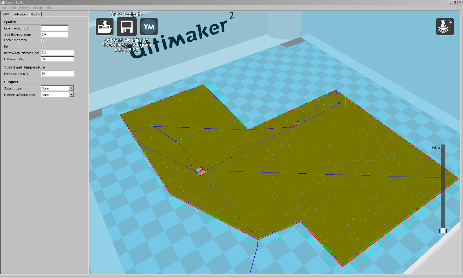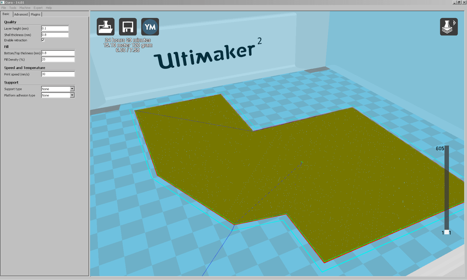 Dimensionen an den Ultimaker 2 angepasst, und nun mit flachem Boden für einen guten Druck. Jetzt das Modell noch um 90° um X drehen, und dann als STL für die Umwandlung zum Druck exportieren. In Cura 14.01 geöffnet, wählen wir wegen den vielen fast horizontalen Flächen 20 % Füllung und verwenden ansonsten die bisher bewährten Parameter. Trotz der geringen Dateigrösse des STL von lediglich 533 KB, benötigt Cura ziemlich lange um das Modell zu slicen. Die geschätzte Druckzeit liegt bei 22 h 46 min. Erst in der Layer-Ansicht entdecken wir, dass einige Häuser wohl tiefere Fundamente besitzen, als wir das Modell extrudiert haben.