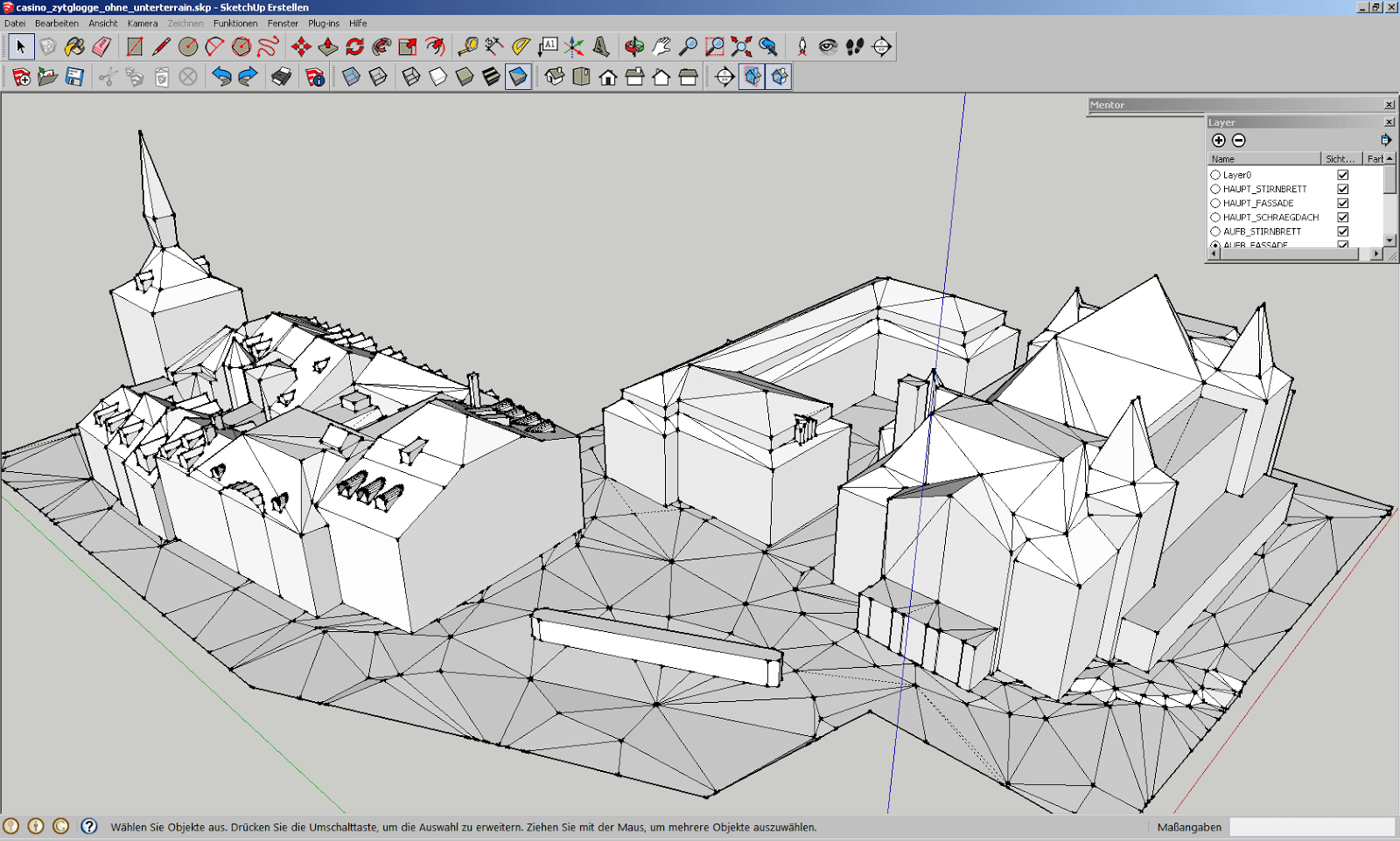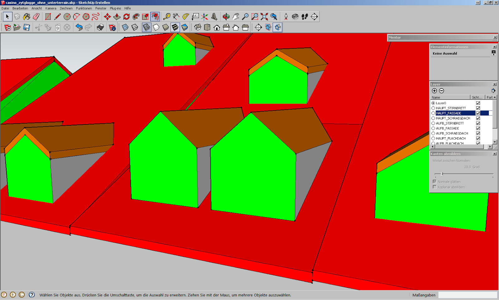 Siehe da, der Boden ist nun bis auf einen kleinen Schönheitsfehler flach. Leider fehlen dafür grosse Teile der Fassaden, da diese wohl im Modell falsch herum orientiert drin stecken. Unter Terrain entdecken wir zusätzliche Objekte, welche in einem weiteren Layer stecken, den wir ebenfalls löschen könnten.