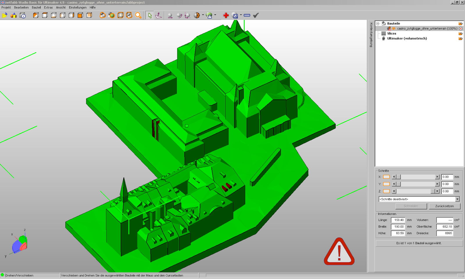 Wir versuchen zunächst, die Löcher von Cura automatisch schliessen zu lassen, als dies misslingt, entscheiden uns, das Modell aus AccuTrans3D erneut tiefer extrudiert zu exportieren. Überflüssige Höhe am Sockel könnten wir dann wenn gewünscht mit Netfabb Studio wegschneiden. Auch das klappt leider nicht, wohl wegen den vielen Fehlern im Modell, welche Netfabb Studio meldet.