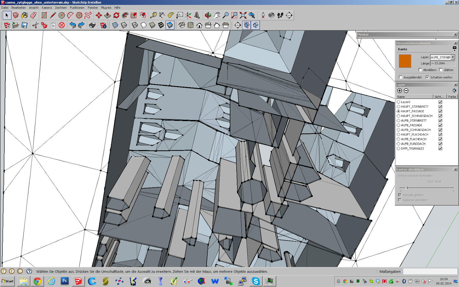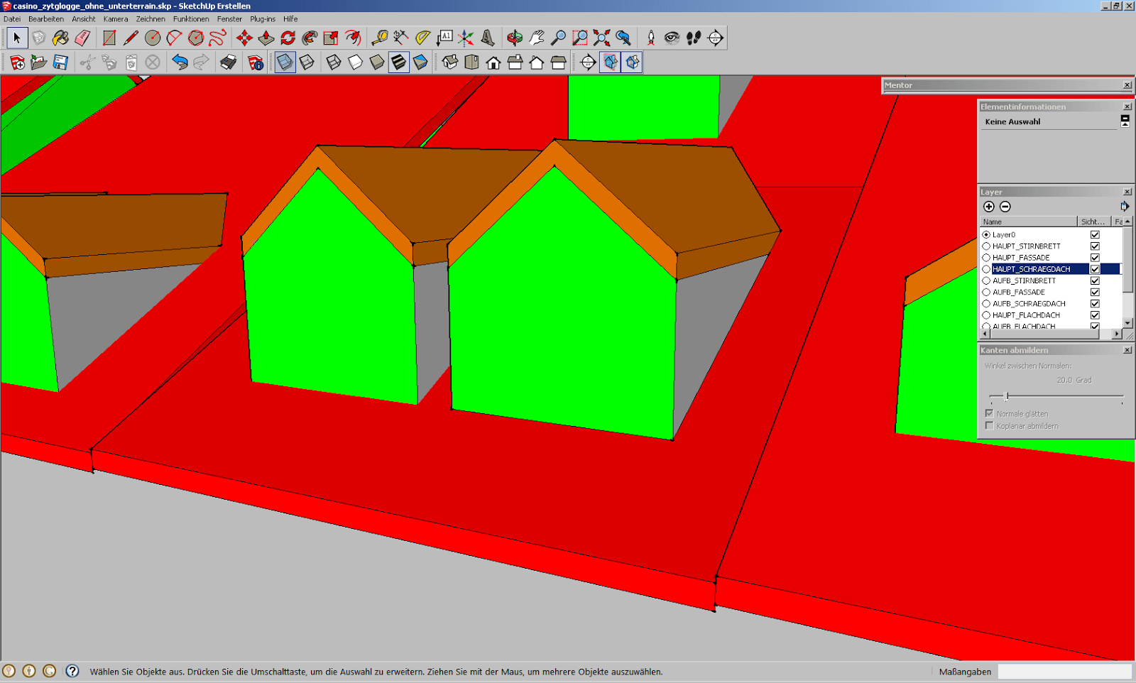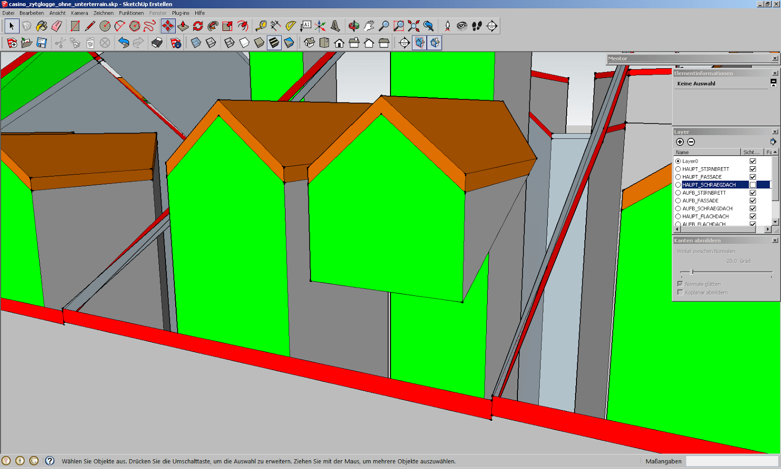 Durch diese manuellen Korrekturen am Ausgangsmodell in Sketchup steigt aber der Aufwand für die Aufbereitung der Modelldaten erneut an. Ebenfalls würde es reichen, die äussere Hülle aller Objekte zu verwenden, und die Objekte in den Gebäuden drin rauszulöschen, bzw. die Geometrien miteinander zu verschneiden, und danach die innen liegenden zu löschen. Wir machen hier ein manuelles Beispiel, wie das aussieht.