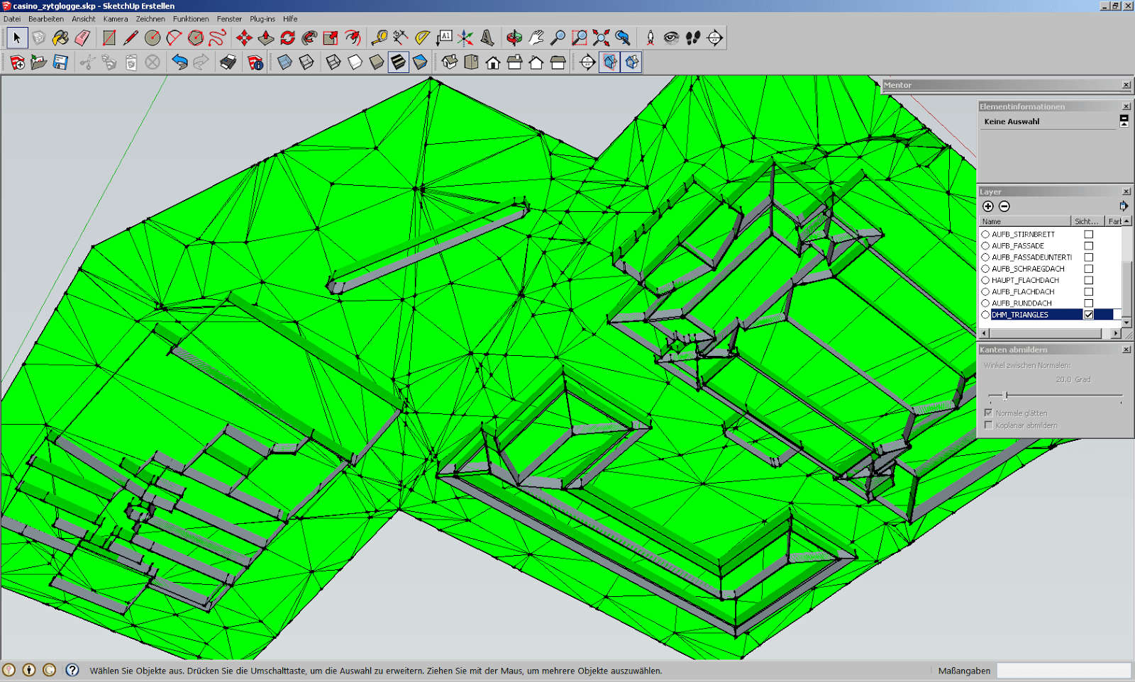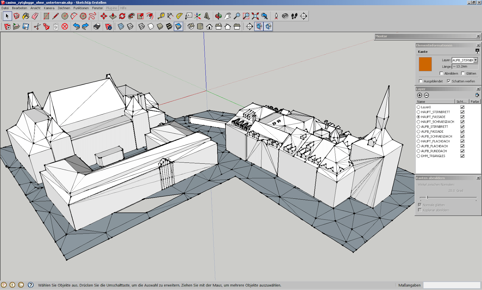 Nach einem weiteren Tag Aufwand, überflüssige Geometrien zu löschen, sieht das in Sketchup nun so aus. Diese Version exportieren wir nun als Collada und importieren es in AccuTrans 3D, um ein Relief daraus zu erstellen.