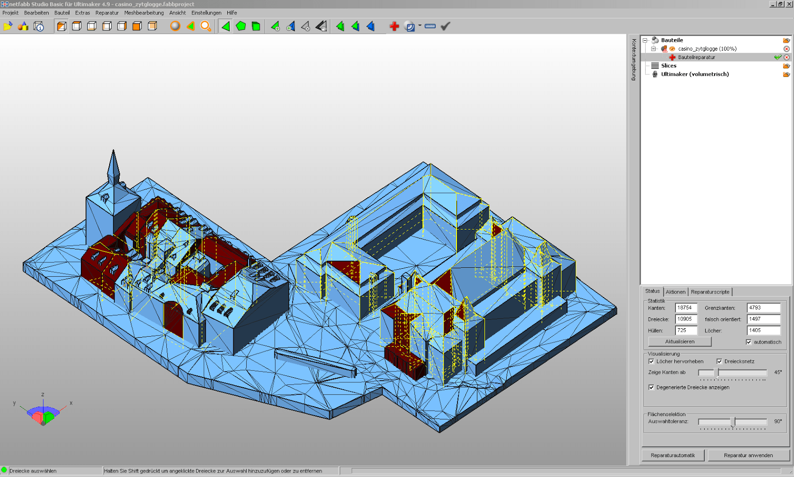Wir laden das Modell nochmal in Netfabb Studio, vielleicht lassen sich dort noch Fehler erkennen und automatisch reparieren lassen. Wir haben gute Arbeit geleistet, es sind praktisch keine Fehler mehr da. Einige falsch orientierte Dreiecke und dazu die automatische Korrektur laufen lassen, am Resultat ändert sich aber nicht mehr viel.