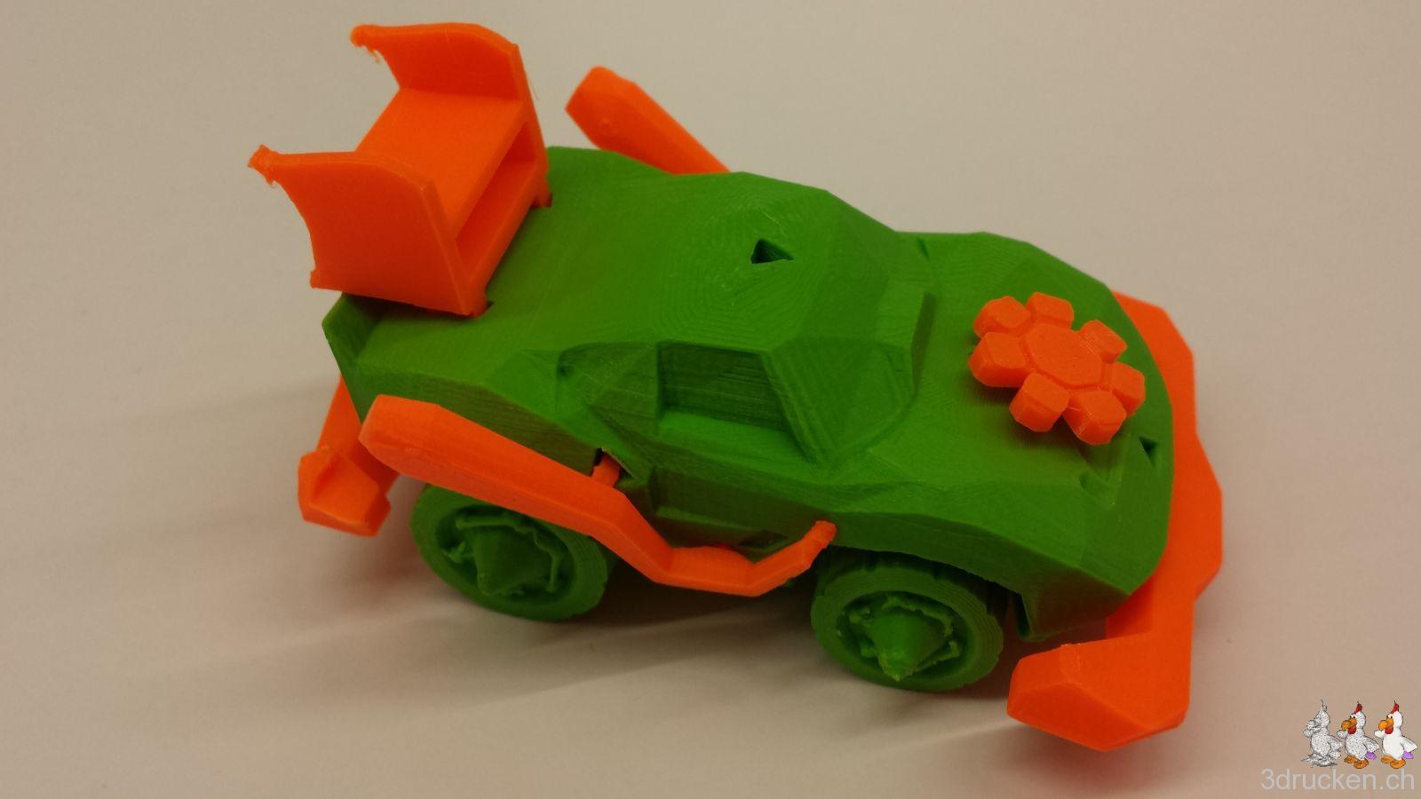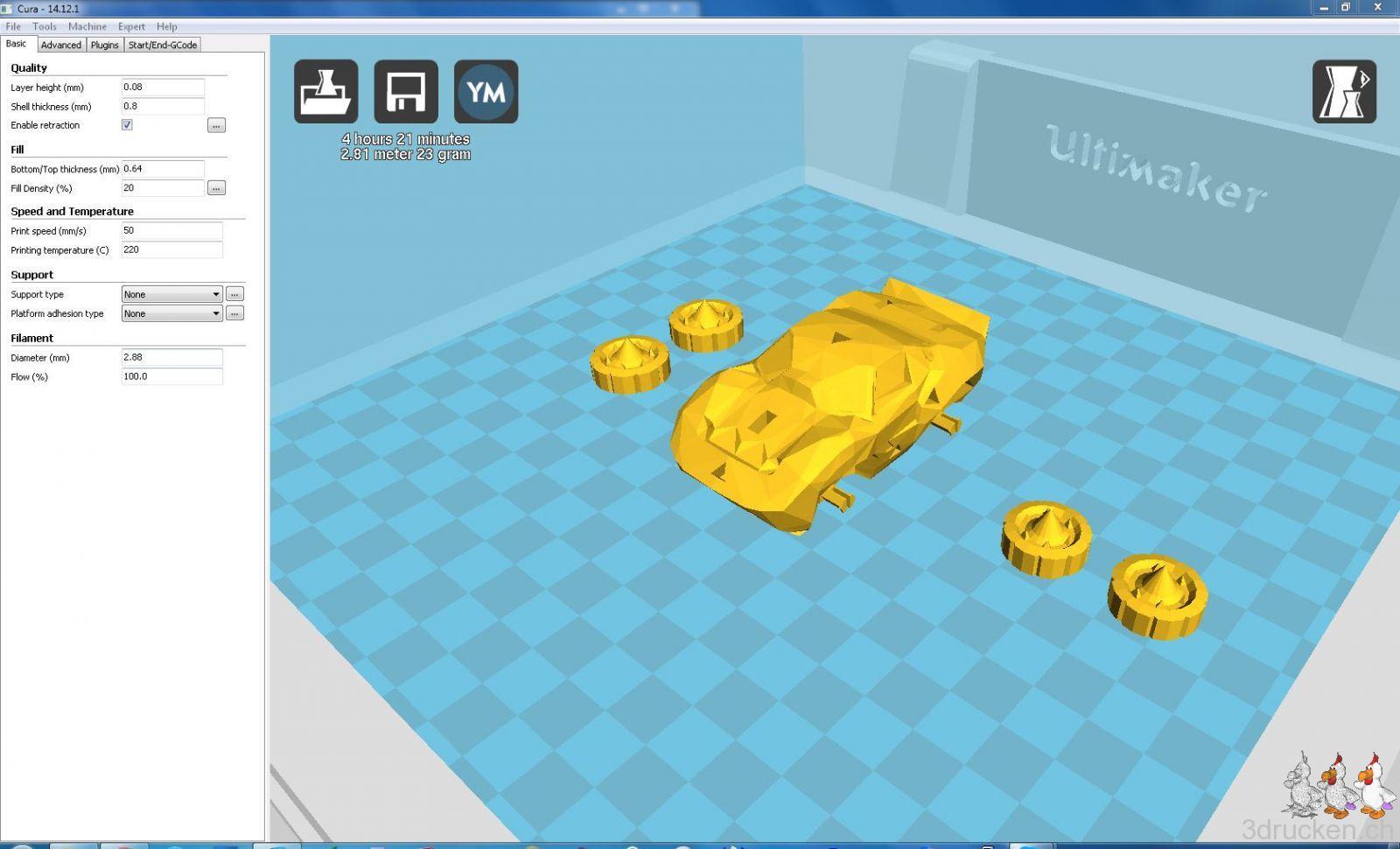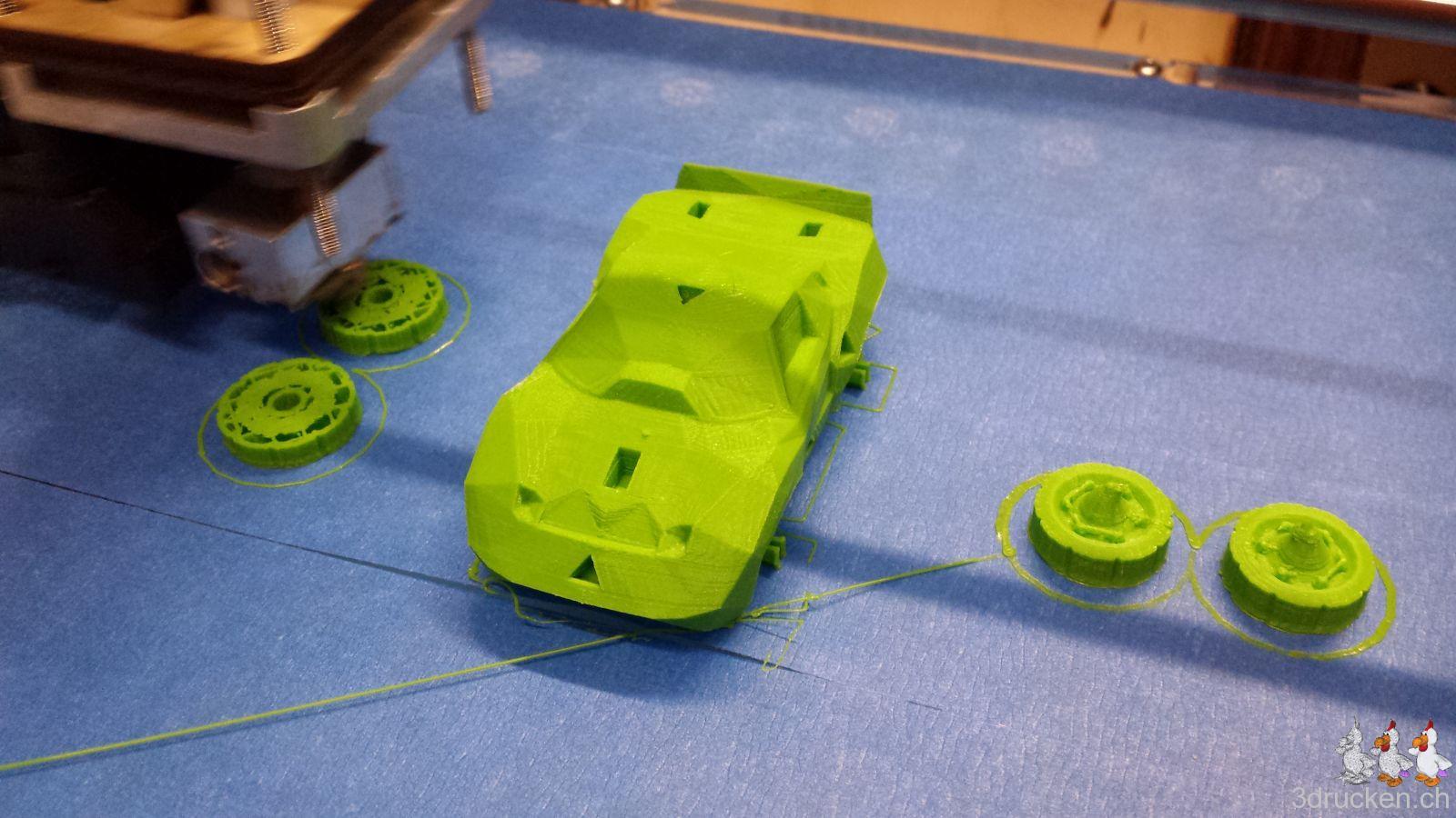 Das heruntergeladene Design lässt sich einfach auf einem 3D-Drucker zuhause oder in der Schule ausdrucken. Wir haben dafür einen unserer Ultimaker Original verwendet, was bis auf die Räder sehr gut funktioniert hat. Die Räder werden in der endgültigen Fassung sowieso anders mit den Achsen verbunden sein.