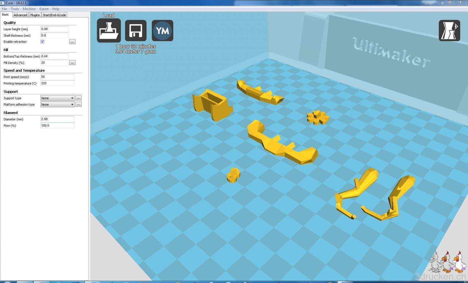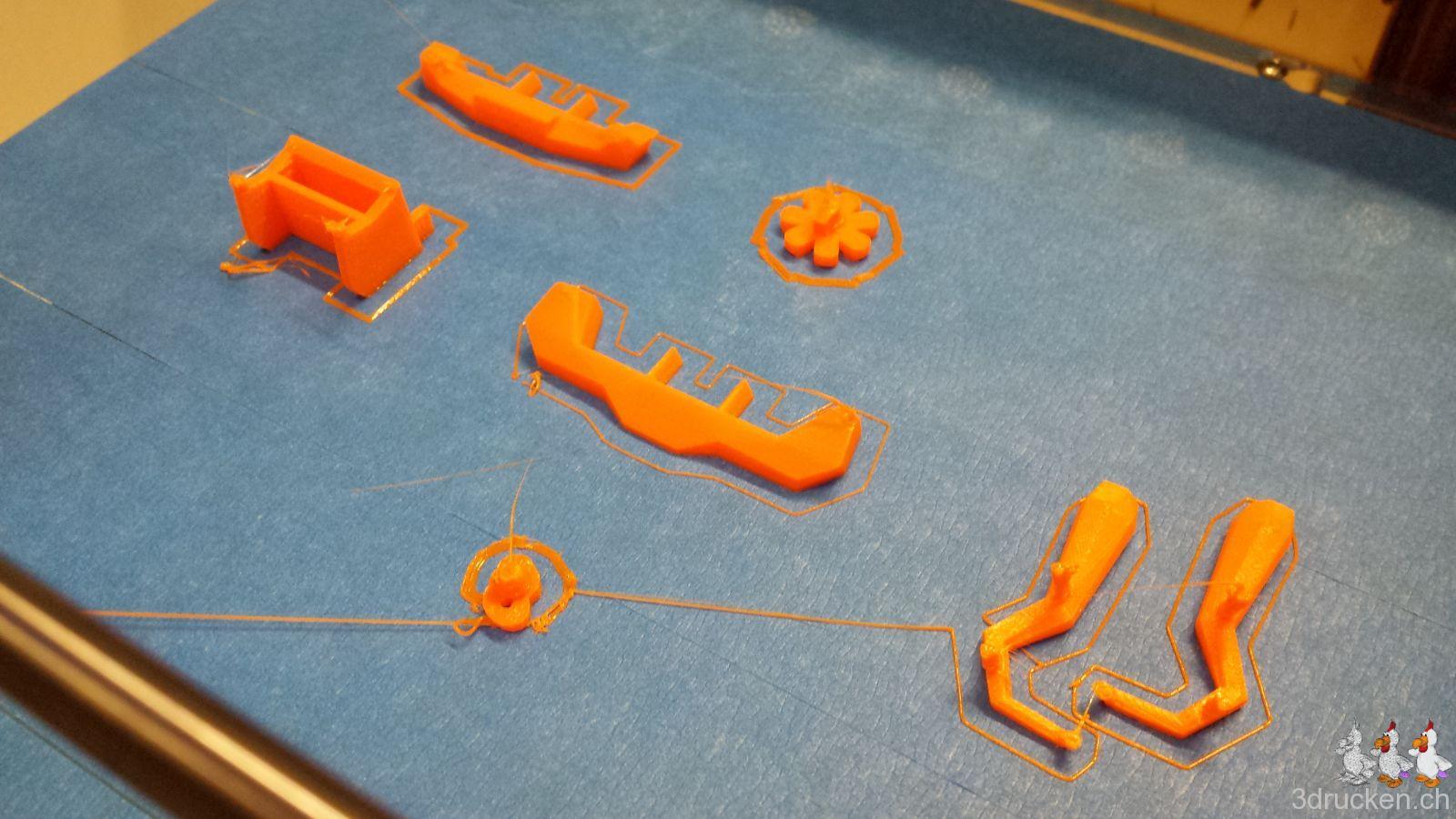Wir haben alle Teile in den beiden Farben unseres Designs jeweils auf einem Tisch angeordnet und mit 0.08 mm Schichten ausgedruckt. Das kleinste Teil haben wir nach dem Druck nicht montiert, da es von der Qualität her nicht ganz optimal gedruckt wurde. Den Rest konnten wir dank den schlau vorgesehenen Steckverbindungen ohne Leim anbringen.
