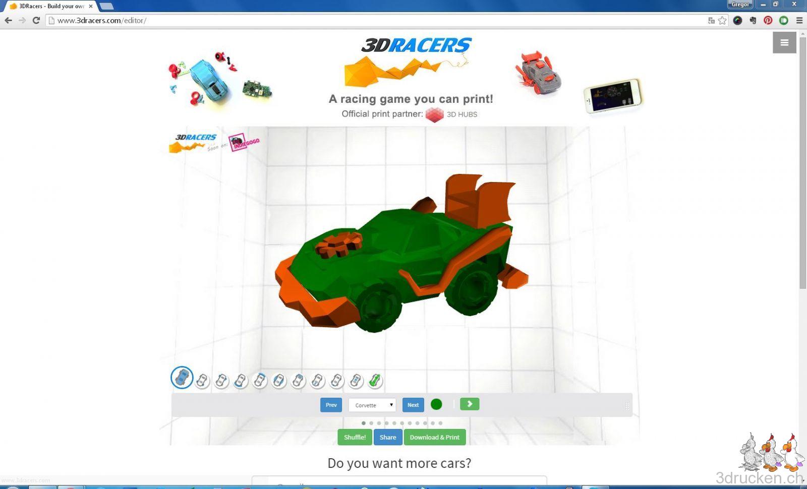 Die Autos lassen sich in einer bereitgestellten Webanwendung an die eigenen Bedürfnisse anpassen, es stehen über 100’000 Kombinationen zur Auswahl, und es werden ständig mehr. Die Bedienung ist intuitiv, und das fertige Modell lässt sich gesondert in Einzelteile einfach herunterladen. Die Einzelteile werden nach Farben sortiert in Unterverzeichnissen angeboten. Nach Angaben der Hersteller ist es trotzdem auch möglich, mit einer anderen Software ein kompatibles Design zu erstellen, und darin die Elektronik unterzubringen.