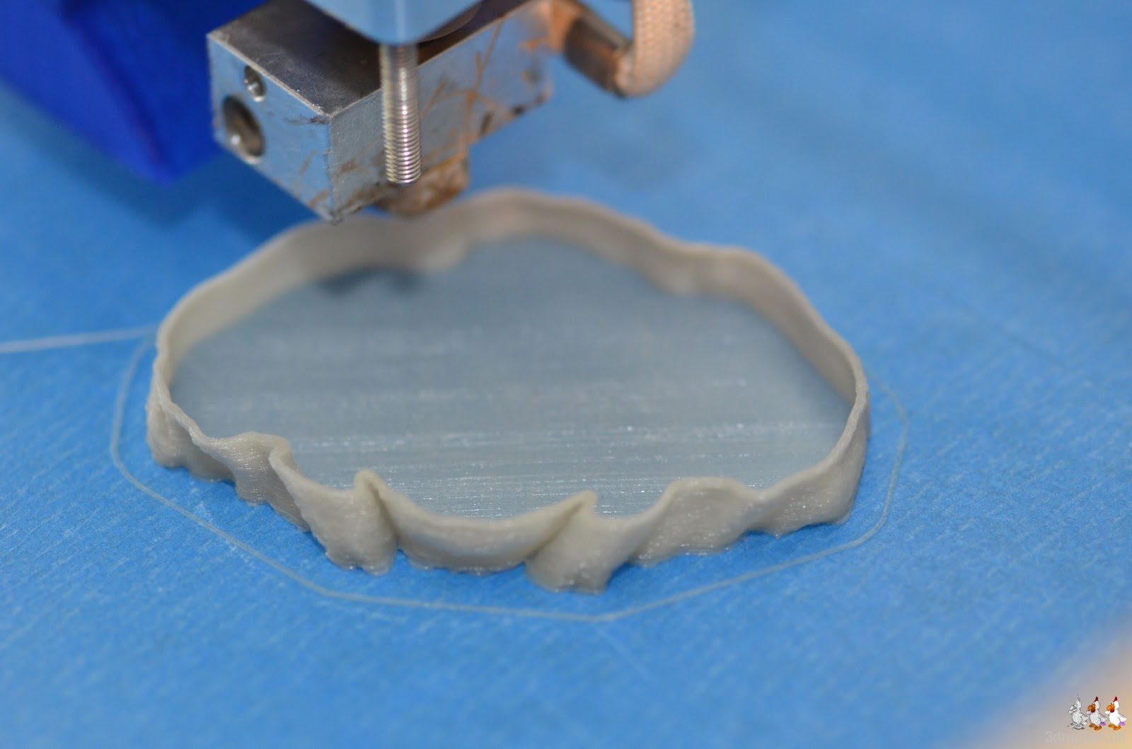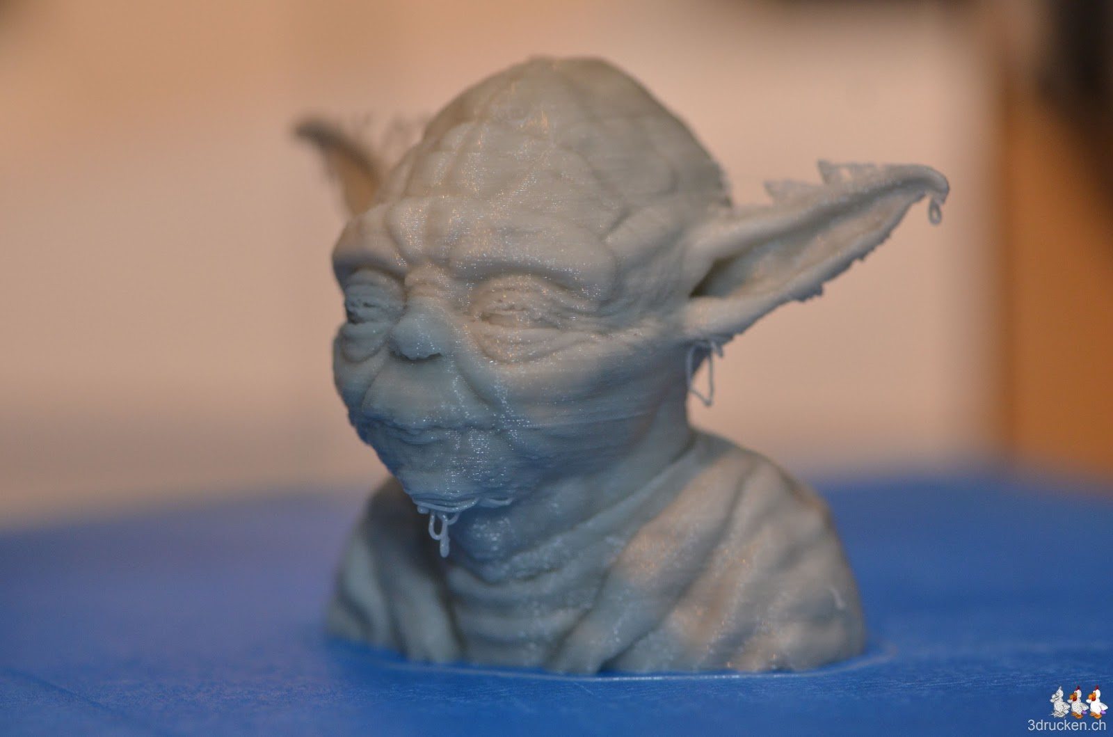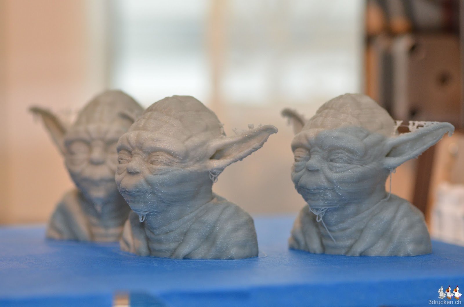 Um die Druckparameter des Fabberworld PLA nachtleuchtend Grün zu ermitteln, haben wir nach über einem Jahr 3D-Drucken zum ersten Mal das Modell des Yoda ausgedruckt. Die Überhänge an Kinn und Ohren weisen einen relativ hohen Schwierigkeitsgrad auf. Wir haben uns von 220° C bis 205° C und 3 mm bis 3.1 mm Durchmesser an die Einstellungen herangetastet. Um Material zu sparen, haben wir alle 4 Yodas mit 0 % Füllung und 0.2 mm Schichten in Cura 13.03 geslicet. Am besten bewährt hat sich dabei die Kombination von 210° C und 3.05 mm Durchmesser.