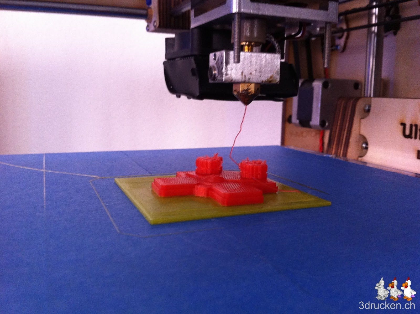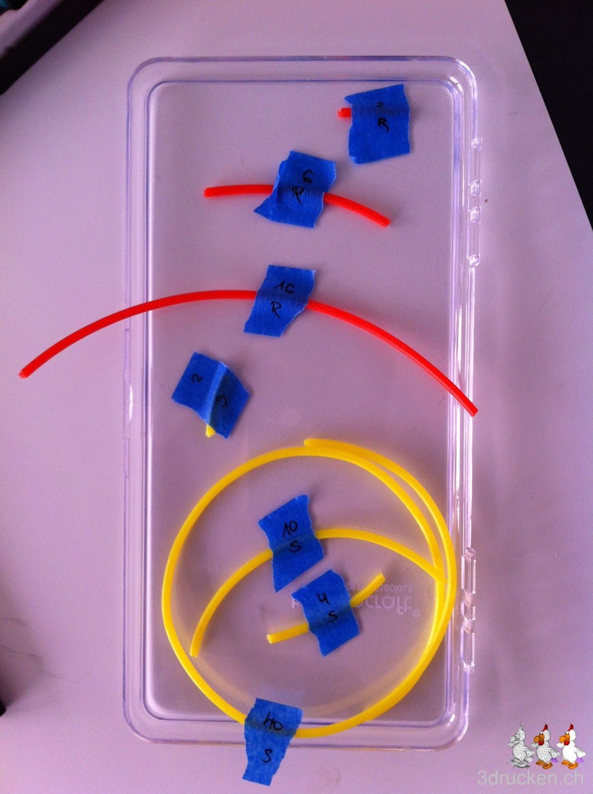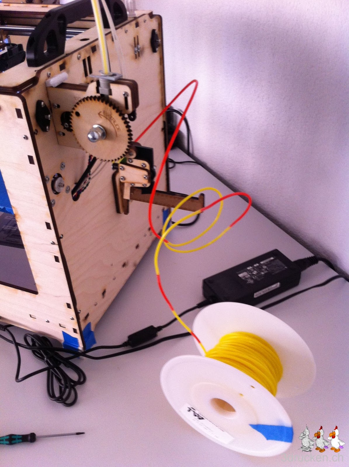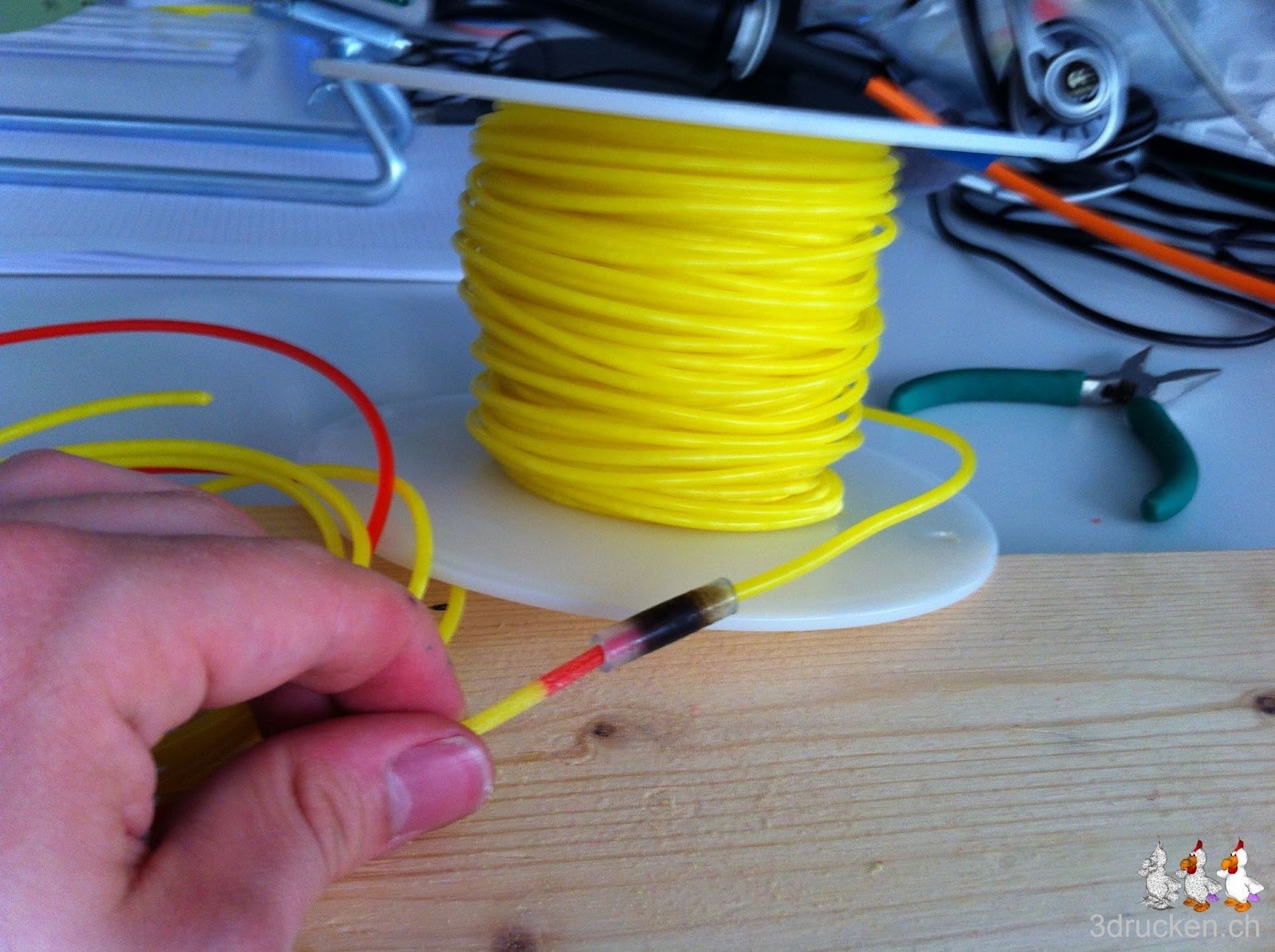 Etwa drei viertel Stunden ging alles gut. Dann aber brach eine Verbindung entzwei. Unglücklicherweise gleich bevor sie im Extruder verschwand. In der Verzweiflung erhitzten wir das zurückgebliebene Stück mit dem Feuerzeug und stiessen es in das Loch nach. Mit Drücken funktionierte das Drucken noch ca. 5 Minuten, danach war Schluss.