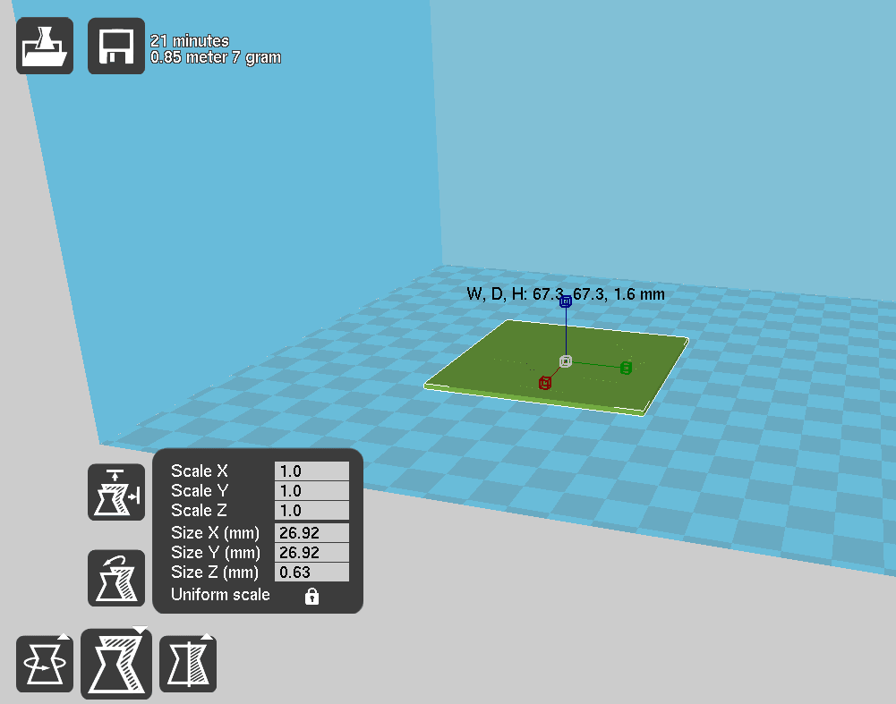 Die einzelnen Teile luden wir nun in Cura und slicten sie alle mit demselben Skalierungsfaktor. So konnten wir die nötige Filament-Länge für die einzelnen Teilstücke ermitteln.