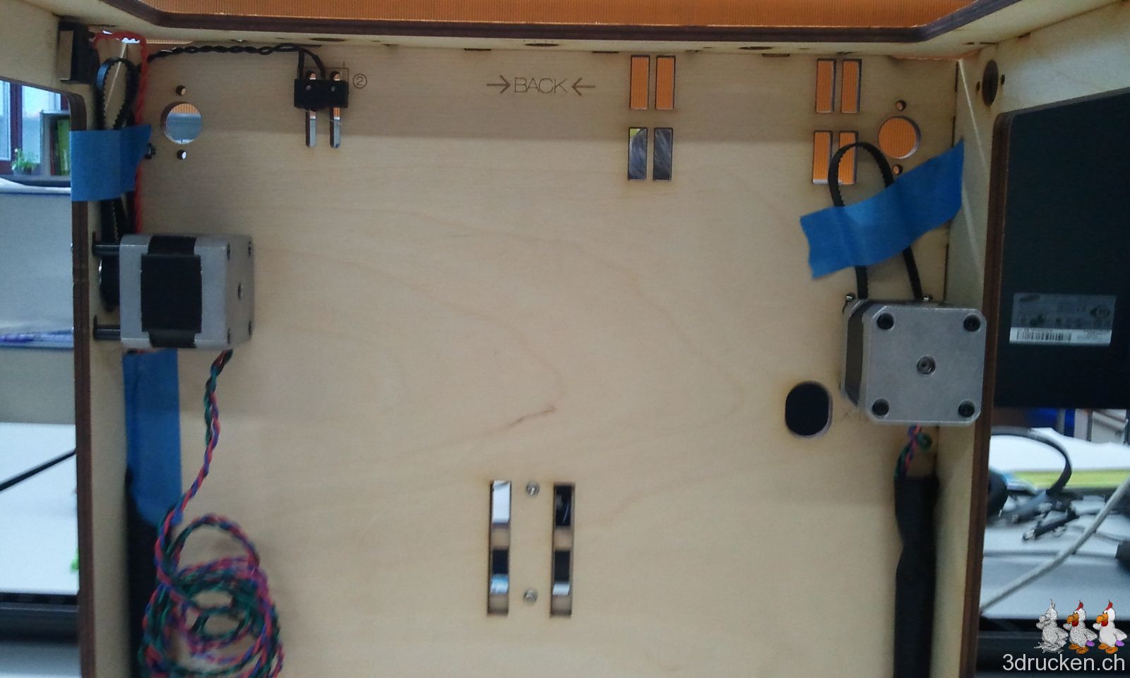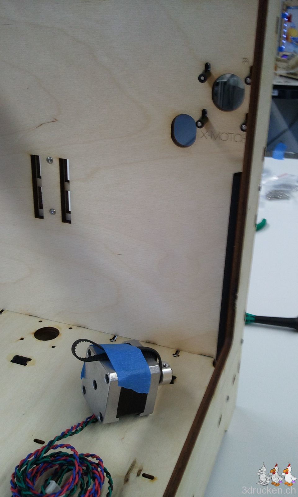 Die Montageschritte 2.1 und 2.2 sind dann auch nicht mehr wirklich logisch, weil man die Plastikdinger nicht gleich festhalten kann, wie die aus Holz. Zusätzlich sollte der komplette Montageschritt umbenannt werden, da neben den Motoren für die X- und Y-Achsen, auch derjenige für die Z-Achse in Schritt 2.3 montiert wird. Für die Montage von X- und Y-Achsen-Motor, haben wir uns wie auf den Fotos beholfen, und nach der Montage das blaue Klebband wieder entfernt.