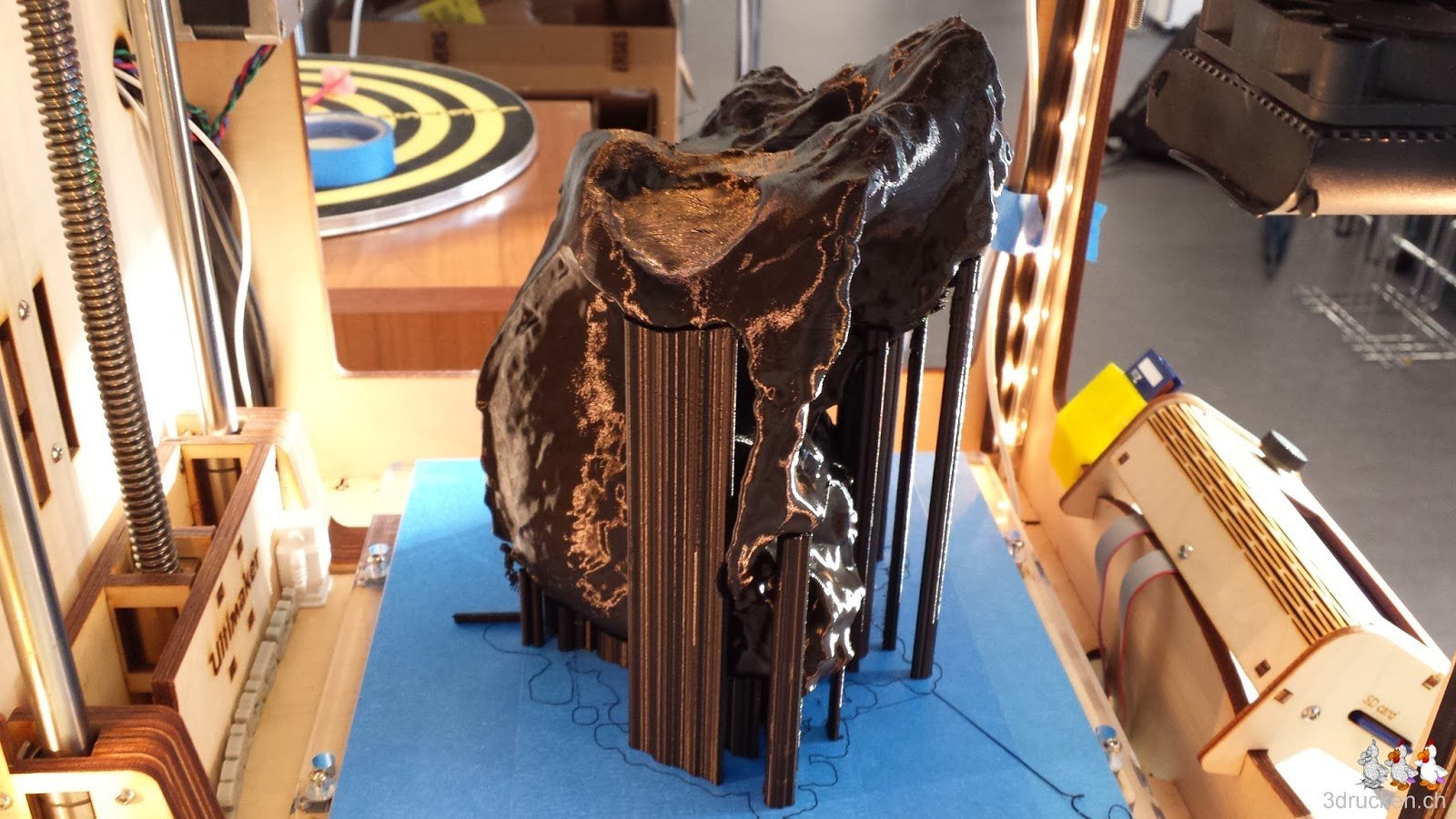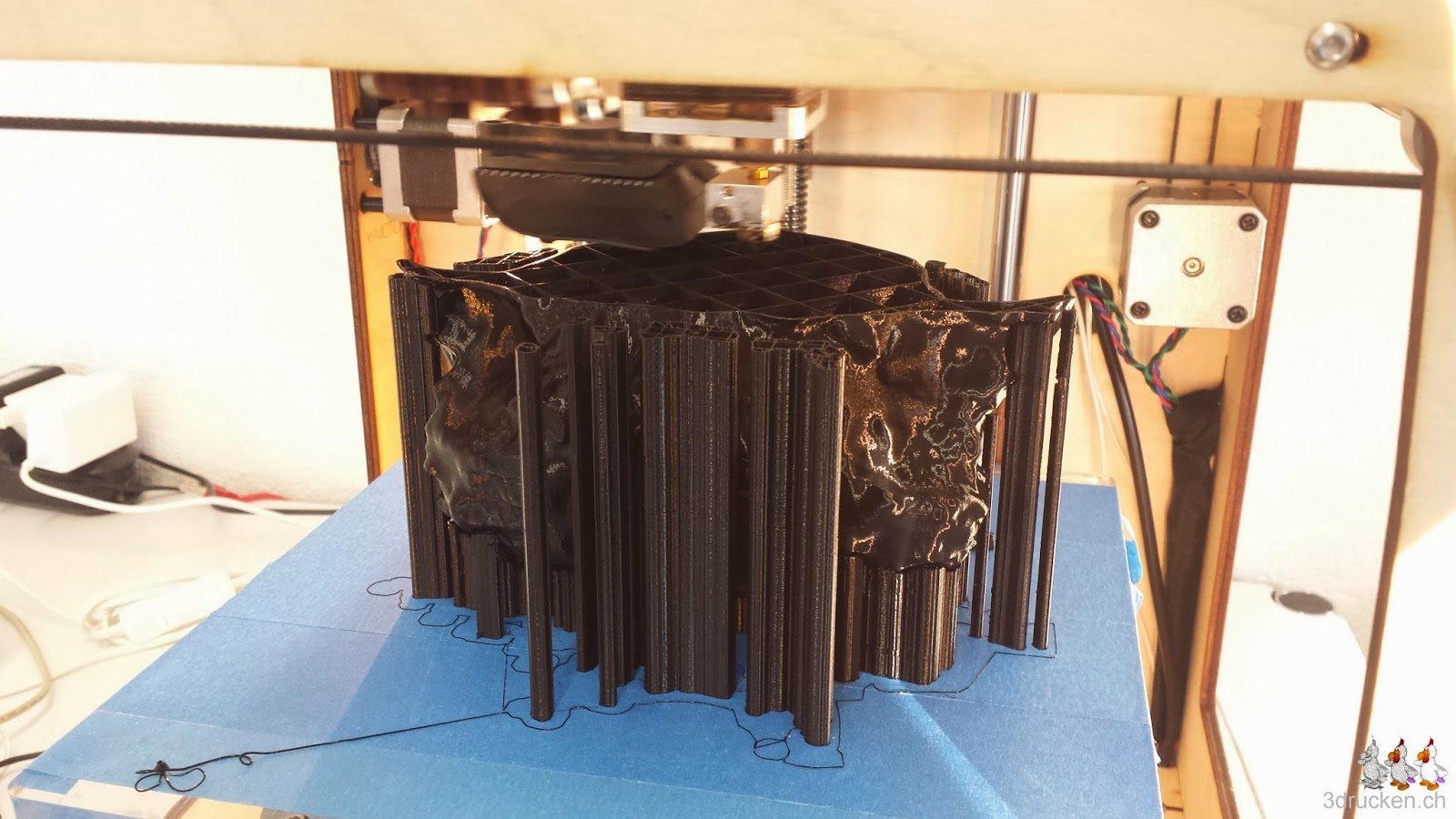 Während des Druckvorgangs lösten sich einige der kleinen Supportstücke vom Tisch und fielen um, bzw. wurden willkürlich von der Druckspitze umhergezogen. Vielleicht könnten wir den Support mit einem zusätzlichen Brim die Haftung des Supports am Tisch festigen. Auch aufgefallen ist uns, dass der Lüfter bei der zweiten Schicht nur mit 25 % Geschwindigkeit bläst. Dies scheint eine weitere Änderung in Cura zu sein.
