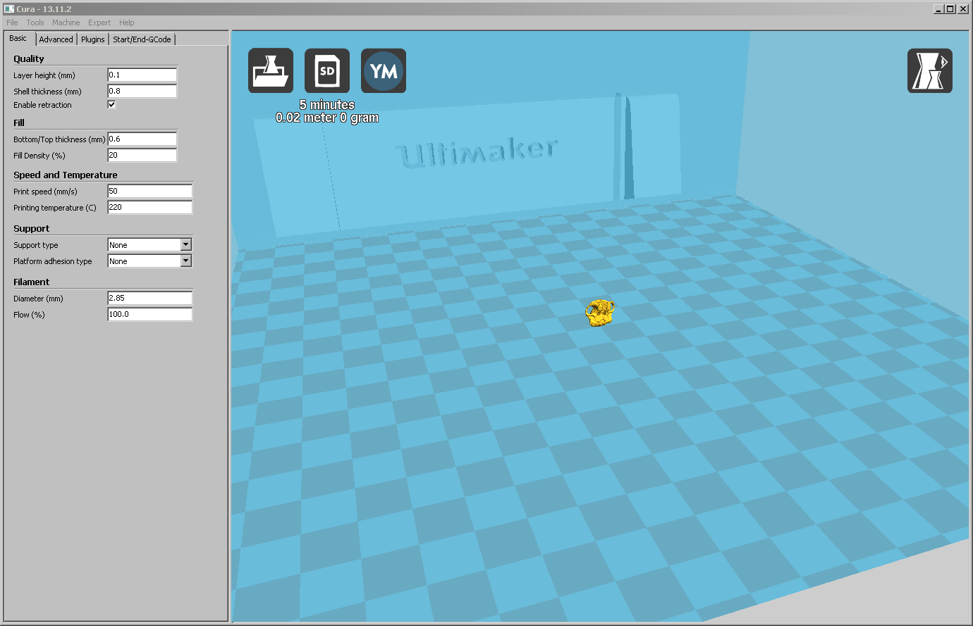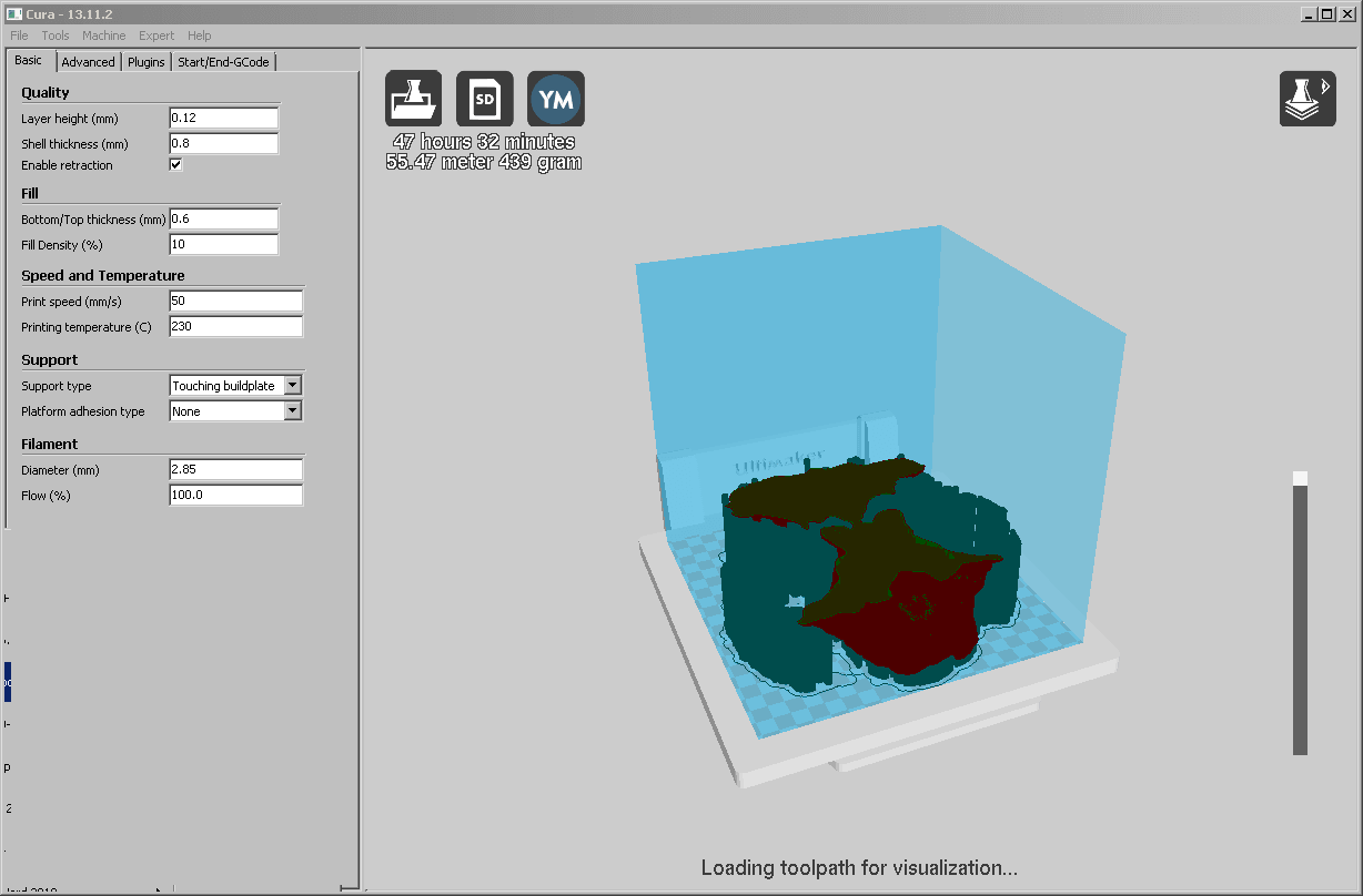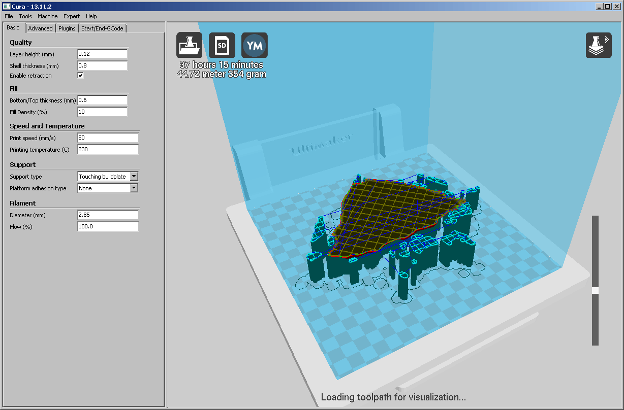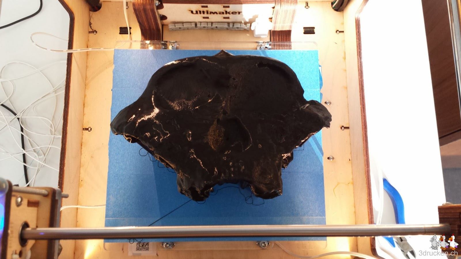 Wir verwenden trotzdem die Version „halbe Grösse“ und verkleinern sie in Cura auf den maximal druckbaren Bereich im Ultimaker. Slicen dauert ganz schön lange, wohl auch wegen dem Touching buildplate Support. Ein Vergleich der Schätzungen zweier Orientierungen für den Druck: