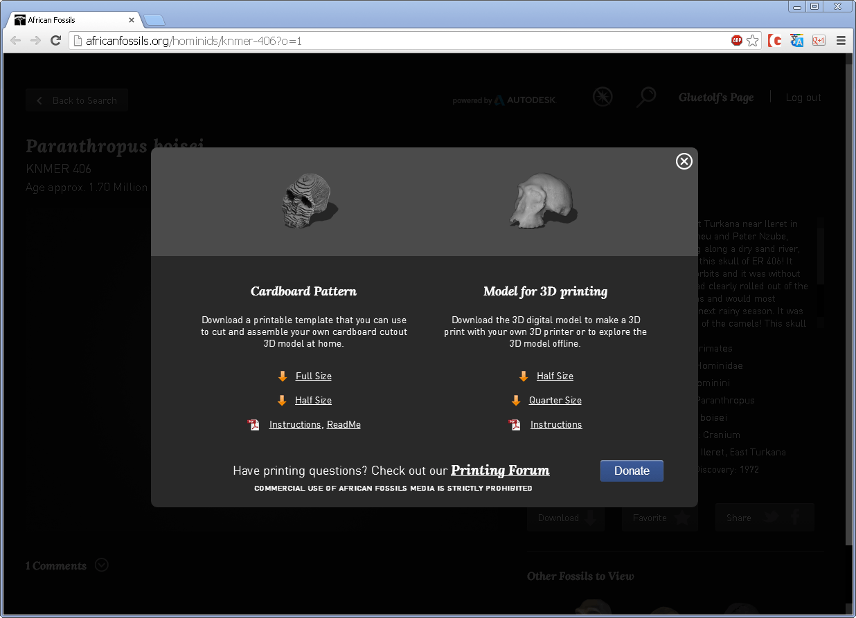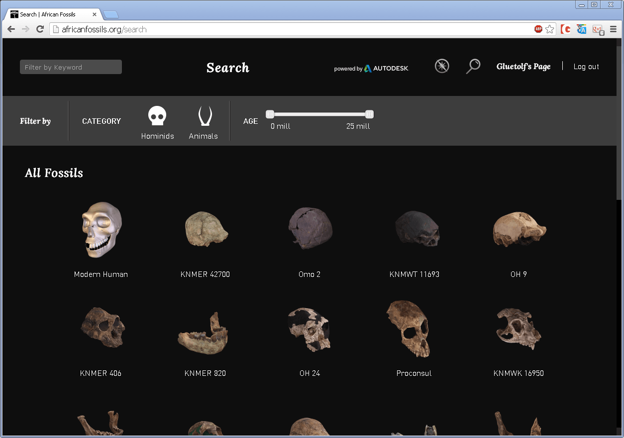 Leider klappte bei uns die obligatorische Registrierung vor dem ersten Download nur via Facebook, und es können wohl nur einige ausgesuchte Modelle heruntergeladen werden. Am einfachsten findet ihr die Übersicht aller Modelle via Suche (Lupe oben rechts auf der Startseite). Make hat sich die Mühe gemacht, und alle Fossilien auf verfügbare Downloads durchsucht: http://makezine.com/2013/11/23/replicating-ancient-african-hominoid-fossils/