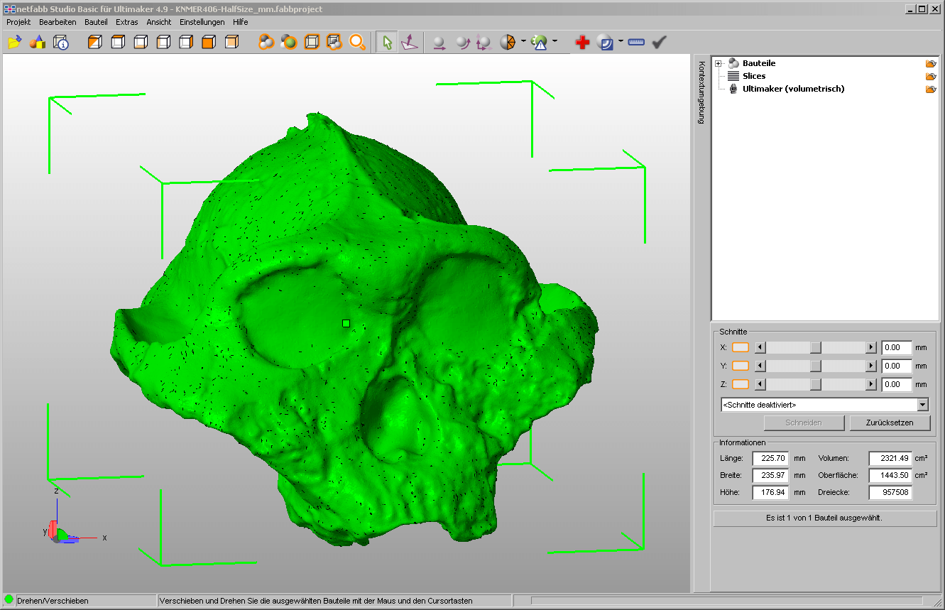 Wir drucken uns also unser eigenes Replikat eines Fossils und wählen dazu den Paranthropus boisei – KNMER 406, ungefähr 1.70 Millionen Jahre alt. Die Daten sind als Schichtmodell oder als komplettes 3D-Modell verfügbar.