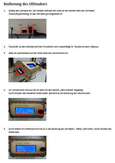 Für das bevorstehende Schulprojekt (Zielgruppe: 8. Klasse) haben wir eine kurze und einfache Anleitung zum Ausdrucken eines Objekts auf dem Ultimakers geschrieben.