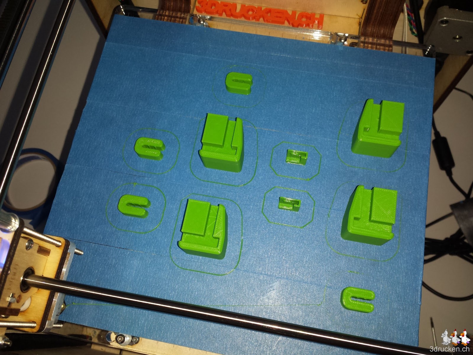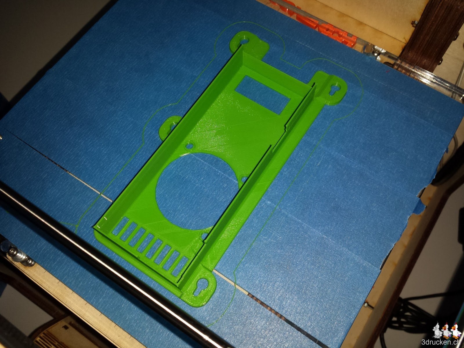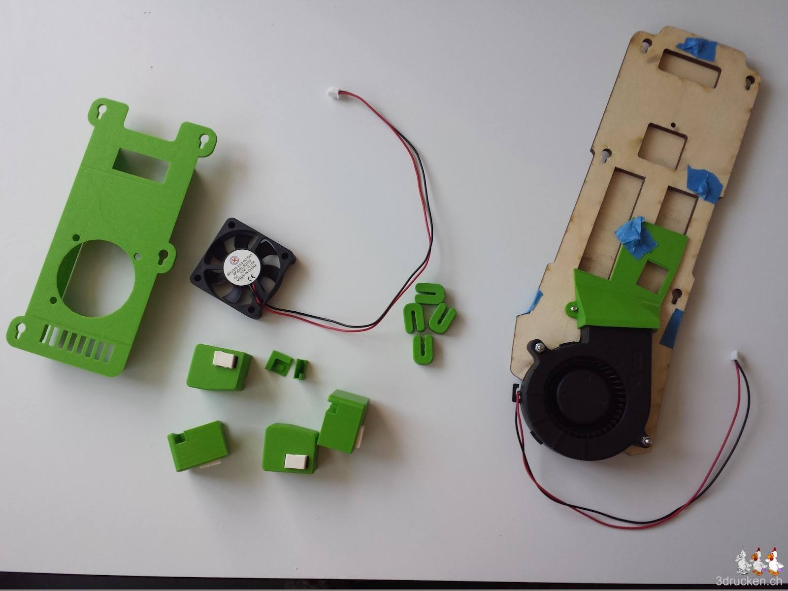 Beim Gehäuse mussten wir an einer Ecke mit dem Seitenschneider eine Modifikation anbringen. Die Füsse haben wir mit Stücken eines alten Radiergummis versehen, anstatt mit den dafür vorgesehenen Fingern, welche leider zu dick gedruckt wurden.