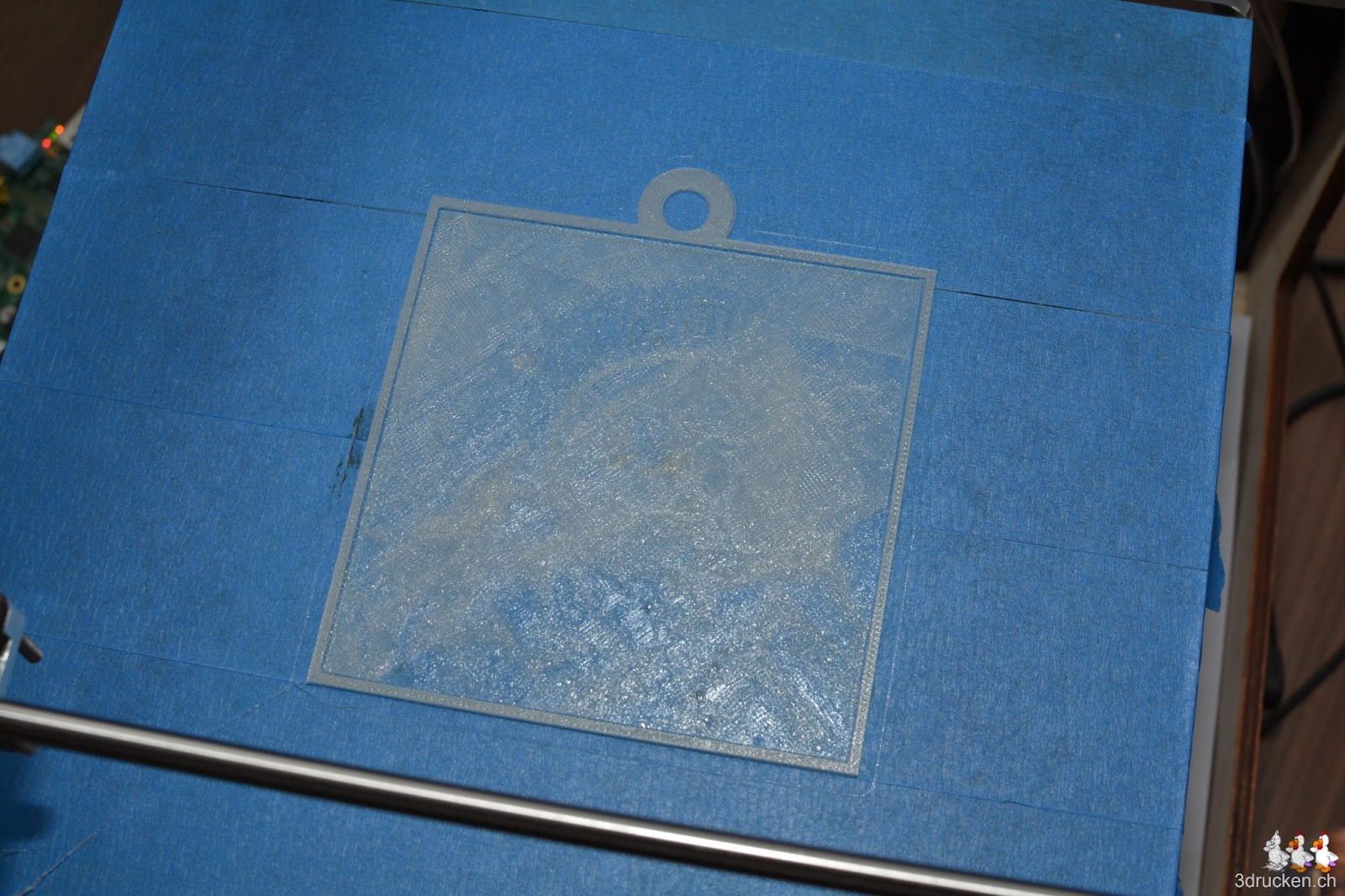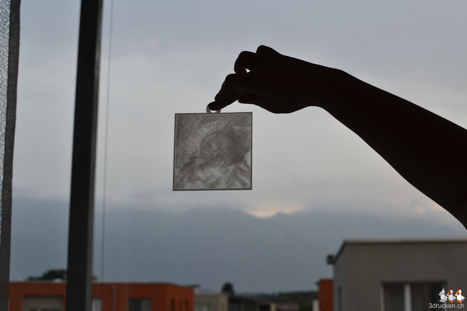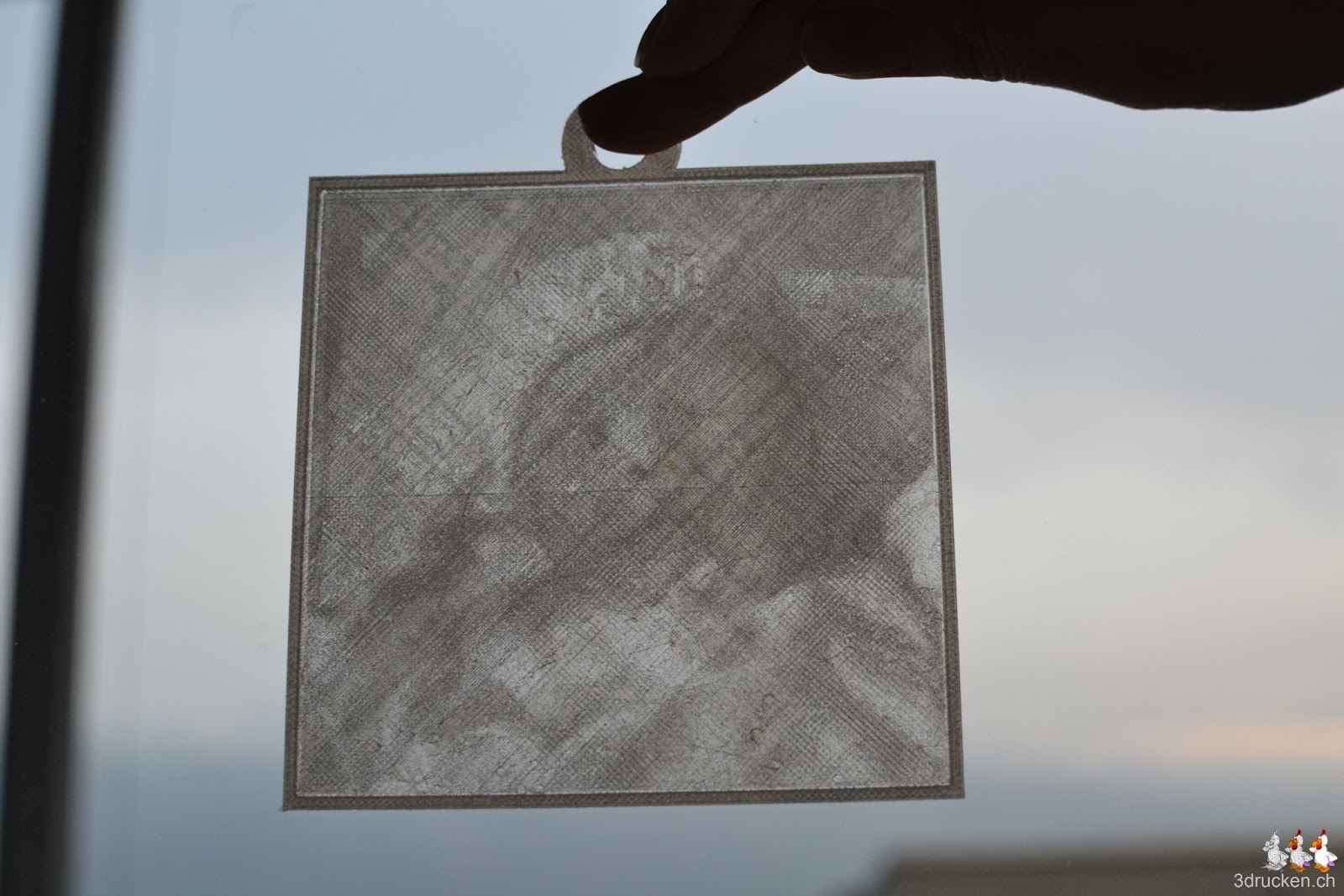 Nicht möglich dachten wir uns, als wir die Anpassbare Lithophanie auf Thingiverse gesehen haben. Erst nach einem Post auf Google+ schauten wir uns das ganze mal näher an. Wir verwenden 20x 0.06 mm Schichten, und haben ein Bild von Amélie mit Seitenverhältnis 1:1 und optimiertem Kontrast vorbereitet. Gedruckt mit transparentem Orbi-Tech PLA. Wichtig sind beim Slicen die Einstellungen 1 Shell und 100 % Füllung. Auf dem Drucktisch sieht das Resultat bescheiden aus.