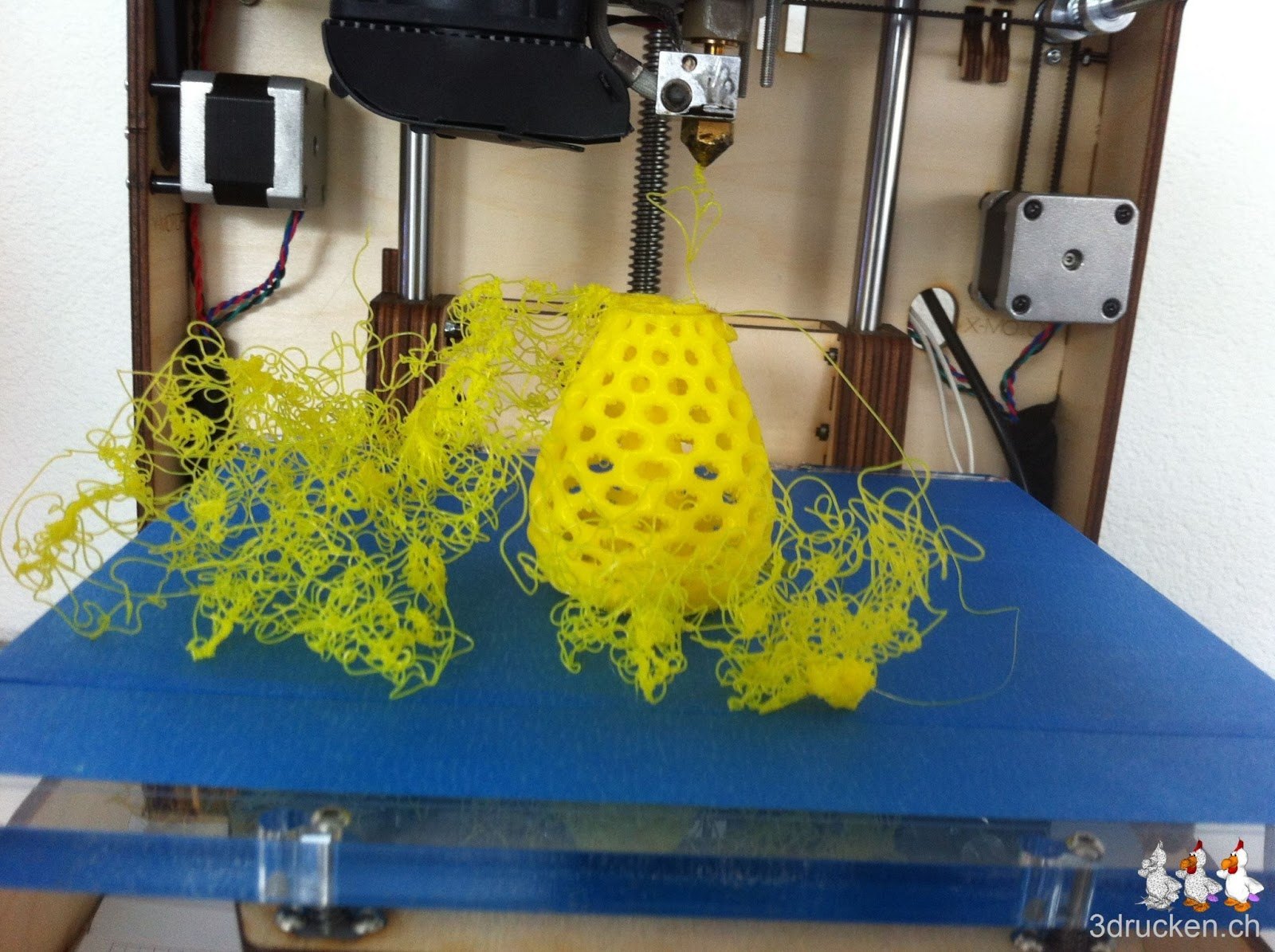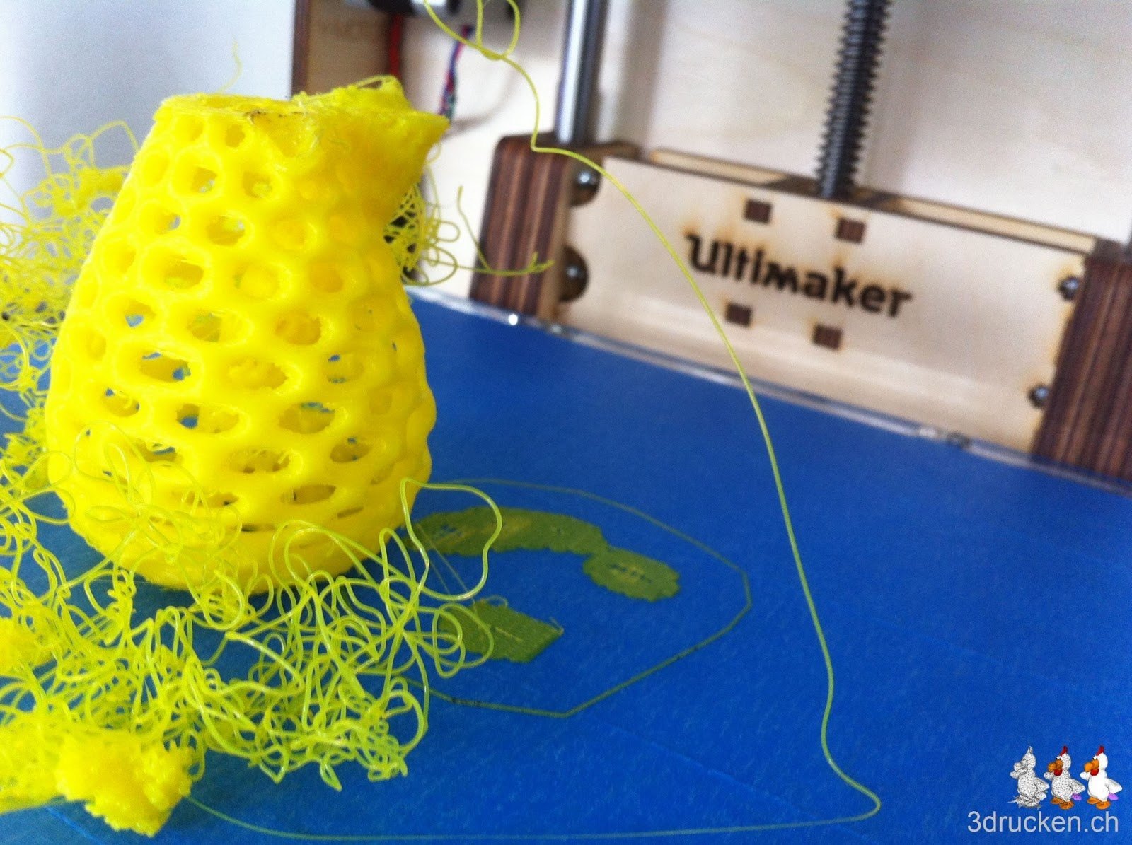 Nach einigen hilfreichen Tipps von Florian Horsch begannen wir das Objekt noch einmal zu drucken. Als wir aus dem Mittag kamen, hatte sich das Modell trotz Raft vom Drucktisch gelöst.
