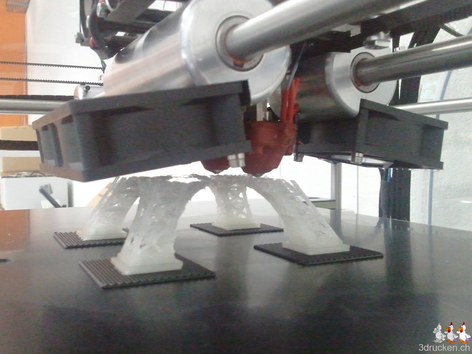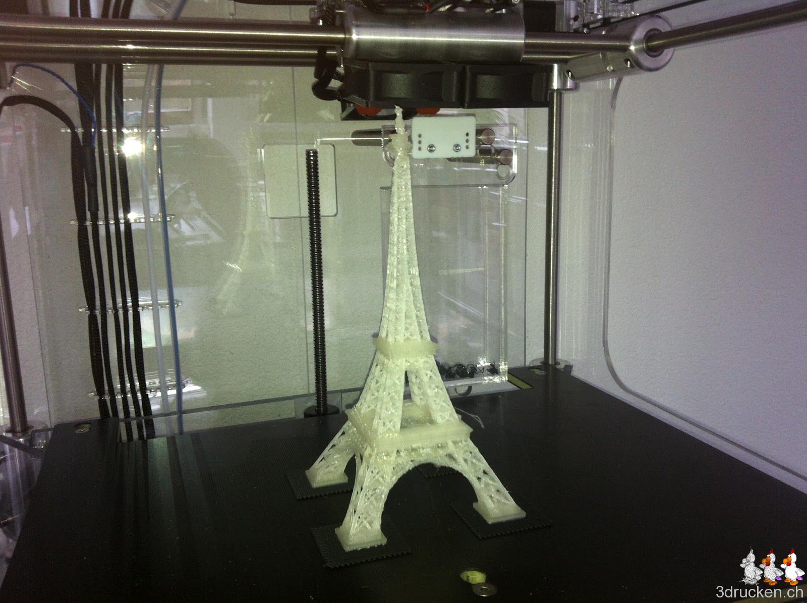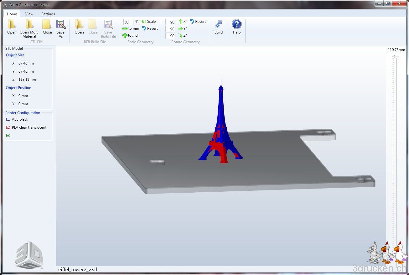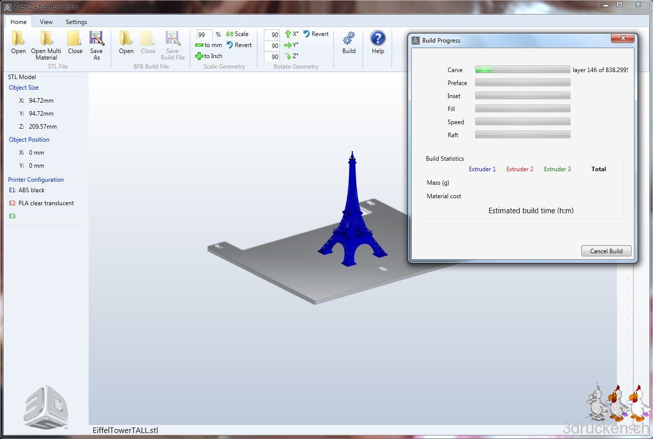 Ich sehe schon, so ganz einfach ist das nicht. Habs gerade mit dem Programm netfabb Studio Basic 4.9 versucht. Die Software scheint ziemlich umfangreich zu sein. Allerdings kommt eine Modell-Reparatur wohl nie so gut, wie von Anfang an mit einem guten Modell zu starten. Ok, ich versuchs erst noch mit dem KISSlicer, bevor ich auf das andere Modell ausweiche. Die Settings des KISSlicer sind aber zur Zeit noch eine zu hohe Hürde. So wechsle ich auf das alternative Modell und verwende wieder Axon 2 zum Slicen. Noch ein Versuch mit einem dritten Modell: http://www.thingiverse.com/thing:24068, sieht bisher gut aus. Und wow! das Original auf http://grabcad.com/library/eiffel-tower sieht wirklich genial aus.