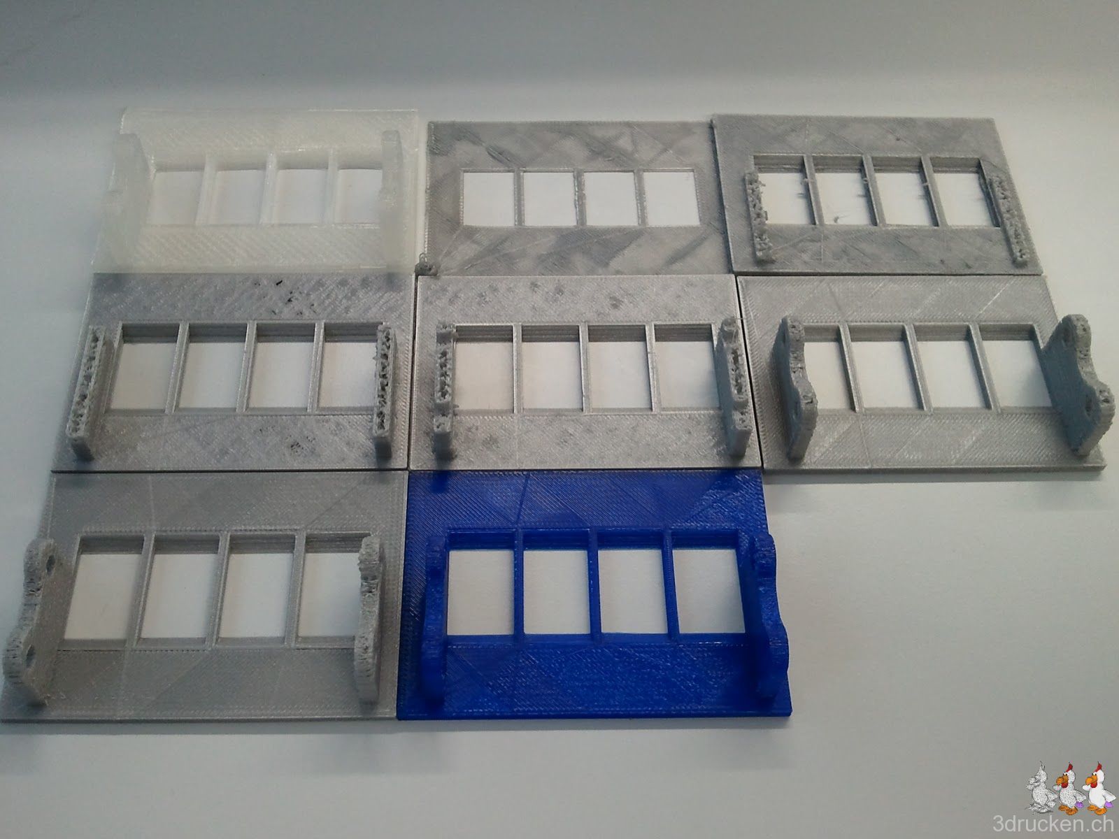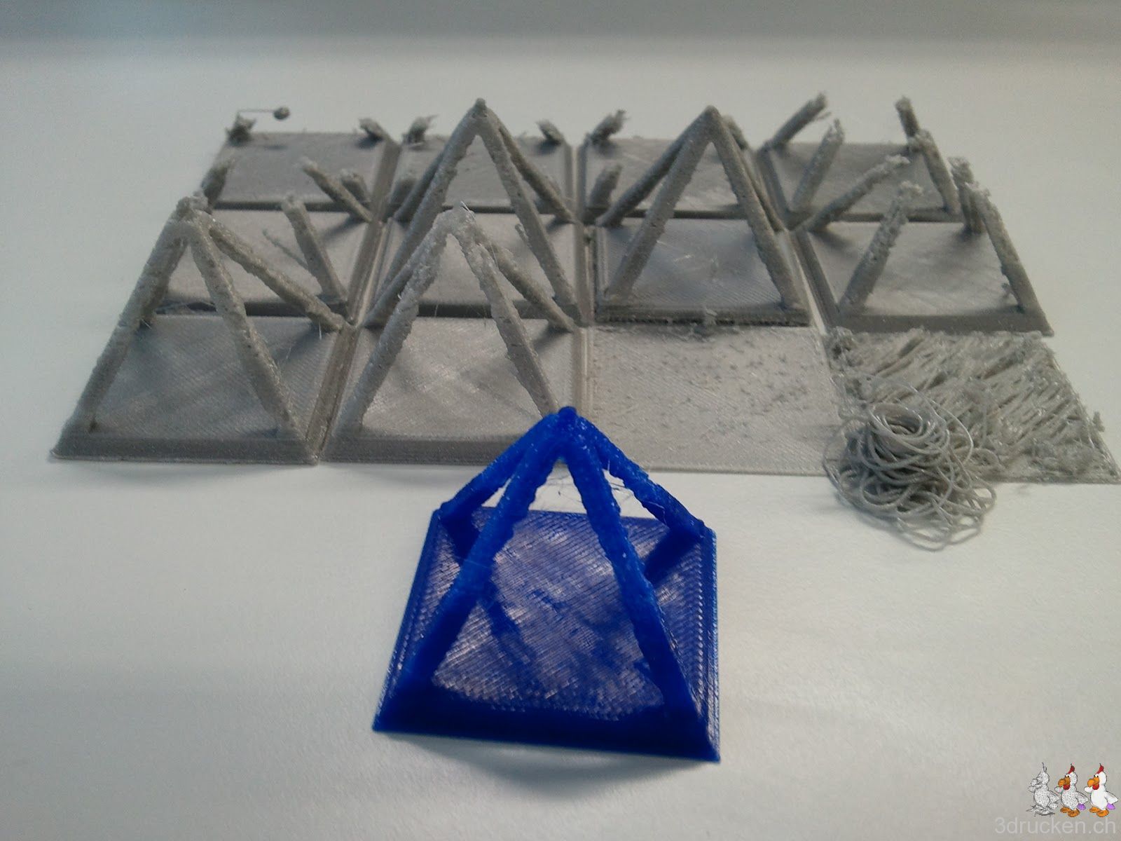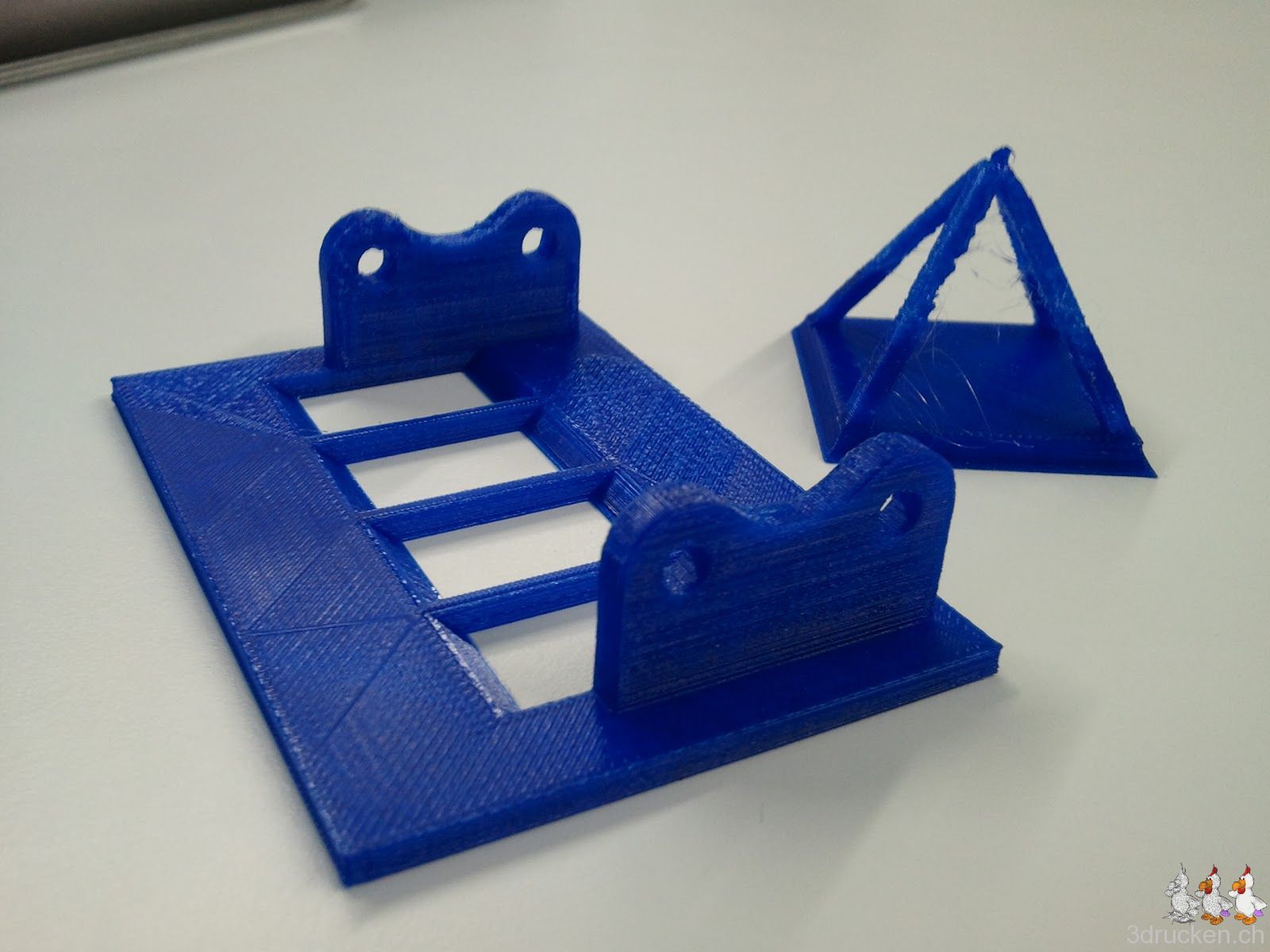 Mit dem blauen Filament von Ultimaker funktioniert der Extruder-Mechanismus offenbar bisschen besser, das Material scheint uns etwas härter zu sein als das silberne. Wir haben gerade eine Kalibrier-Pyramide und die Grundplatte des Zählers in 0.2 mm bzw. 0.1 mm Schichten gedruckt. Zugegeben, bei der Grundplatte haben wir schon bisschen nachgearbeitet.