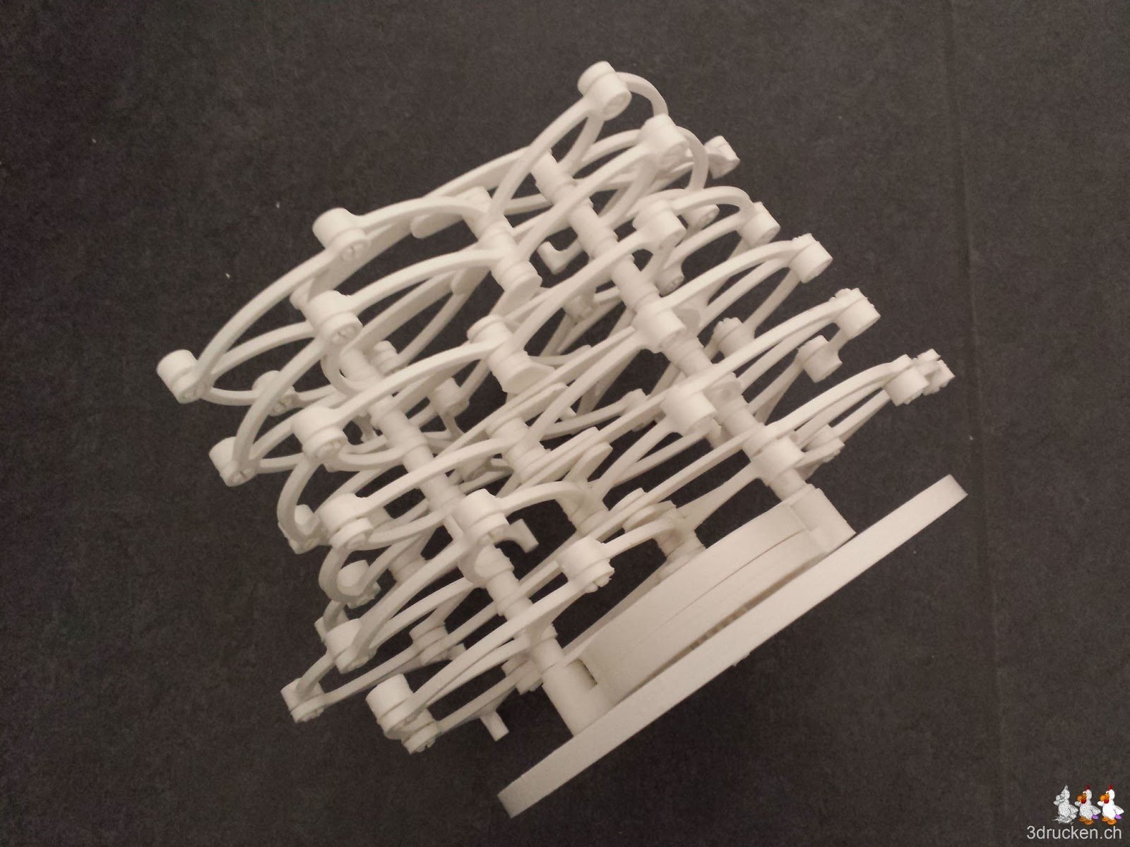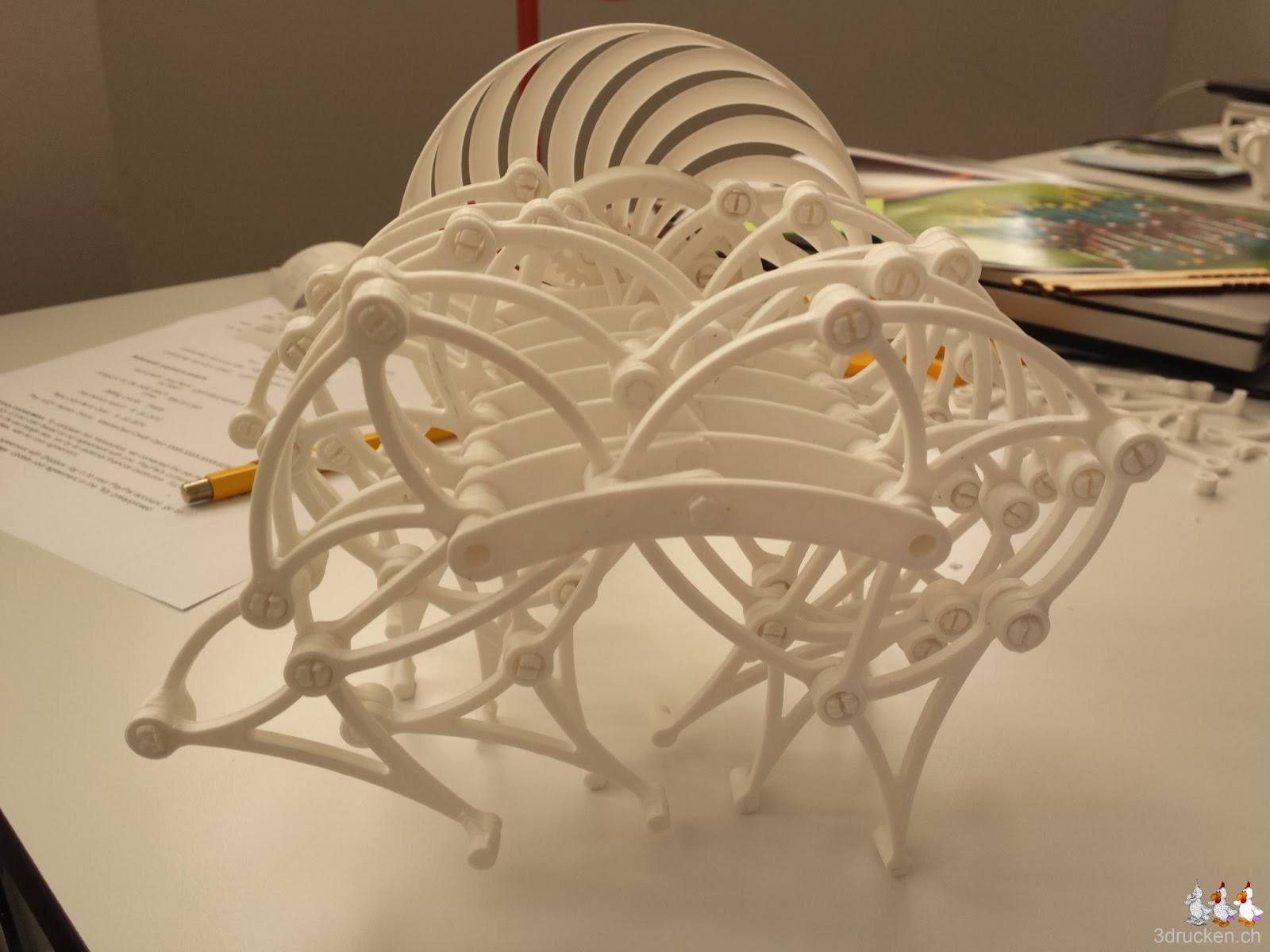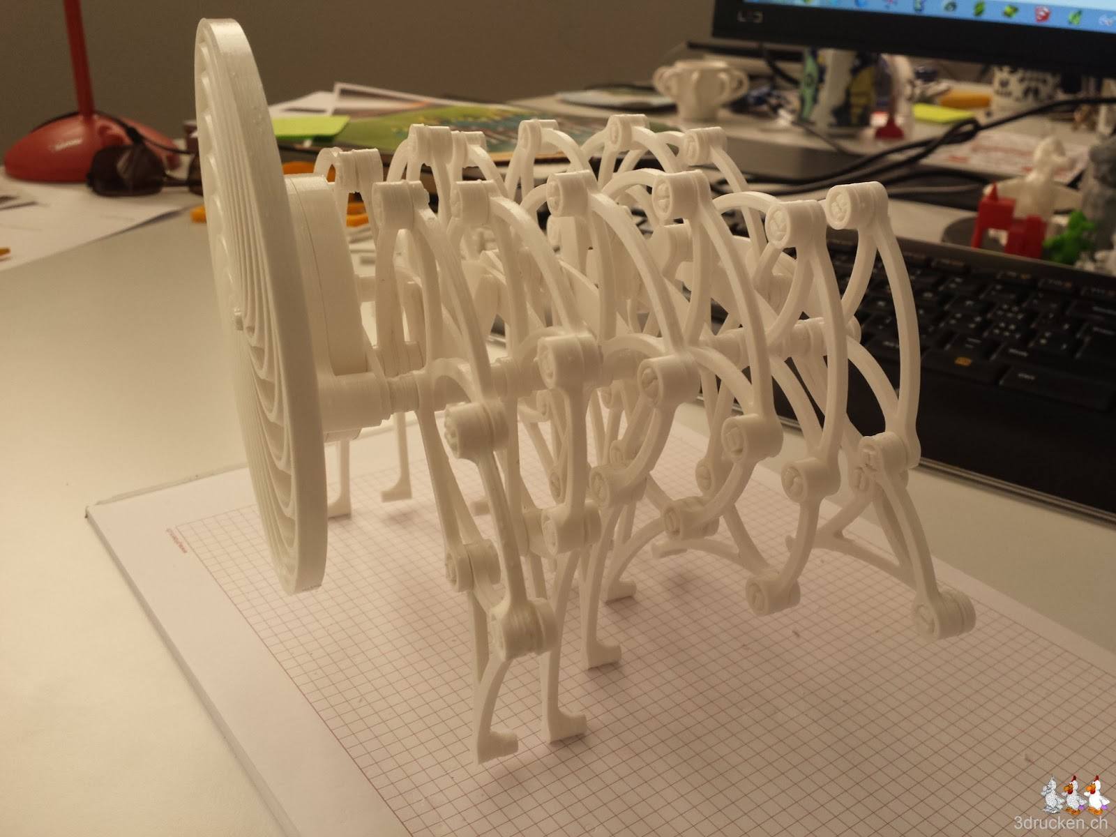 Angelehnt an Theo Jansen’s Strandbeest ist das Modell des Brabeast von Gyrobot auf Thingiverse entstanden. Wir haben 6x die Platte für die Beine und einmal die Platte mit dem Abschlussstück gedruckt. Der Zusammenbau war ziemlich anspruchsvoll, und wir haben mehrfach Teile demontiert und Sachen erneut gedruckt, die beim Montieren kaputt gingen. Der finale Test ob das Ding auch selbständig marschiert steht noch aus.