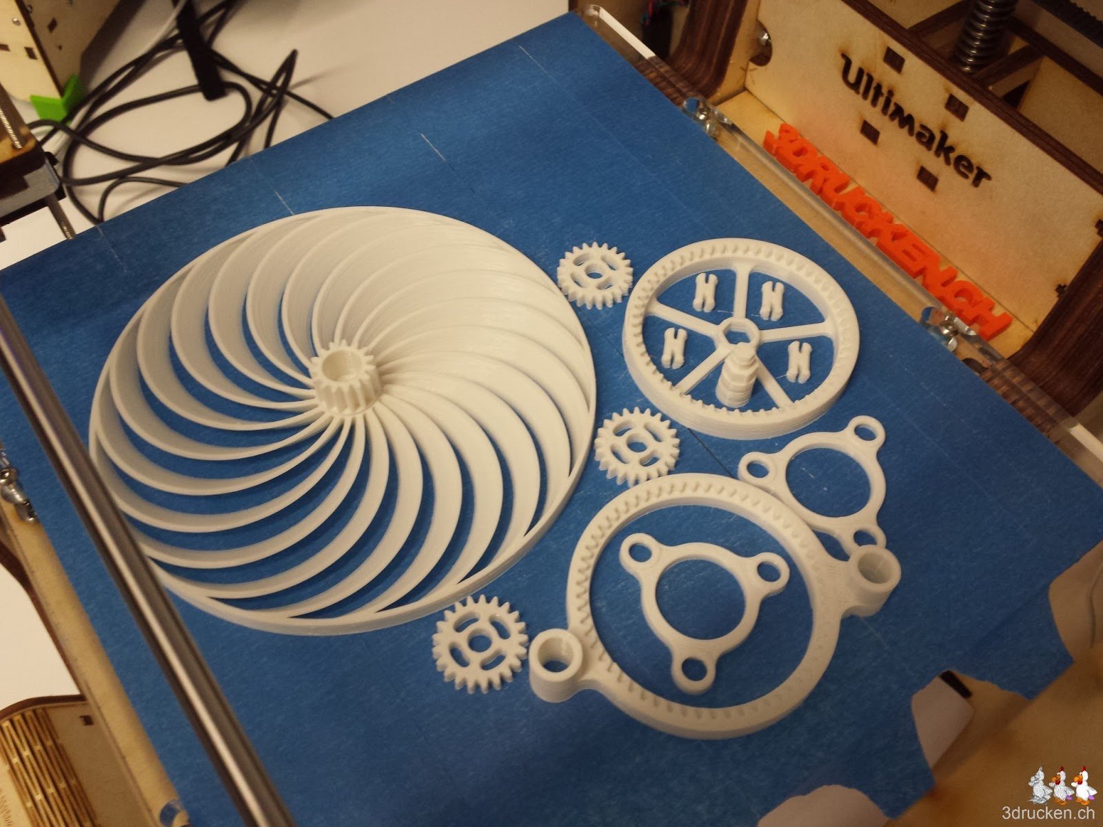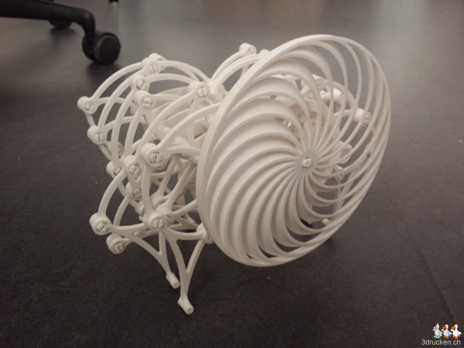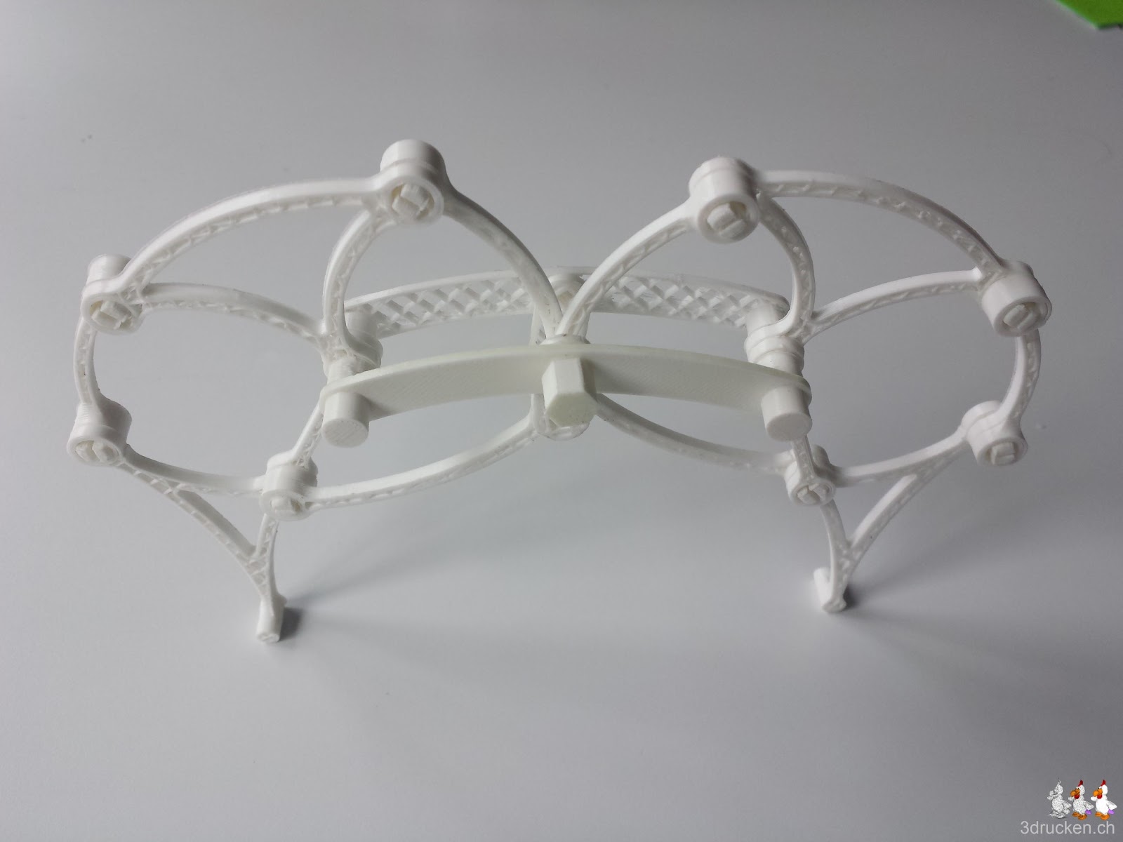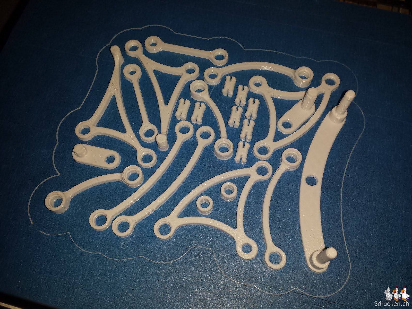 Angelehnt an Theo Jansen’s Strandbeest ist das Modell des Brabeast von Gyrobot auf Thingiverse entstanden. Wir haben 6x die Platte für die Beine und einmal die Platte mit dem Abschlussstück gedruckt. Der Zusammenbau war ziemlich anspruchsvoll, und wir haben mehrfach Teile demontiert und Sachen erneut gedruckt, die beim Montieren kaputt gingen. Der finale Test ob das Ding auch selbständig marschiert steht noch aus.